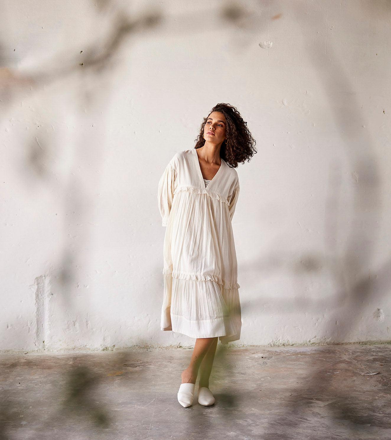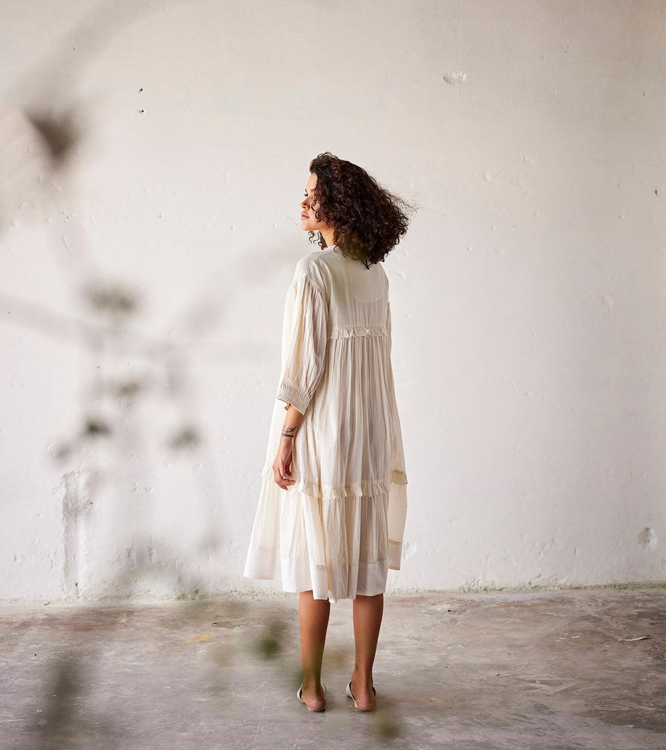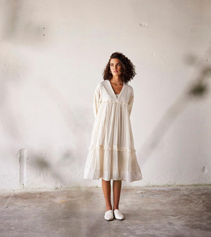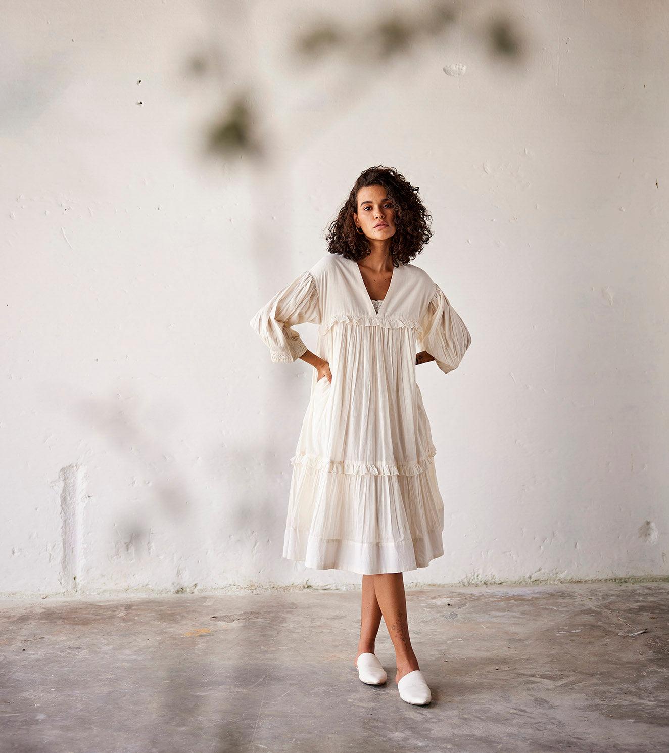An off-white mul midi dress with tiered ruffle detailing. The puff sleeves has pin tucks detailing that completes the look.