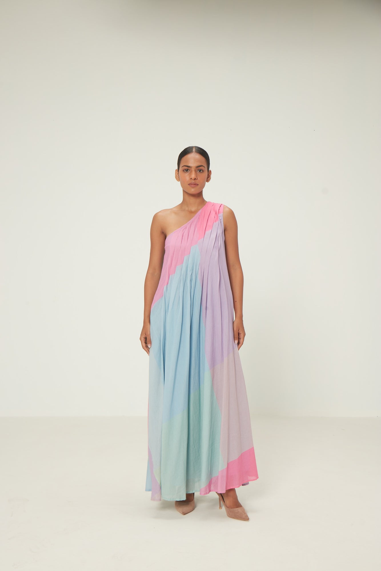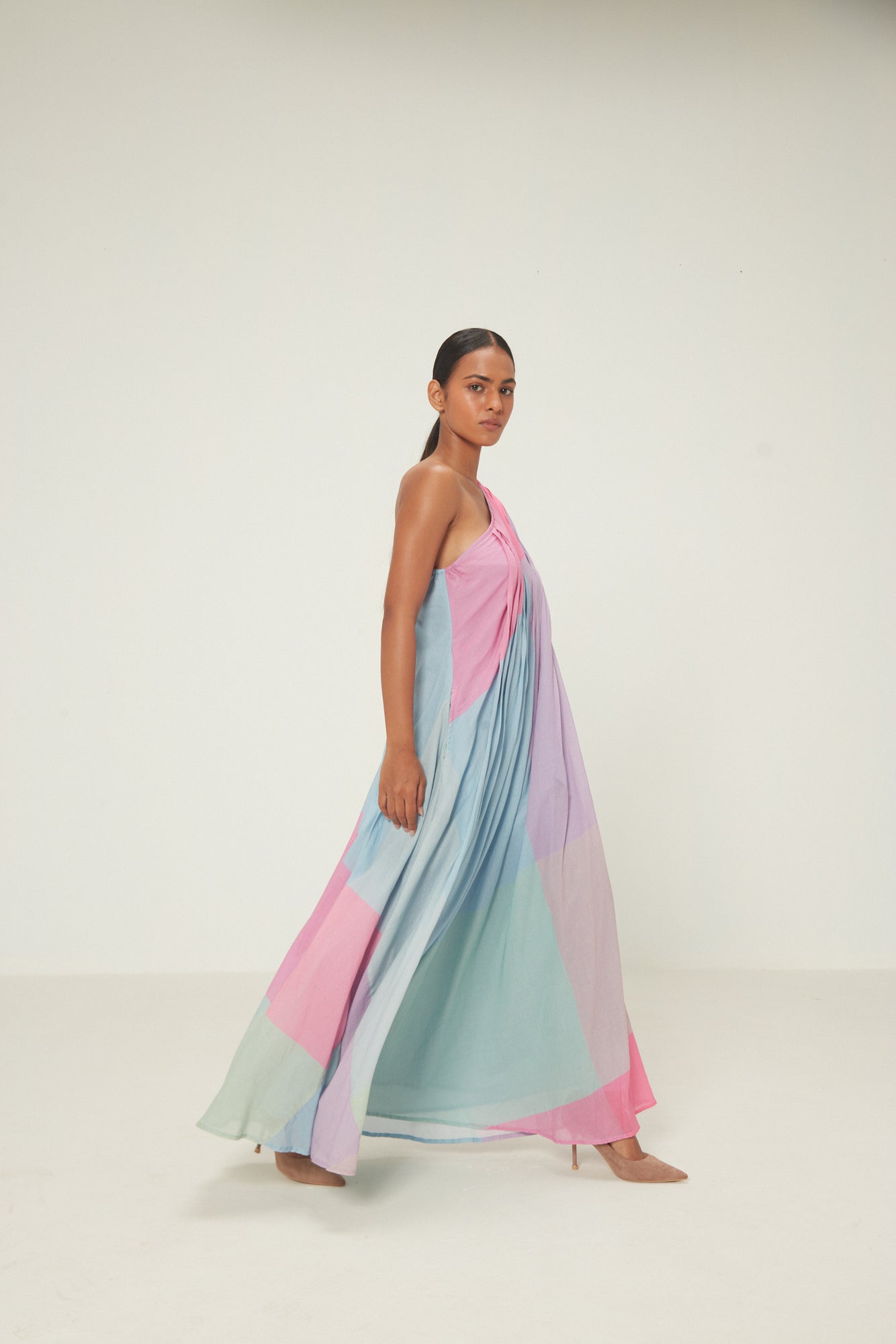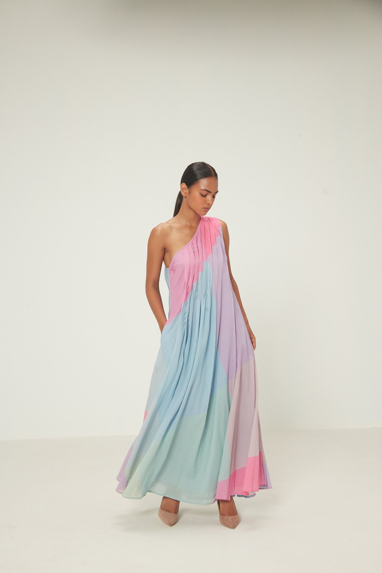 A one-shoulder maxi dress in lightweight cotton mul, designed with color-block panels in sweet candy tones. The pleated neckline adds structure while the fluid, flared silhouette moves with ease. Finished with side pockets, this dress blends statement style with everyday comfort - ideal for both day wear and evening outings.
