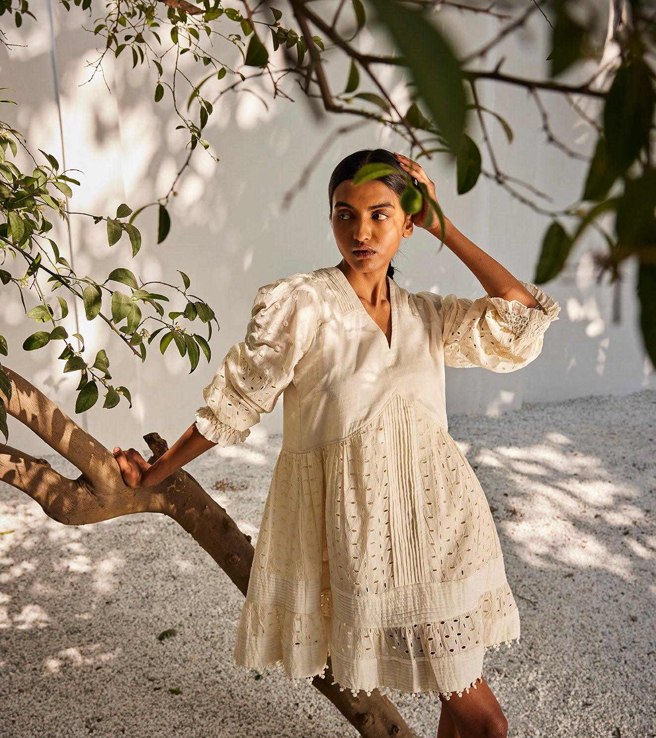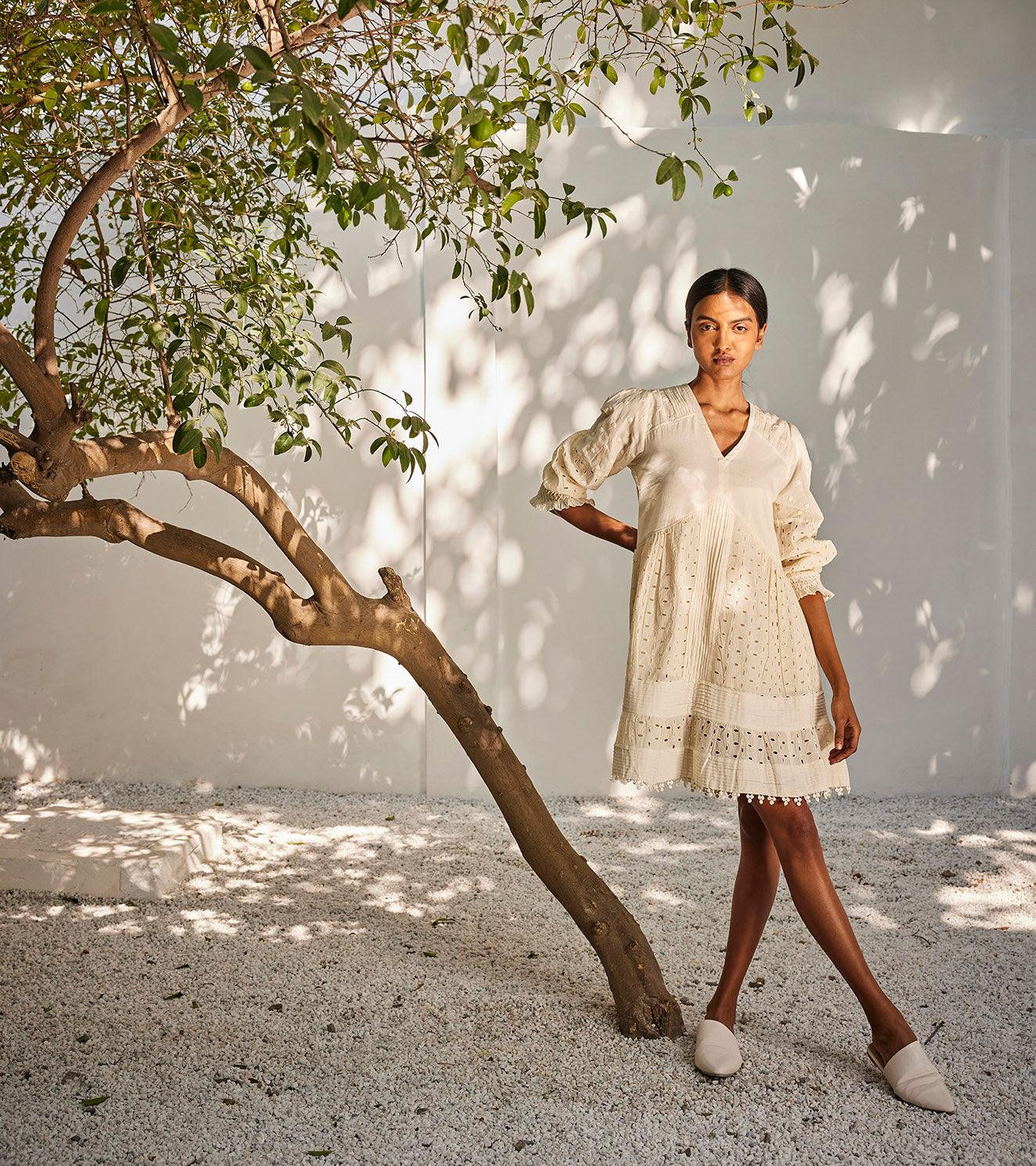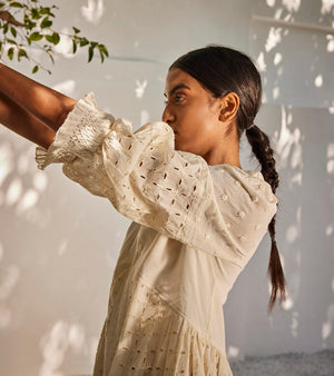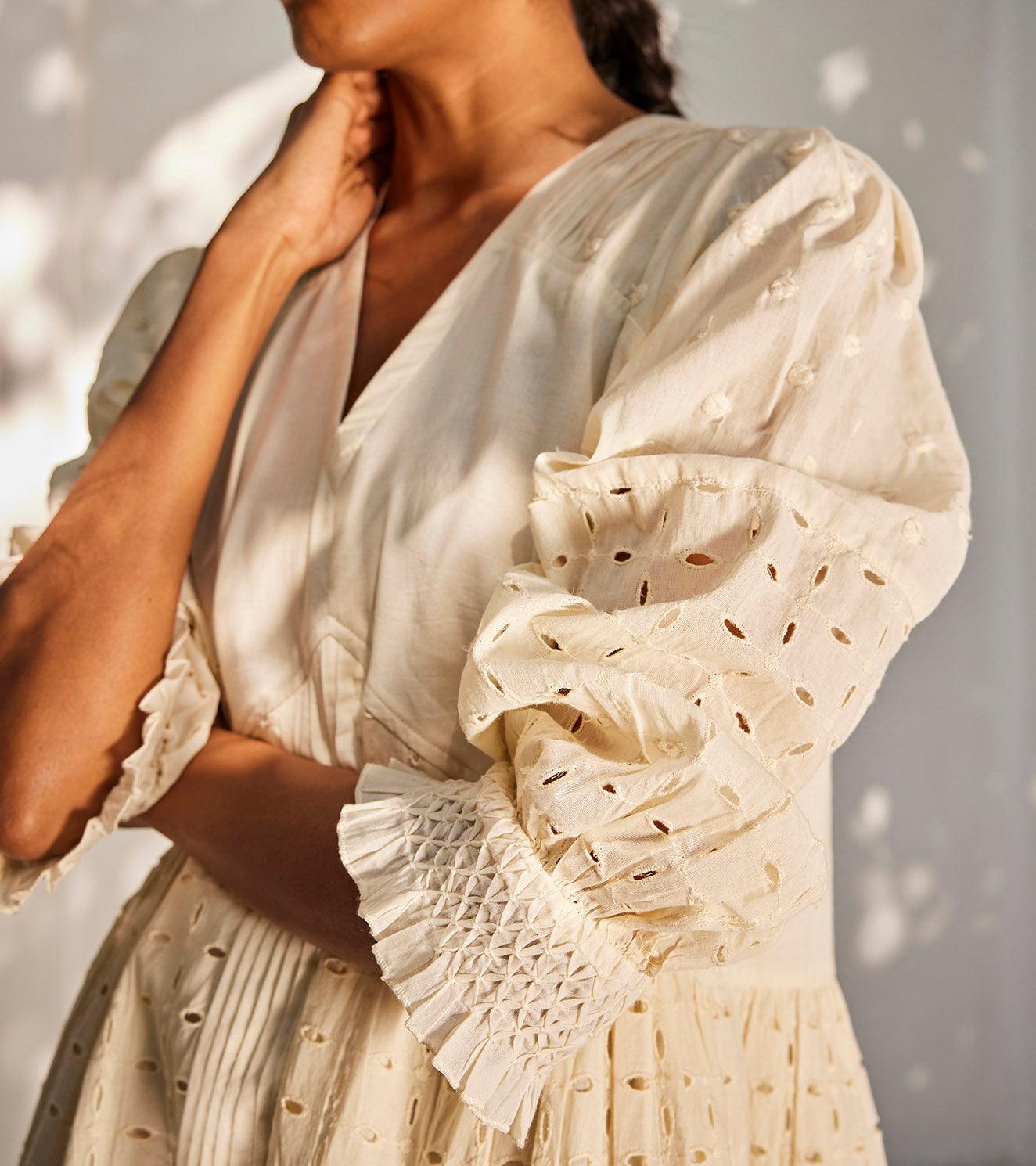 An off-white schiffli cotton dress with pin tucks at the neckline and the center front. The dress comes with smocking at the sleeves and lacework along the hemline.