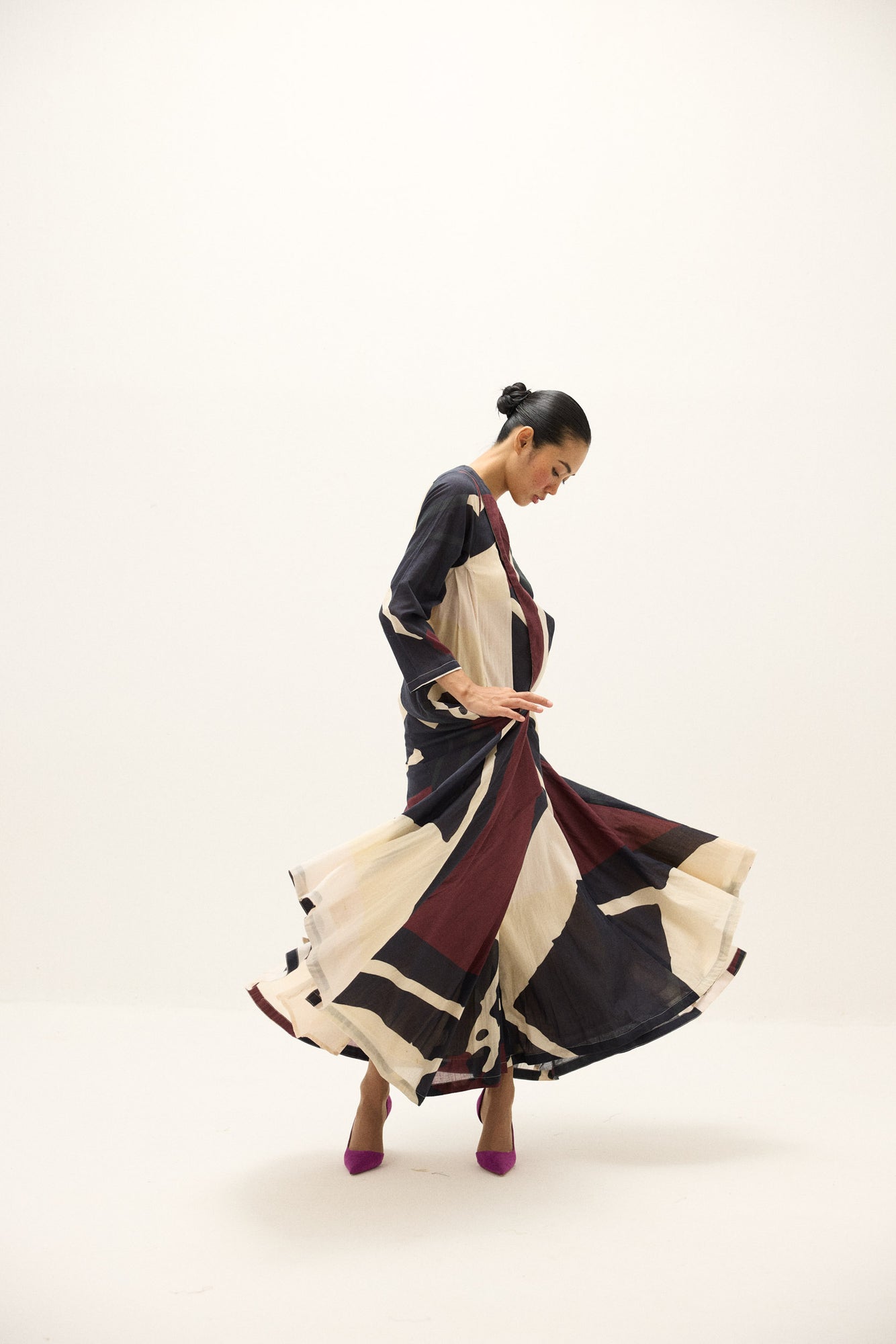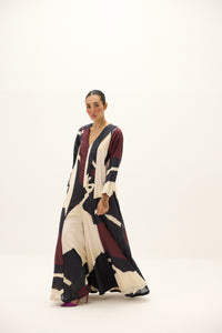 An effortlessly fluid silhouette crafted in handwoven cotton mul, featuring bold abstract prints in deep wine, ink blue, and ivory. The Ella Jumpsuit combines the ease of a kaftan with the structure of a jumpsuit - defined by a plunging neckline, flared sleeves, and a wide, flowing hem that moves with grace.