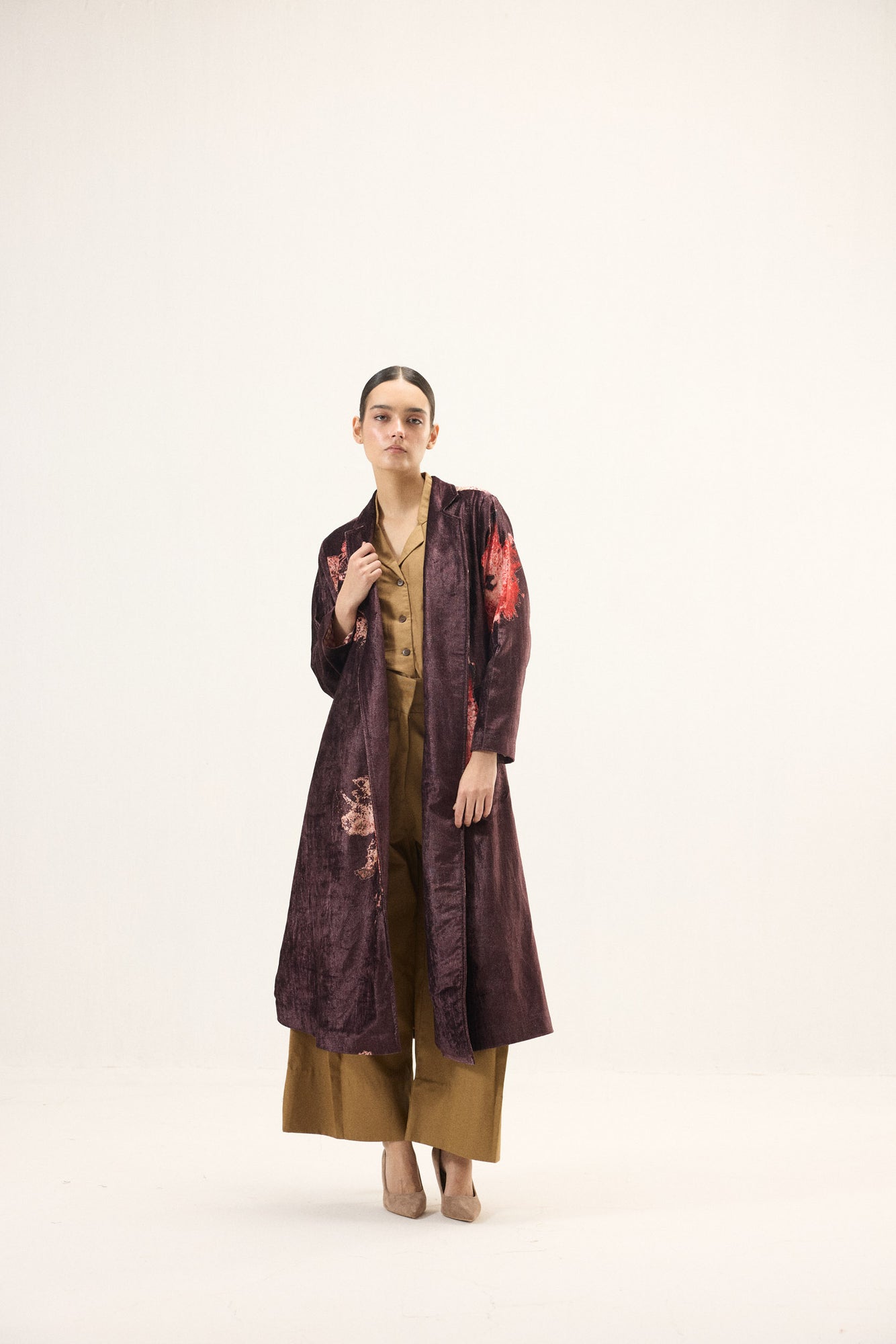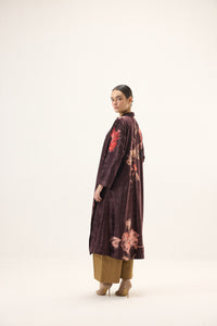 Crafted in plush purple velvet, this trench coat is a statement of modern elegance. The richness of the fabric brings depth and softness, while large floral prints add a bold yet graceful presence. Designed with full-length sleeves and a fluid drape, it layers effortlessly. Lining: Red Checkered Mul Lining.