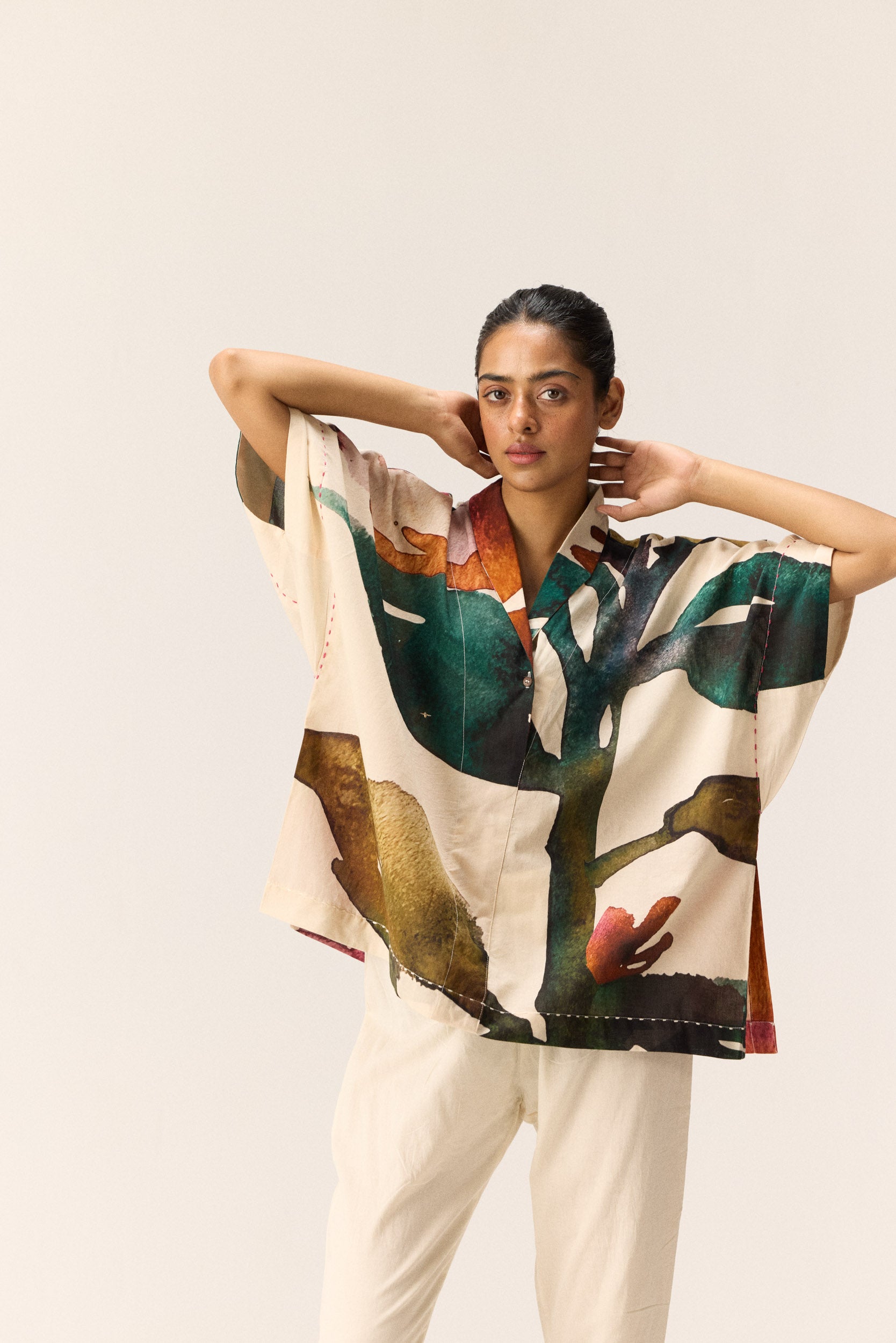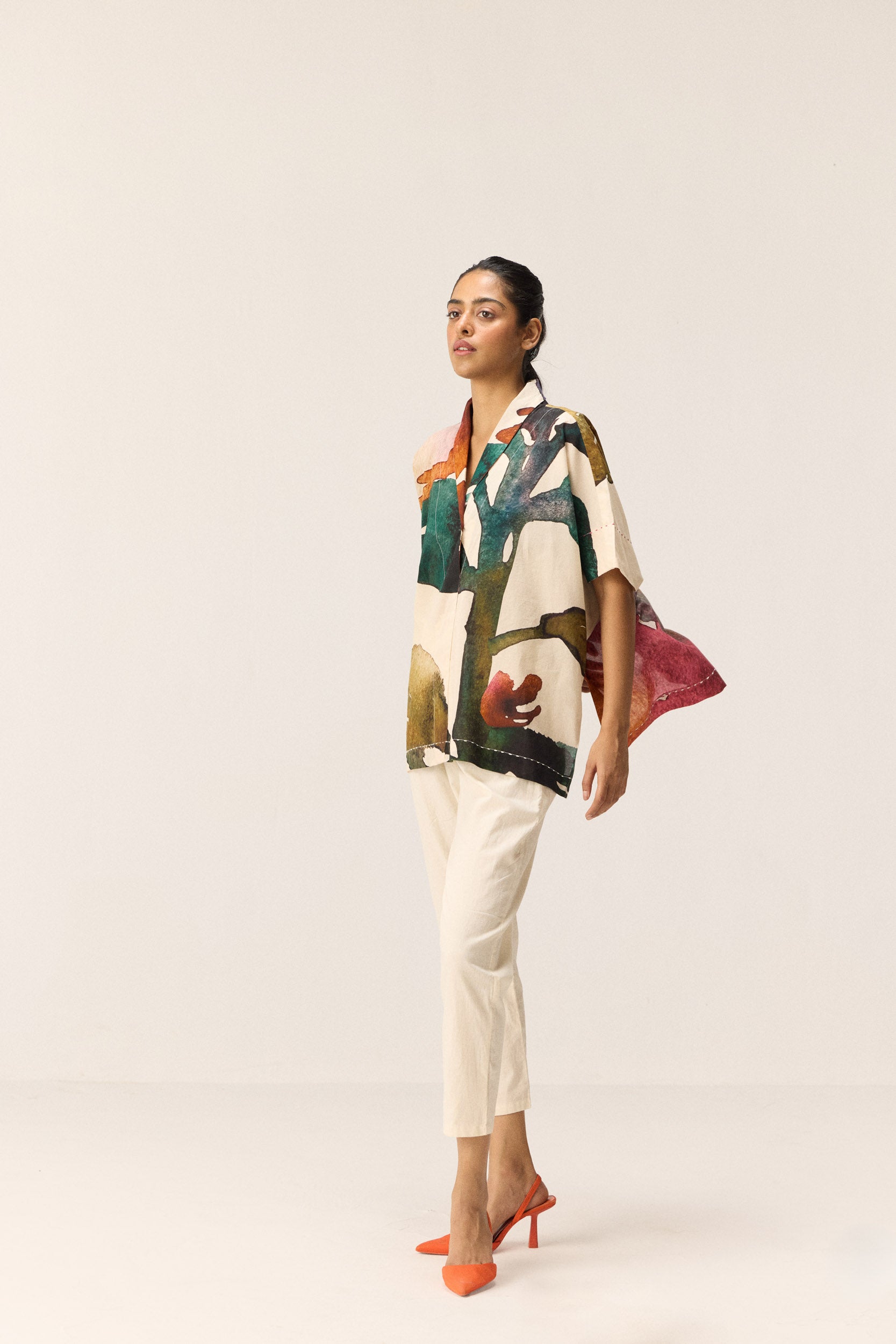 An off-white anti-fit floral print mul tunic comes with shawl collar, side slits and hand running stitches at the hemline of the tunic and the sleeves.