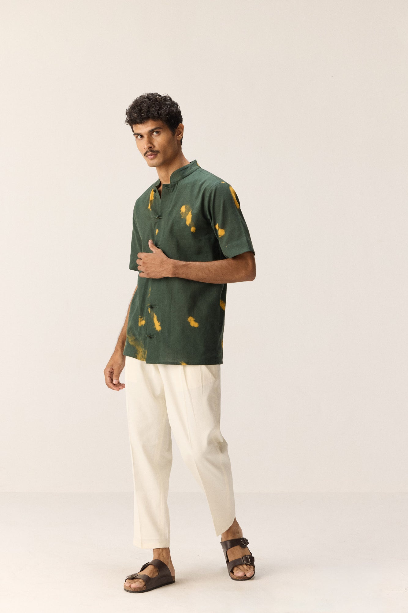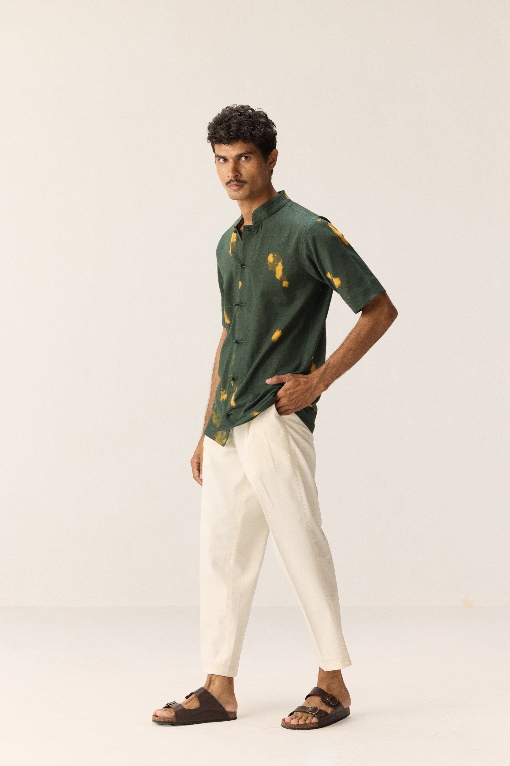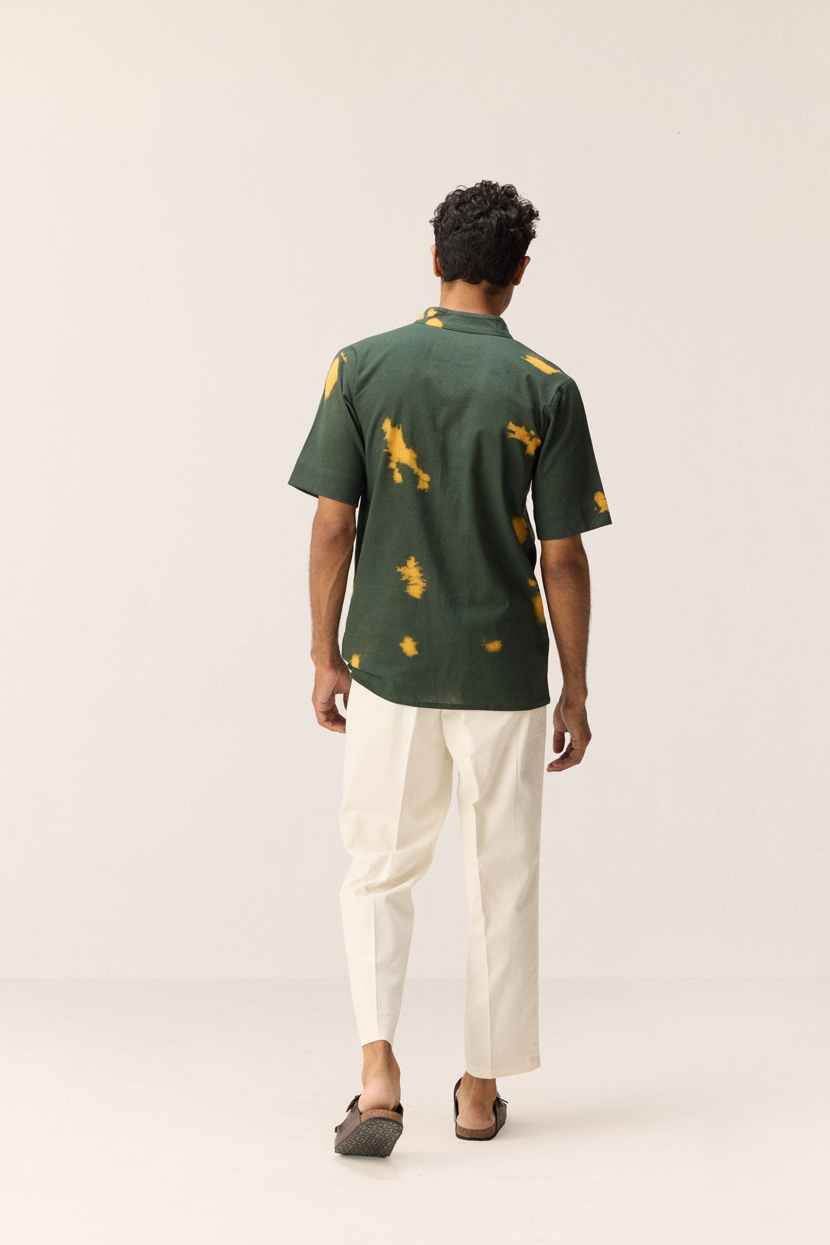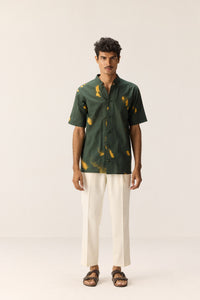 This dark green khadi shirt stands out with its striking yellow shibori patches—each one hand-dyed for a unique, artisanal flair. The breathable fabric keeps it cool and comfortable, while the bold contrast adds a fresh, unexpected twist to a timeless silhouette.