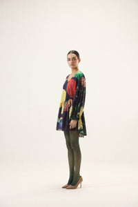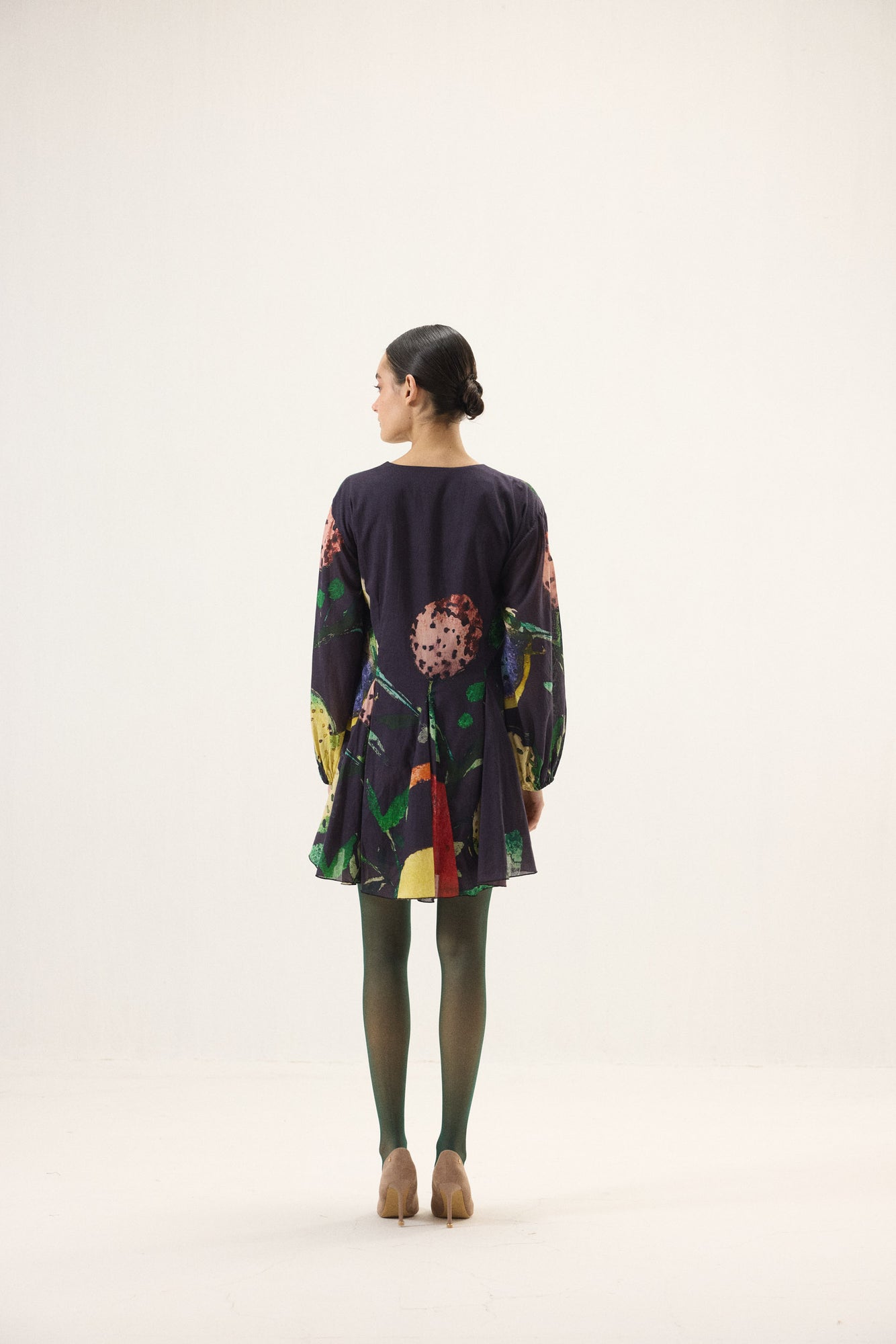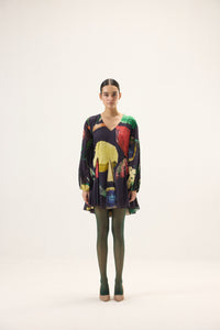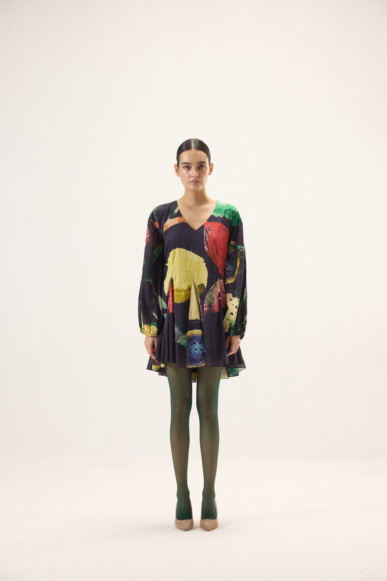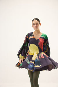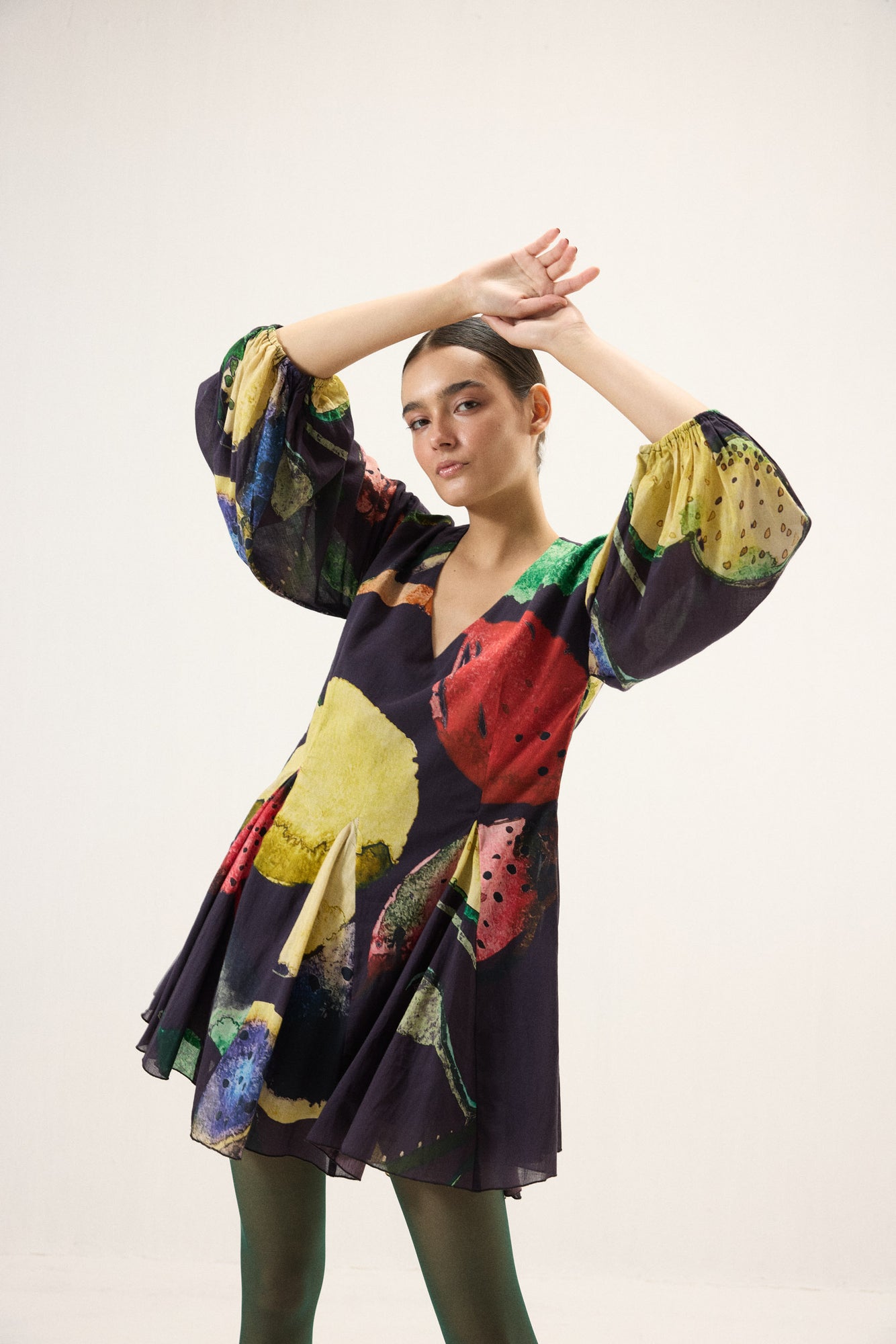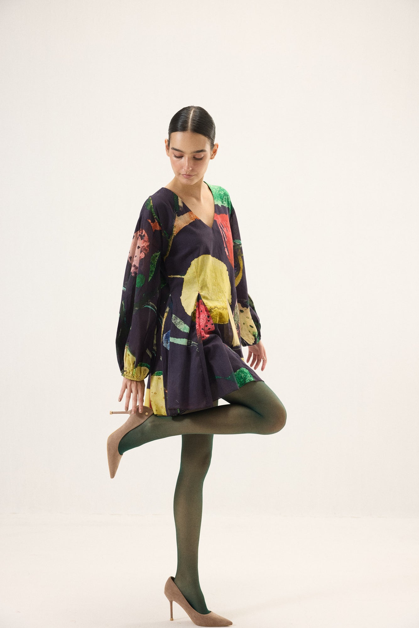 Crafted in airy cotton mul, this dress with a print in bold jewel tones over a deep base, moves with an effortless grace. Designed with a soft V neckline and full-length puff sleeves finished with gentle elasticated cuffs, it balances volume with ease. Godet panels at the hem create fluid flares that sway beautifully with every step, lending the silhouette a light, flowing charm, perfect for days that call for quiet elegance and comfort.