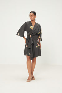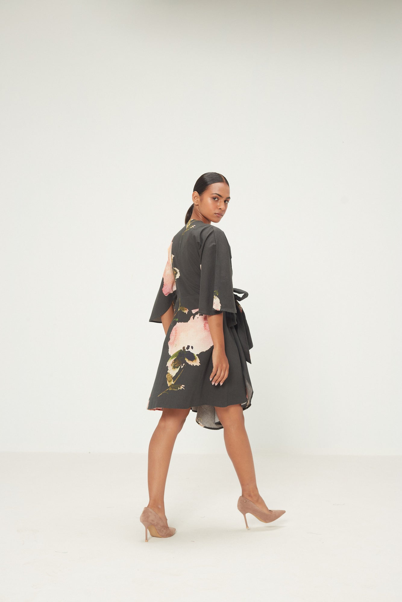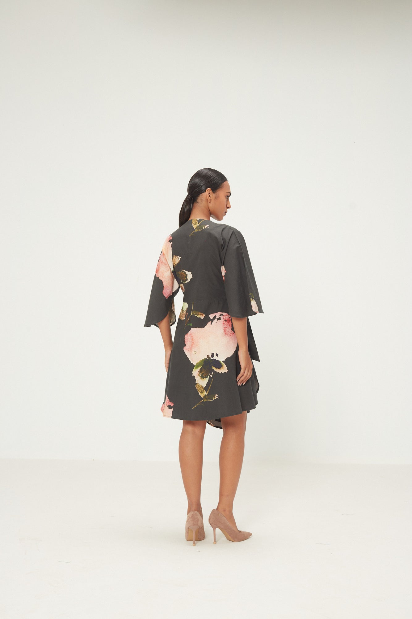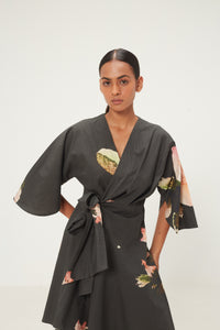 A charcoal poplin wrap dress with a soft V-neckline and relaxed curtain sleeves. Scattered painterly floral motifs add gentle contrast, while the side tie gathers into an asymmetric drape. Finished with a fluid, layered hem, it brings together ease, movement, and quiet elegance.