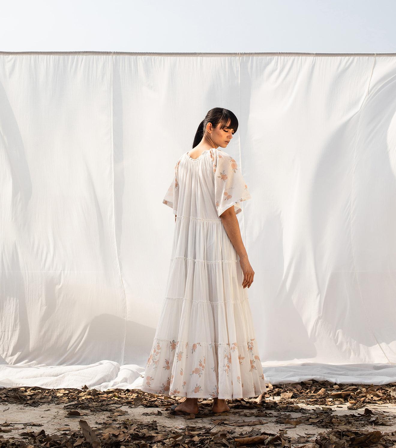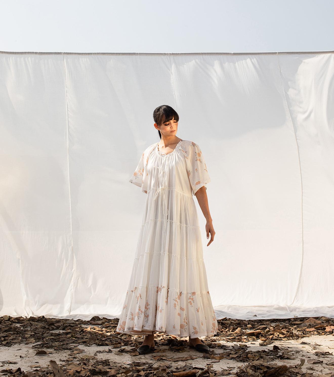 Ivory tiered maxi dress with a round neck, gathered with drawstrings and bell sleeves. Handcrafted in mulmul with a localised delicate floral screen-printed motif.