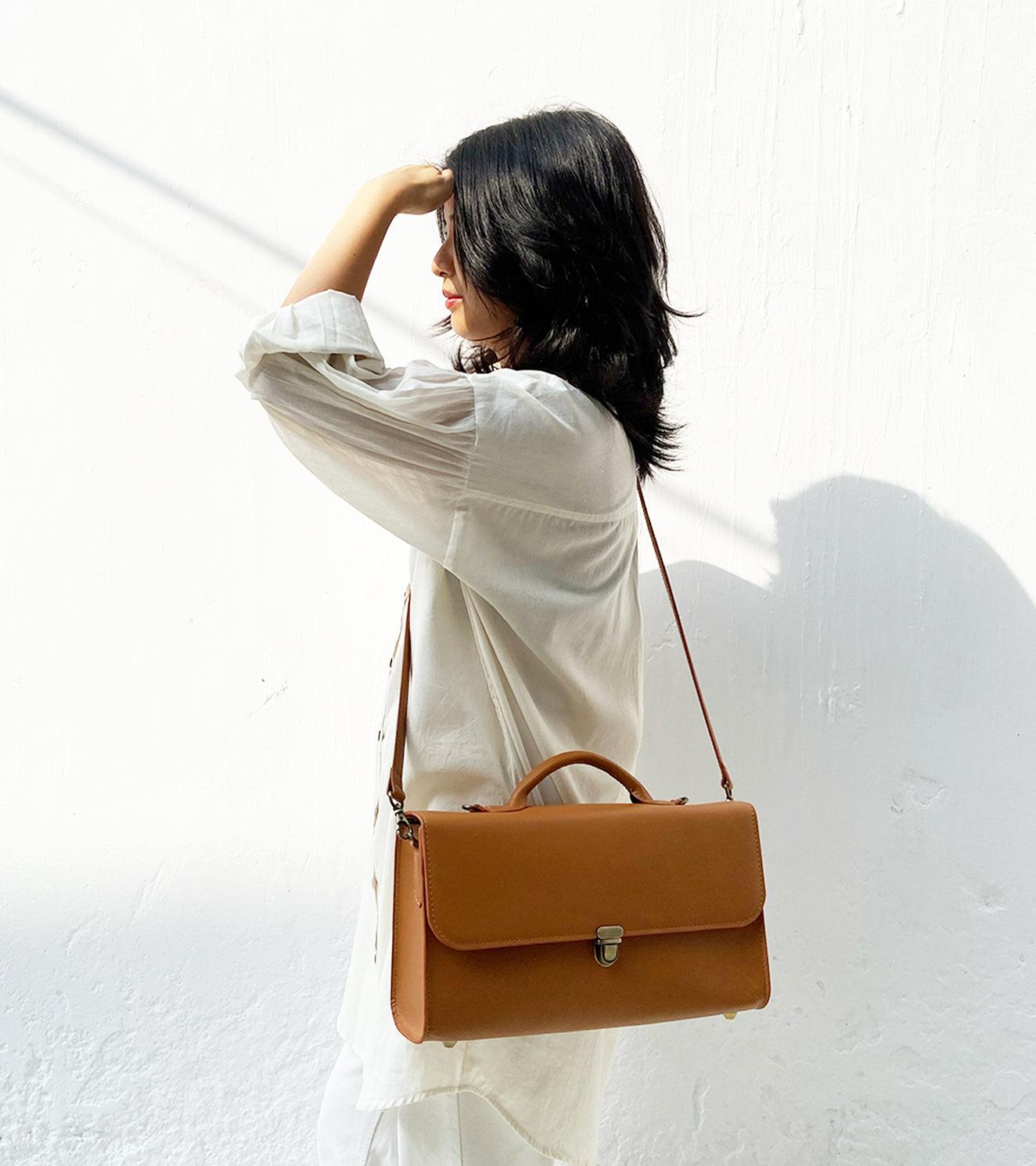 Our tan coloured messenger bag is made with genuine leather that is responsibly sourced. Comes with a detachable long strap, front buckle opening, a zipper pocket inside, attached handles and fully lined with 100% linen.