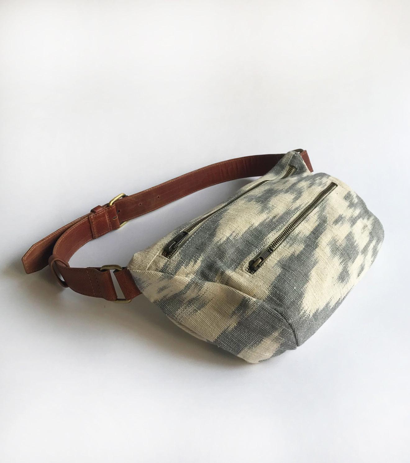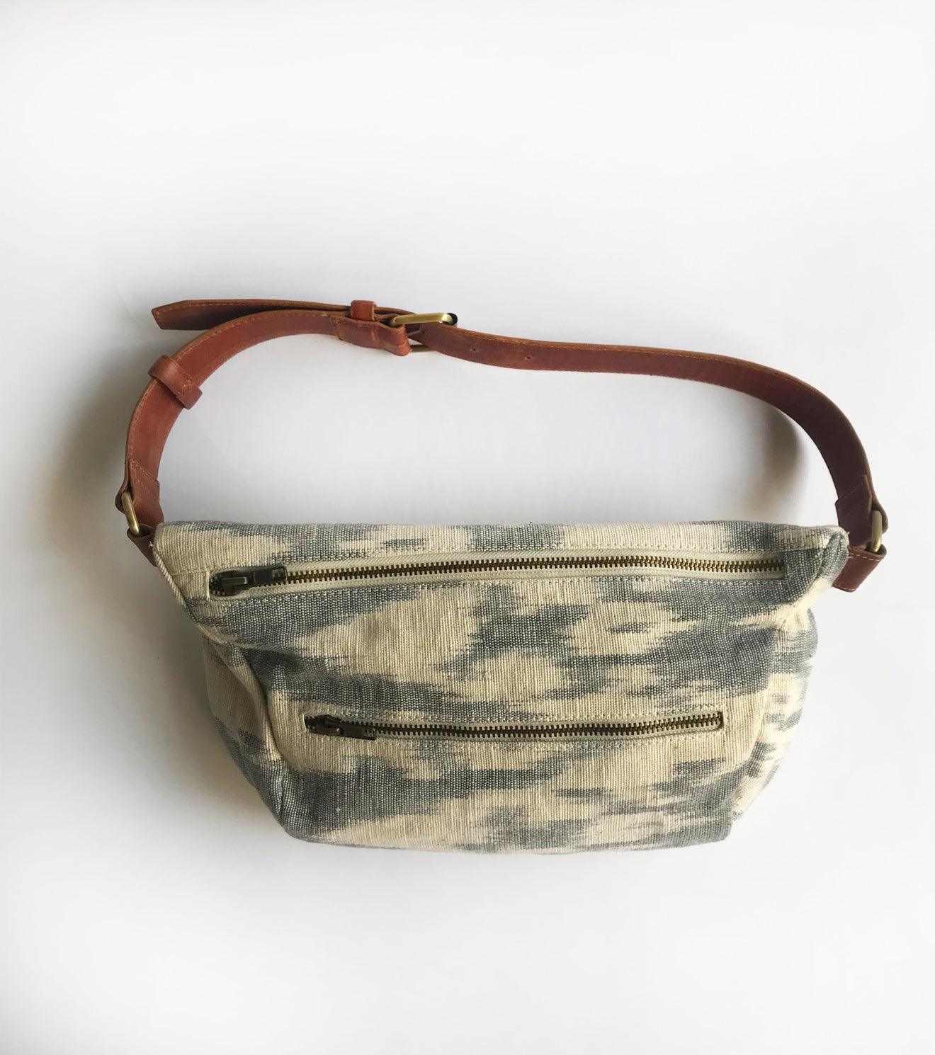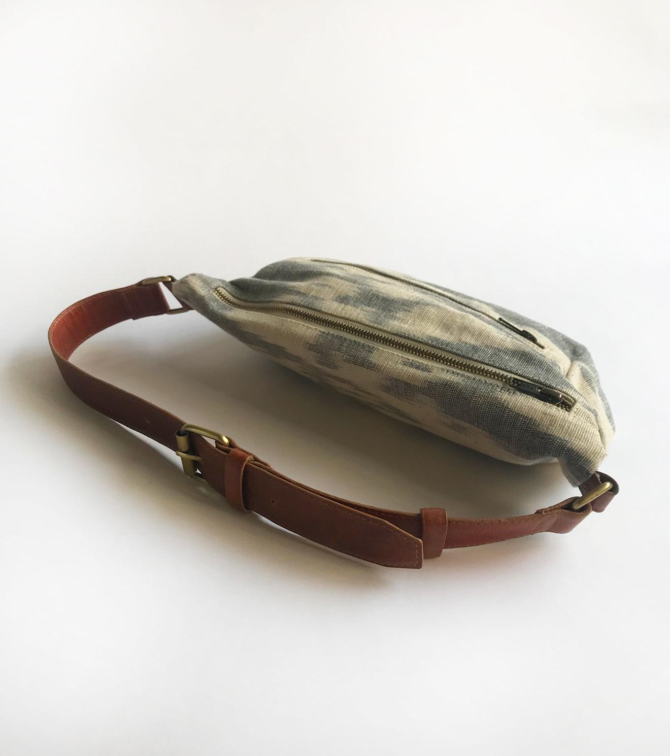 Handcrafted Ikat fanny bag with a front small pocket and a main compartment for storage with an adjustable leather strap.