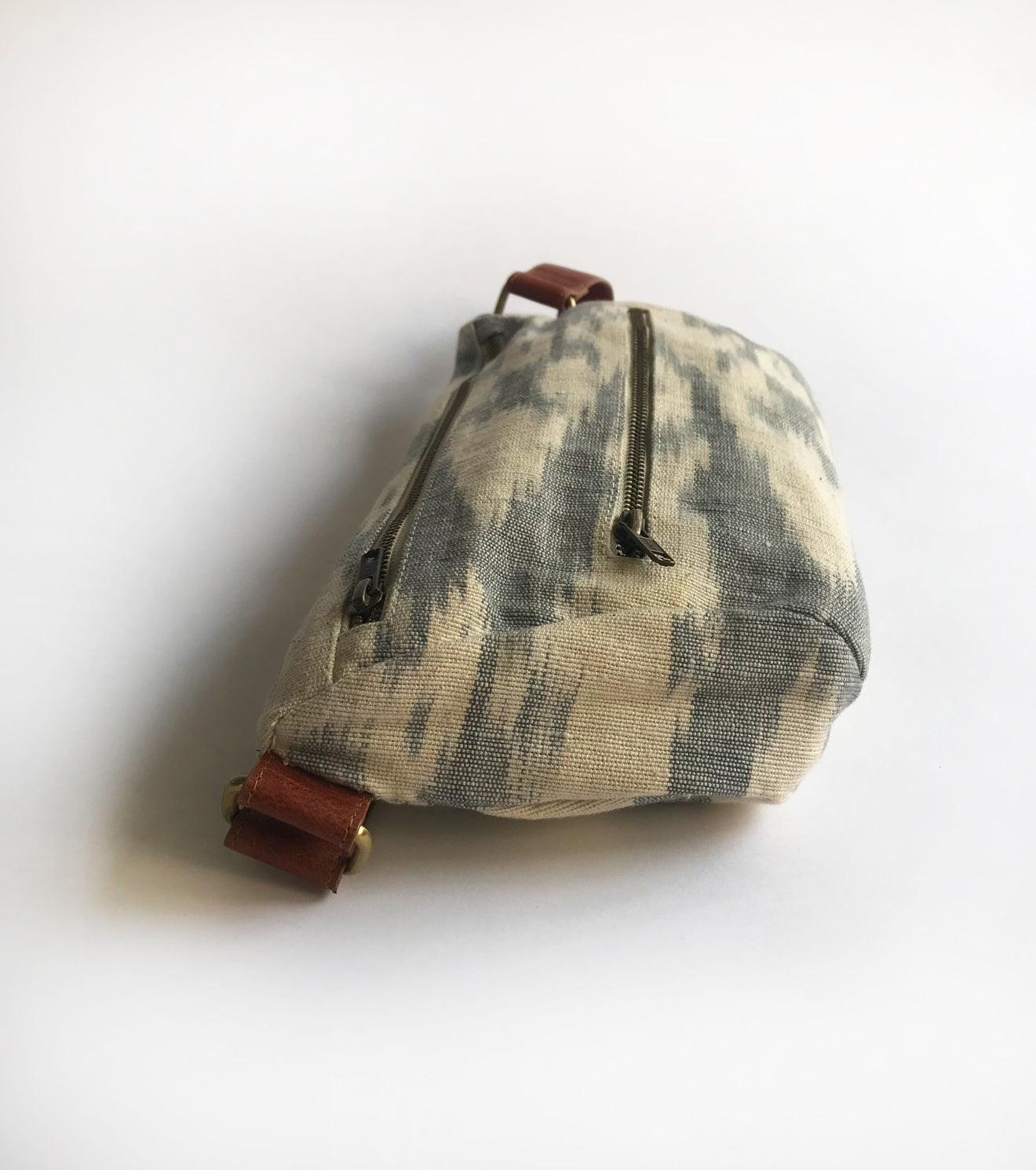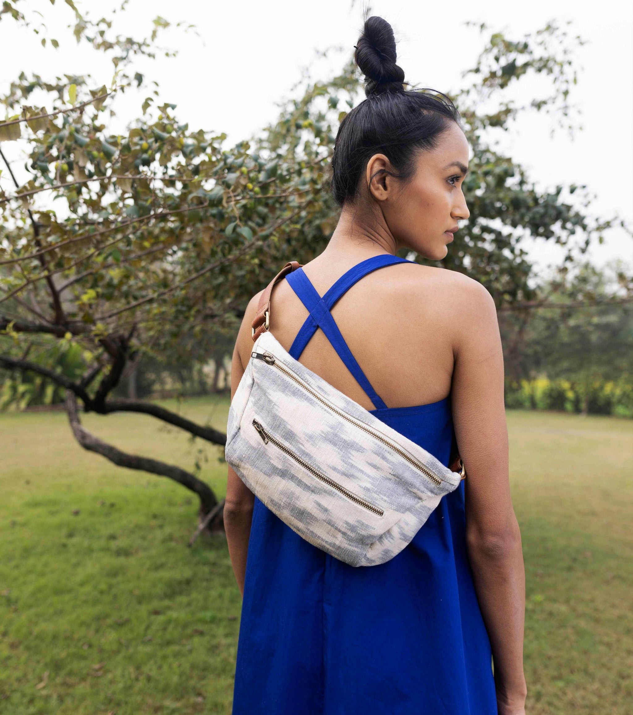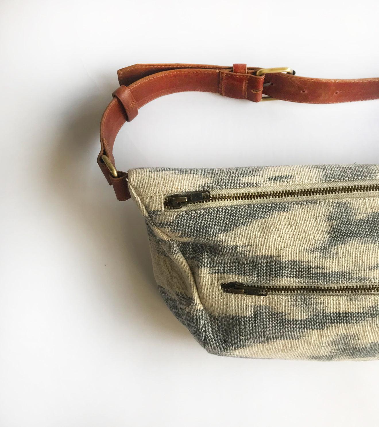 Handcrafted Ikat fanny bag with a front small pocket and a main compartment for storage with an adjustable leather strap.