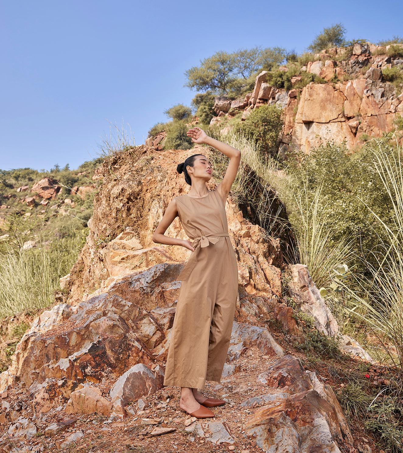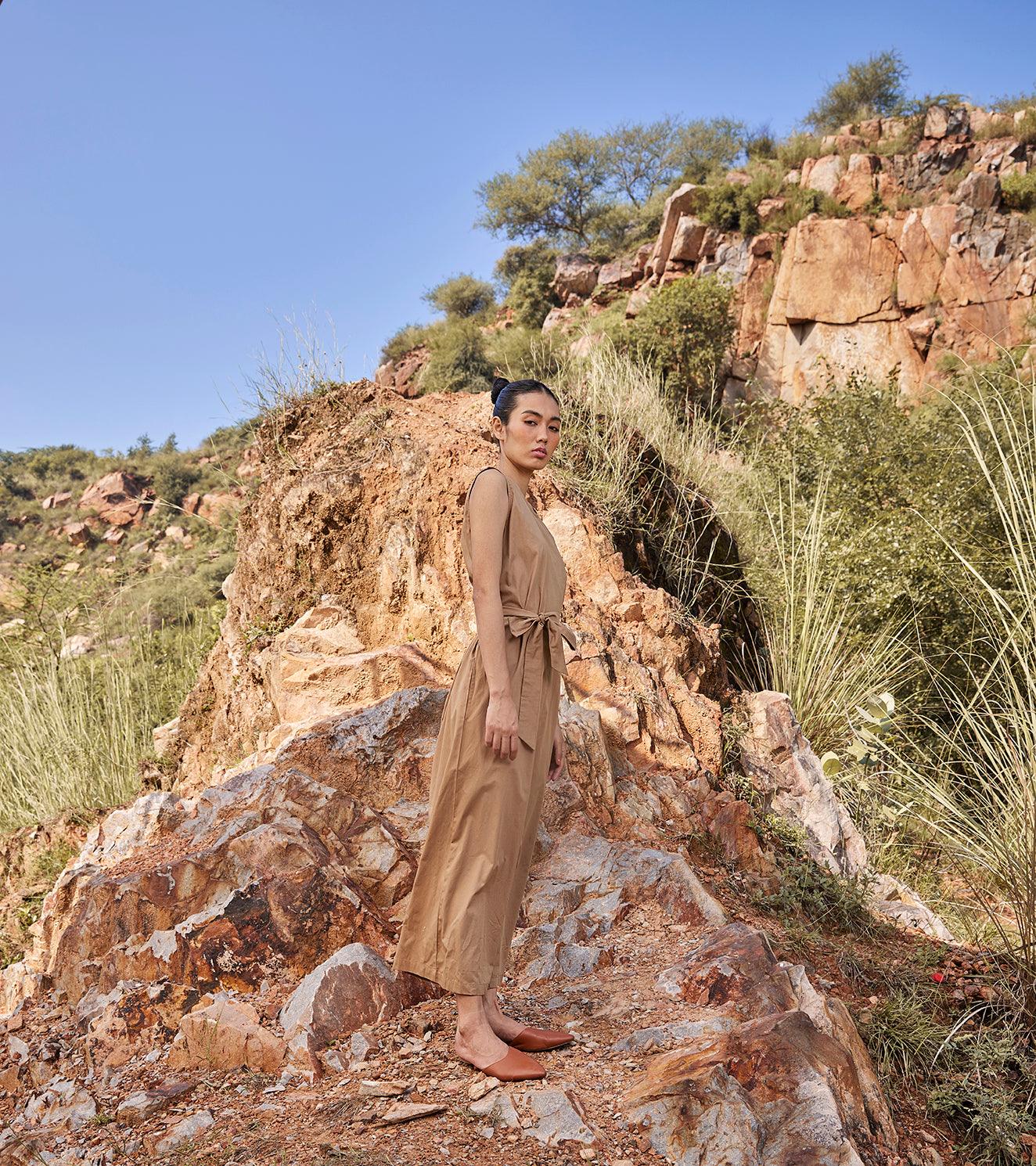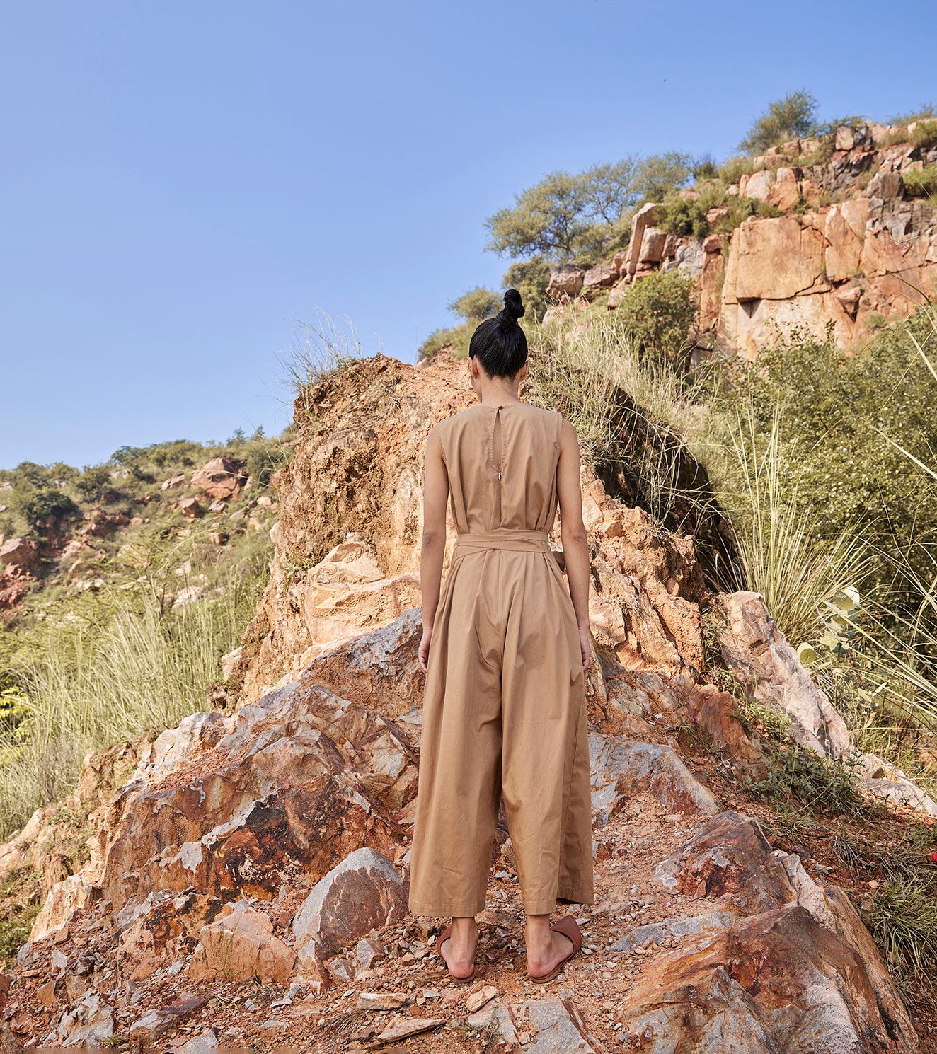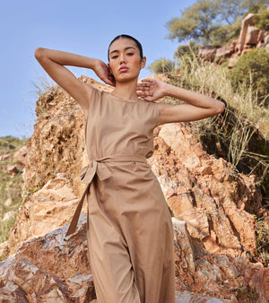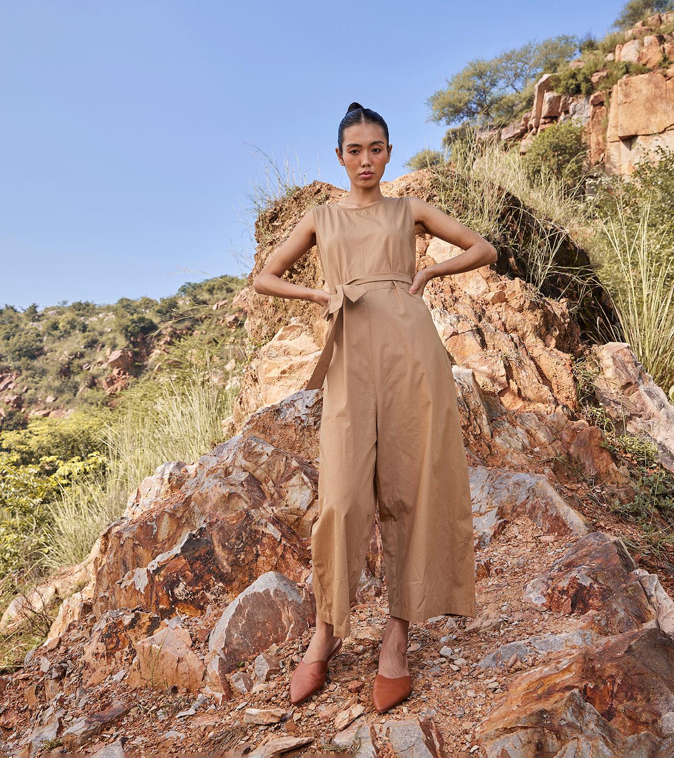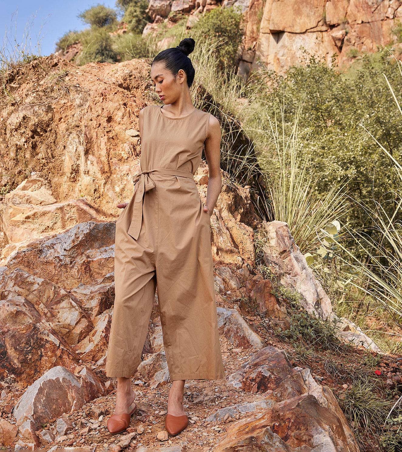 A solid khaki brown sleeveless jumpsuit with relax fit bottom, waist belt adjuster, a round back opening with a button and a back zipper.