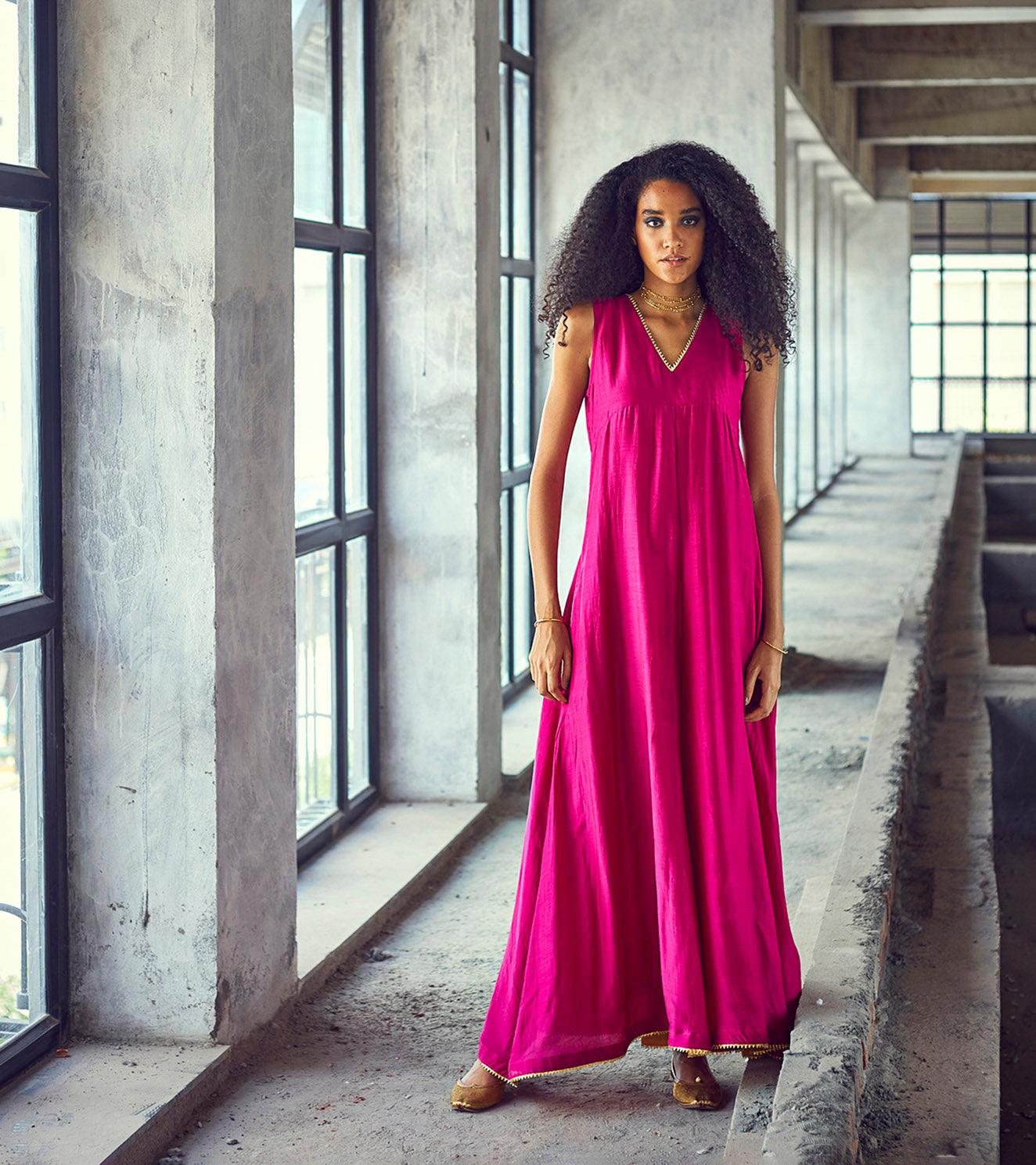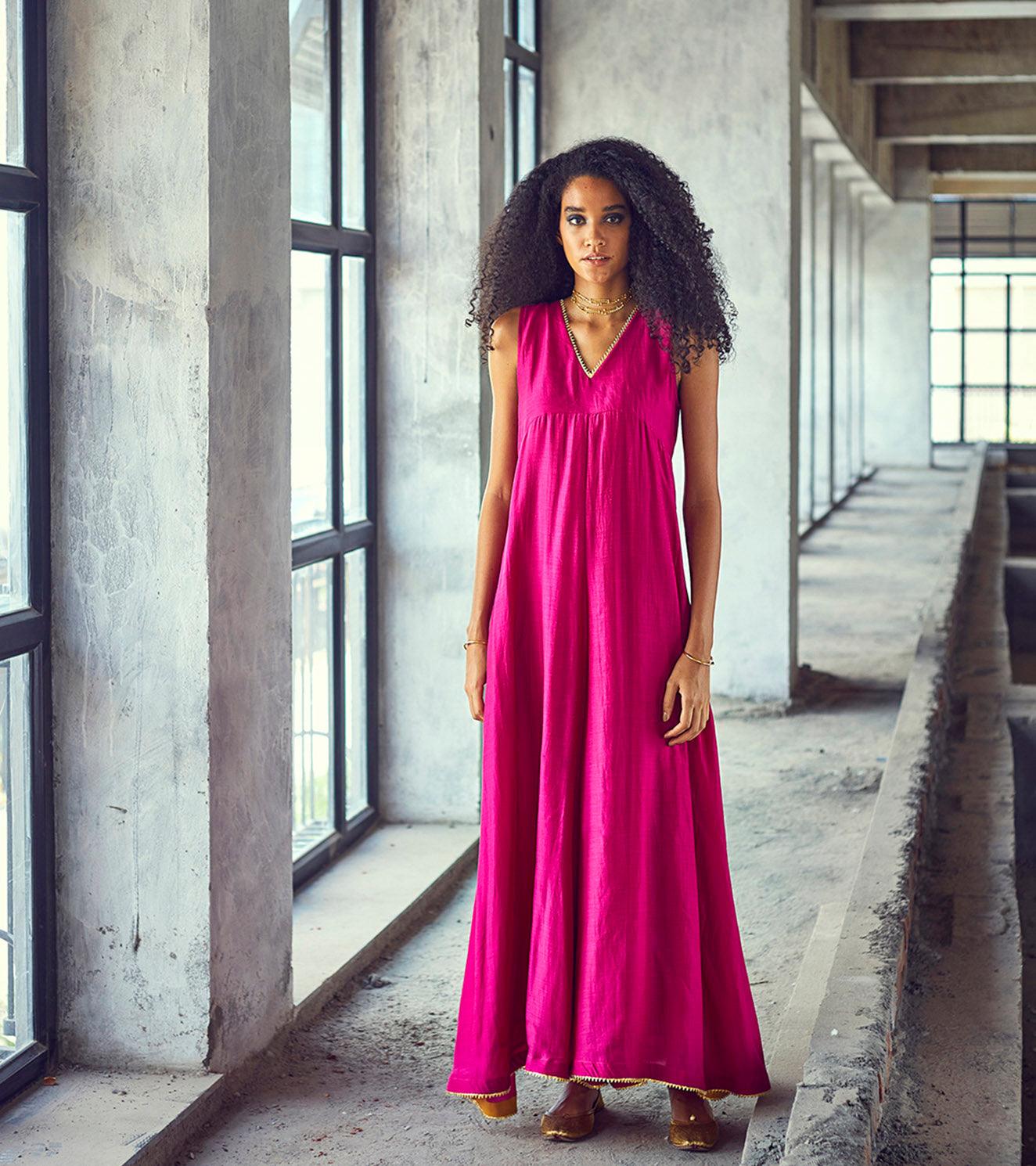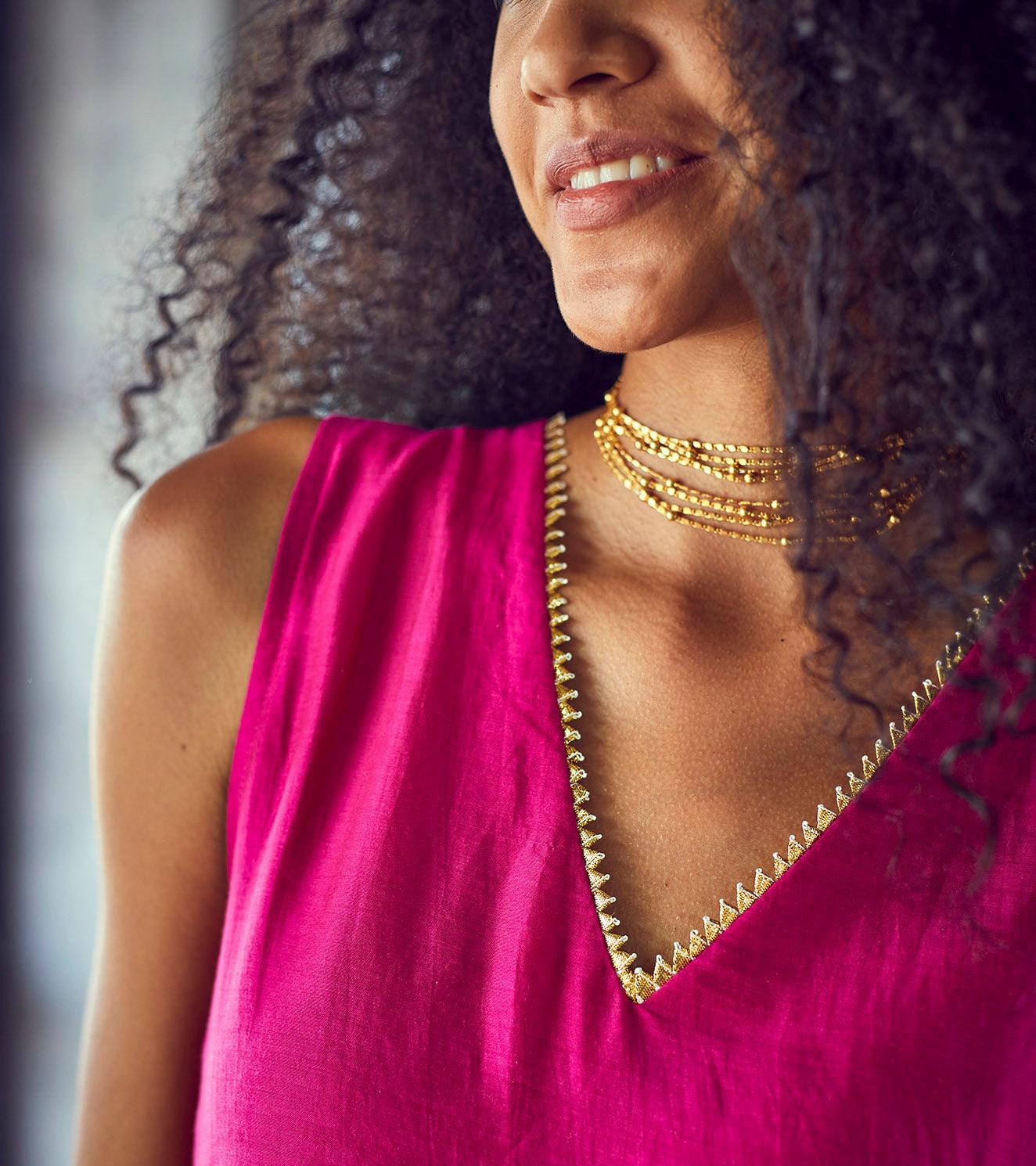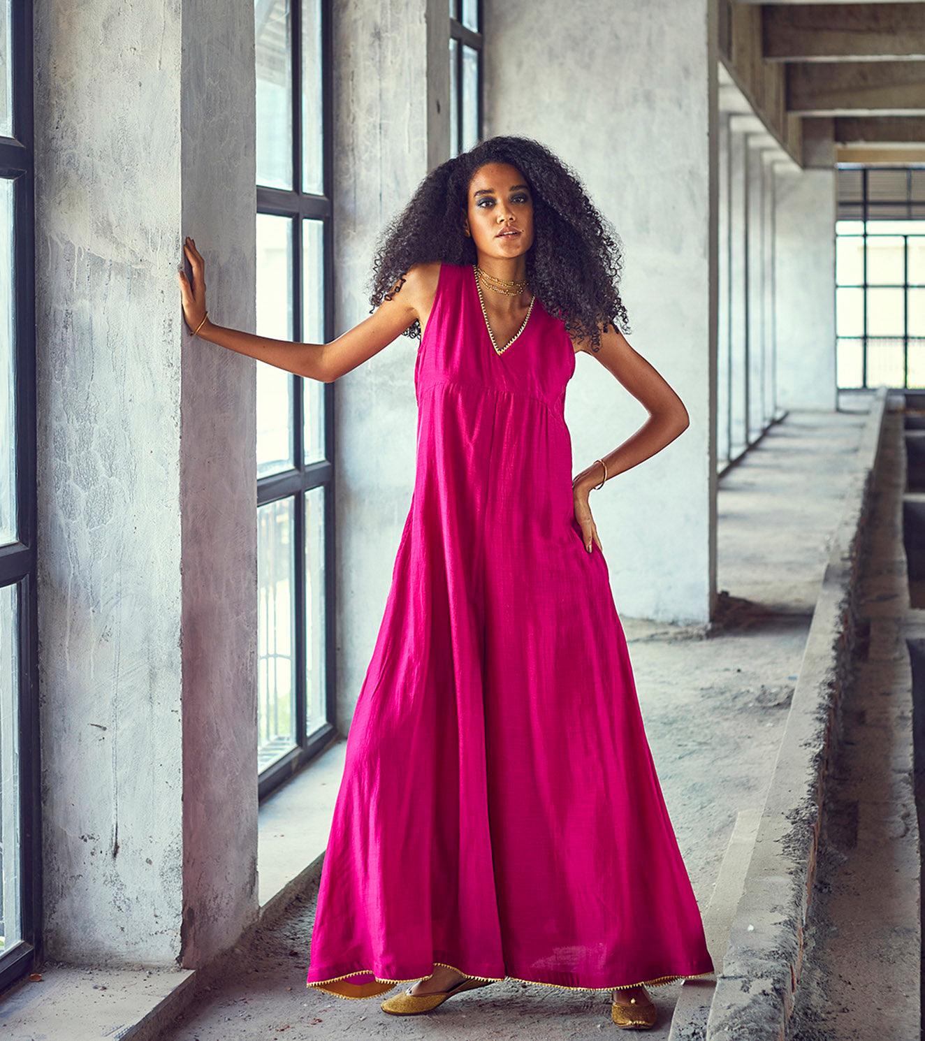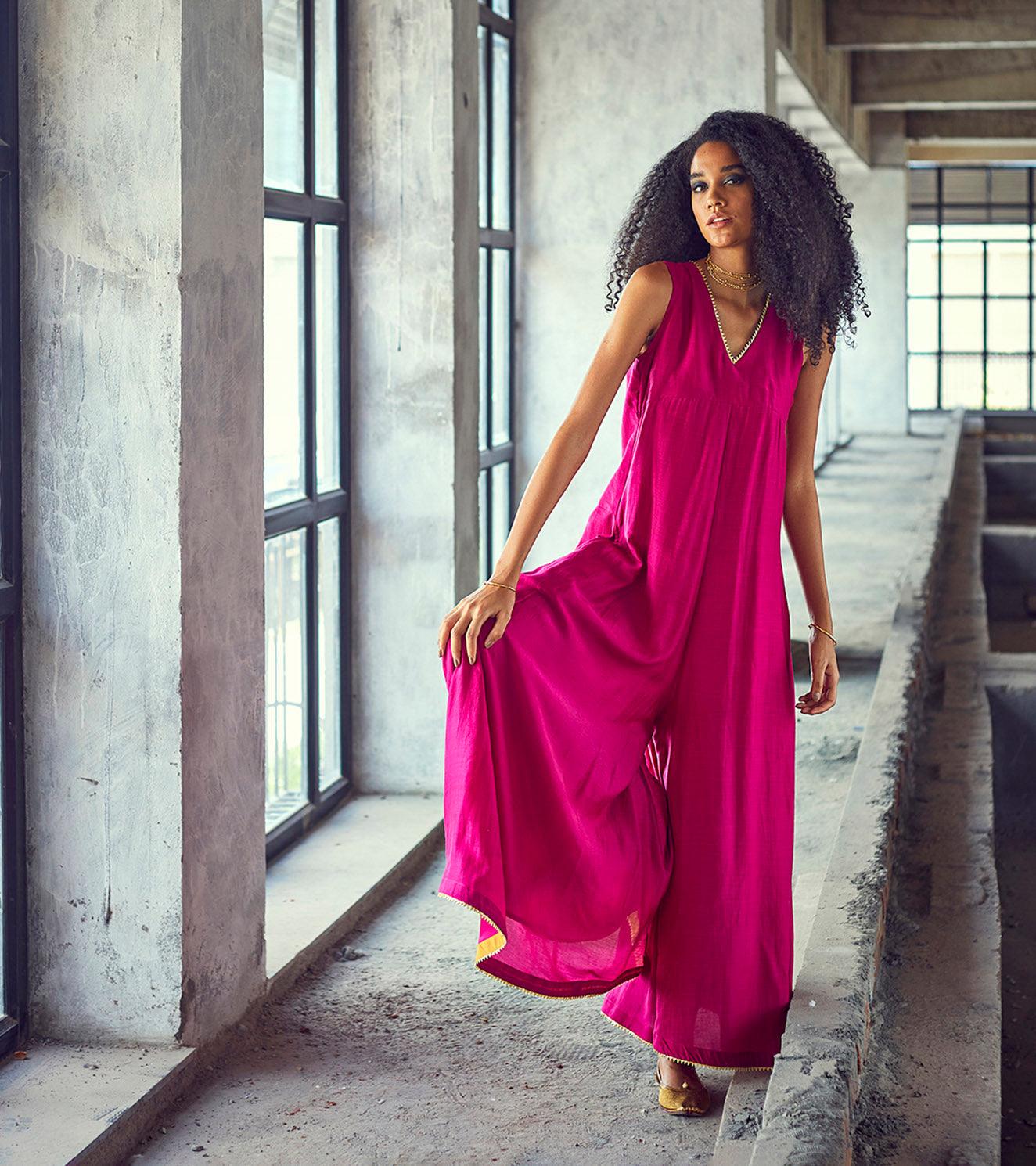 Jamun v-neck cotton silk jumpsuit with a back concealed zipper, flared pants and gota hemline. Club it with our gold hasli and astra balis for a fun festive look.