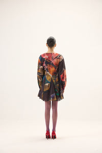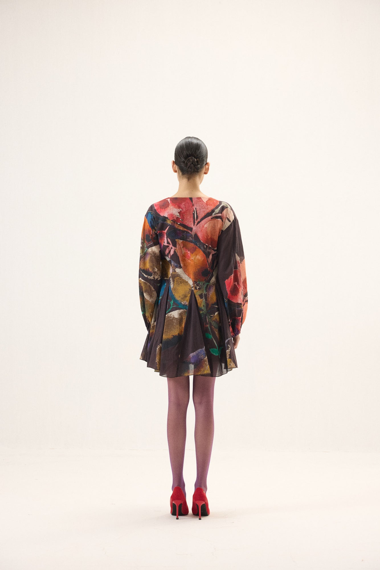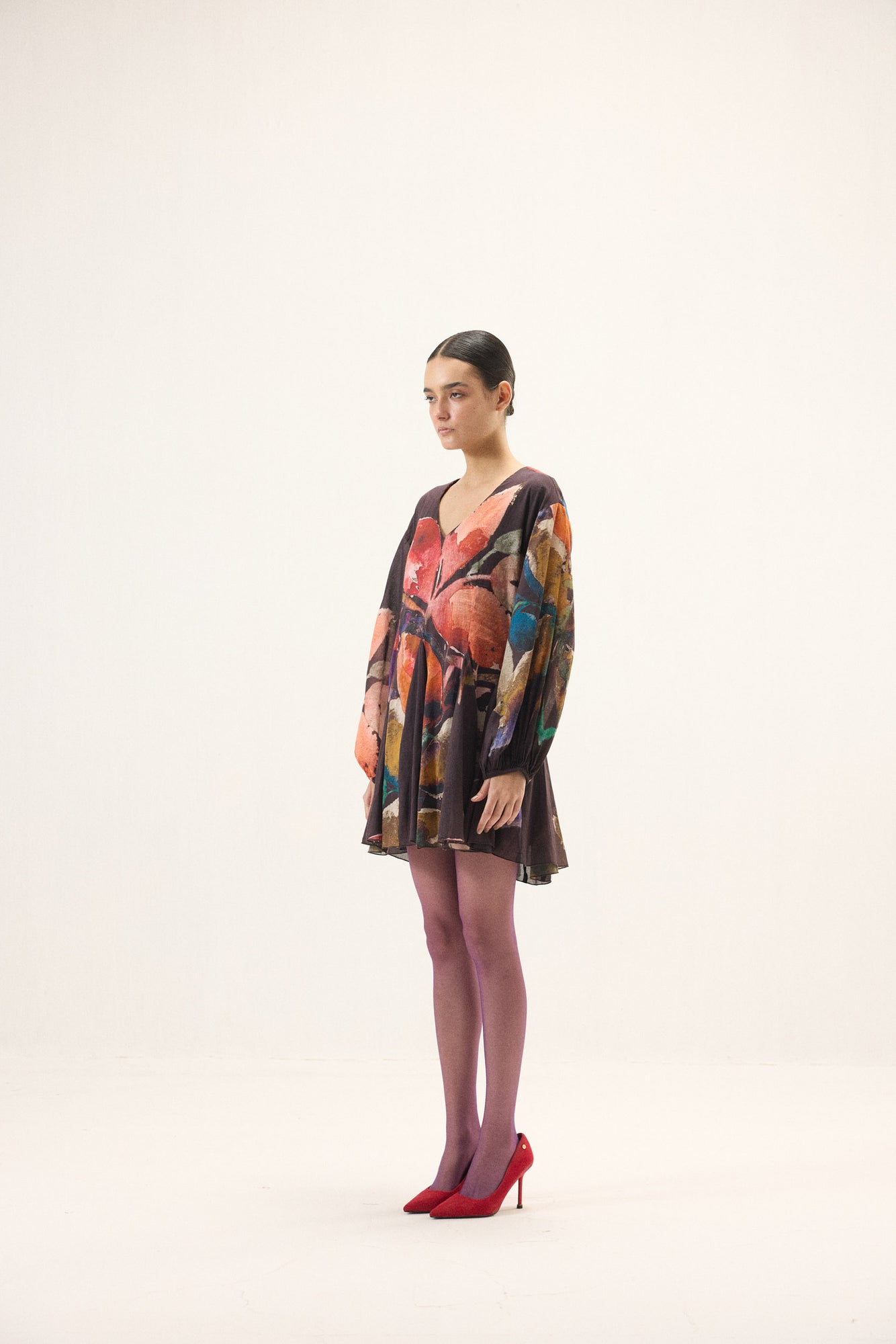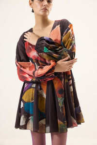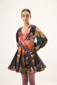 Crafted in airy cotton mul, this purple dress in bold floral prints, moves with an effortless grace. Designed with a soft V neckline and full-length puff sleeves finished with gentle elasticated cuffs, it balances volume with ease. Godet panels at the hem create fluid flares that sway beautifully with every step, lending the silhouette a light, flowing charm, perfect for days that call for quiet elegance and comfort.