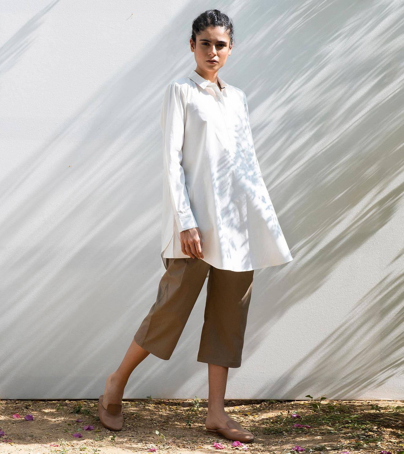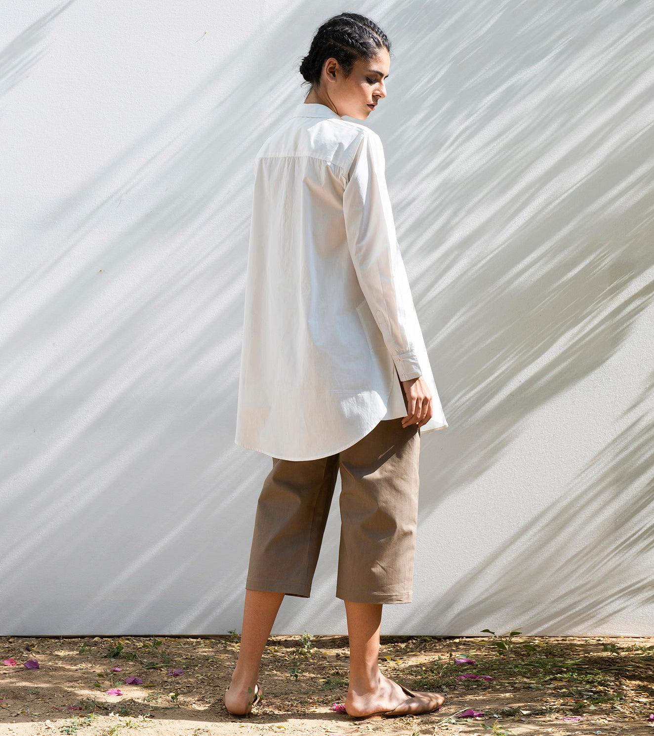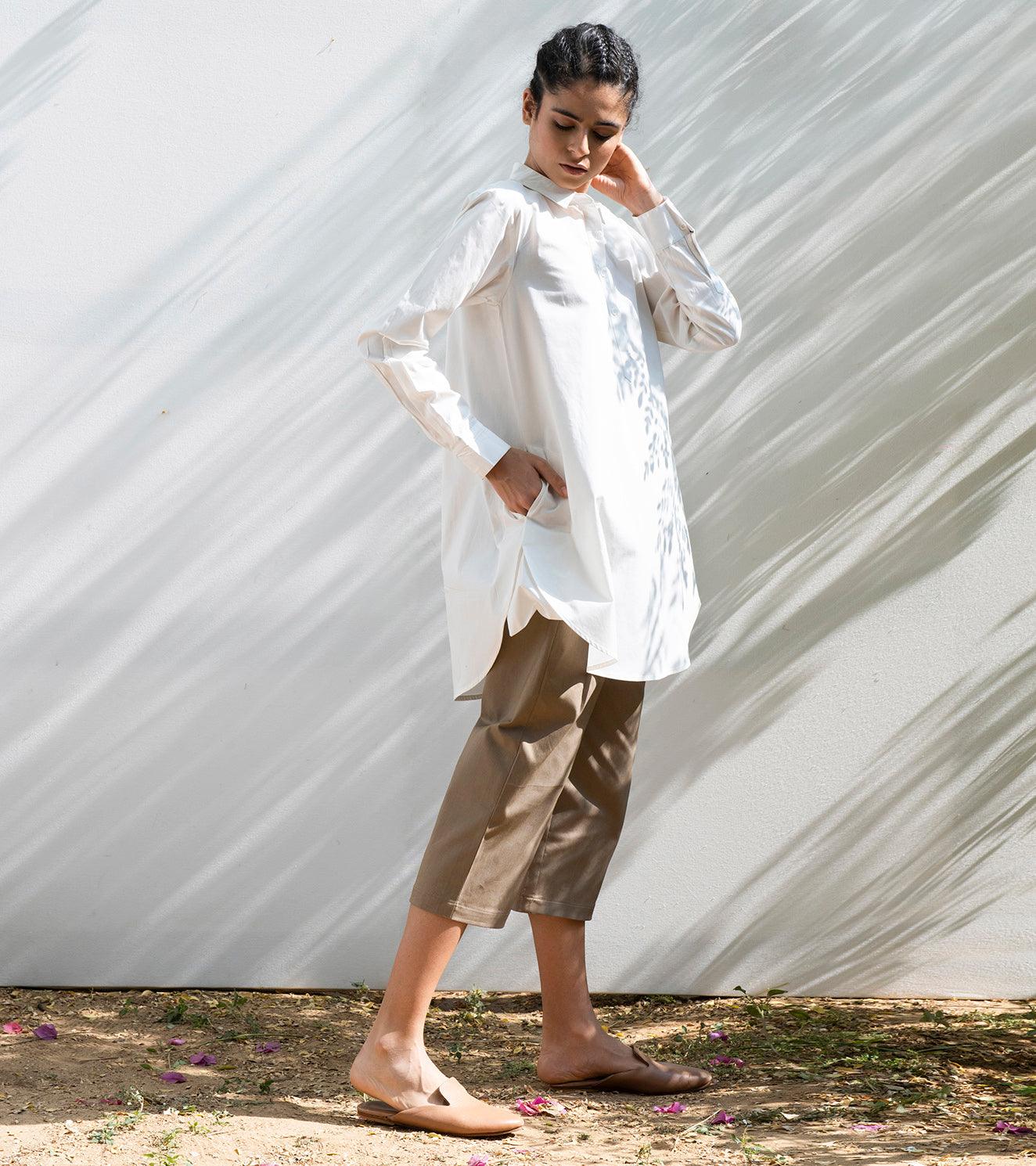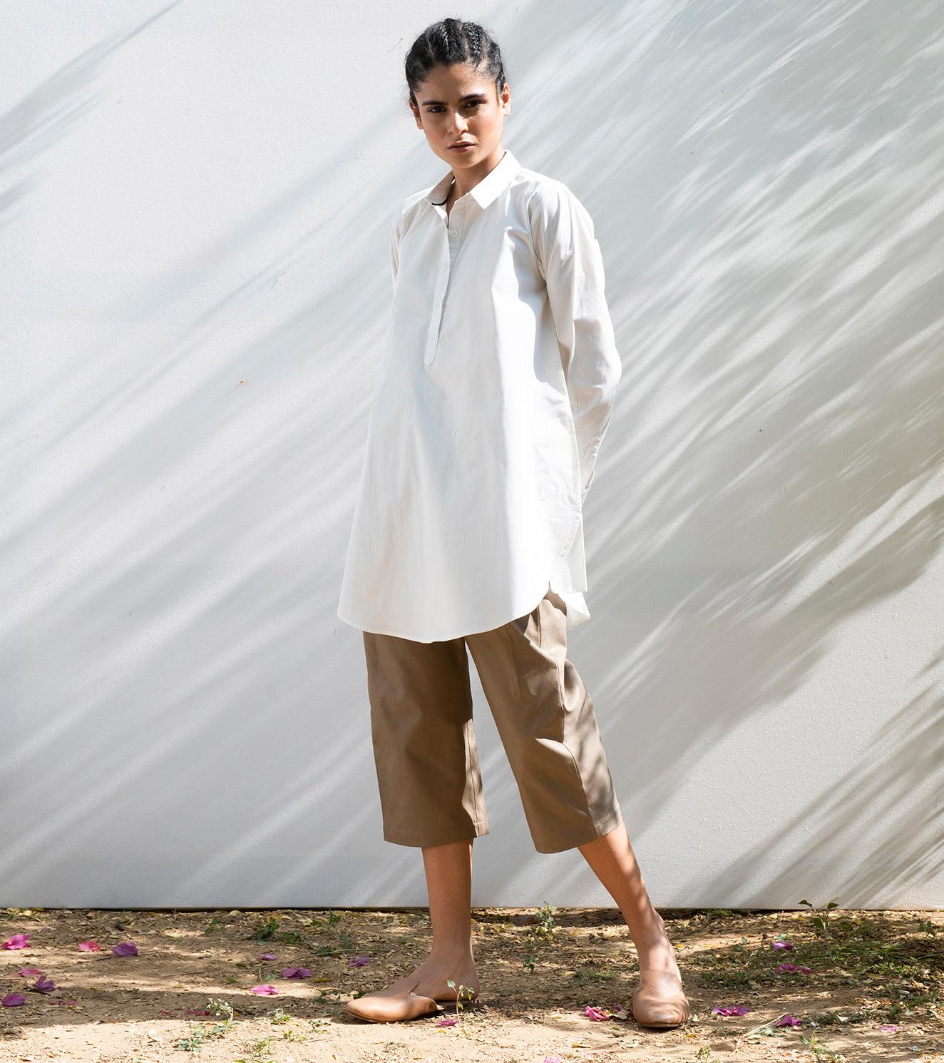 White kurta style shirt with a curved hemline, cuffed sleeves, and side pockets.