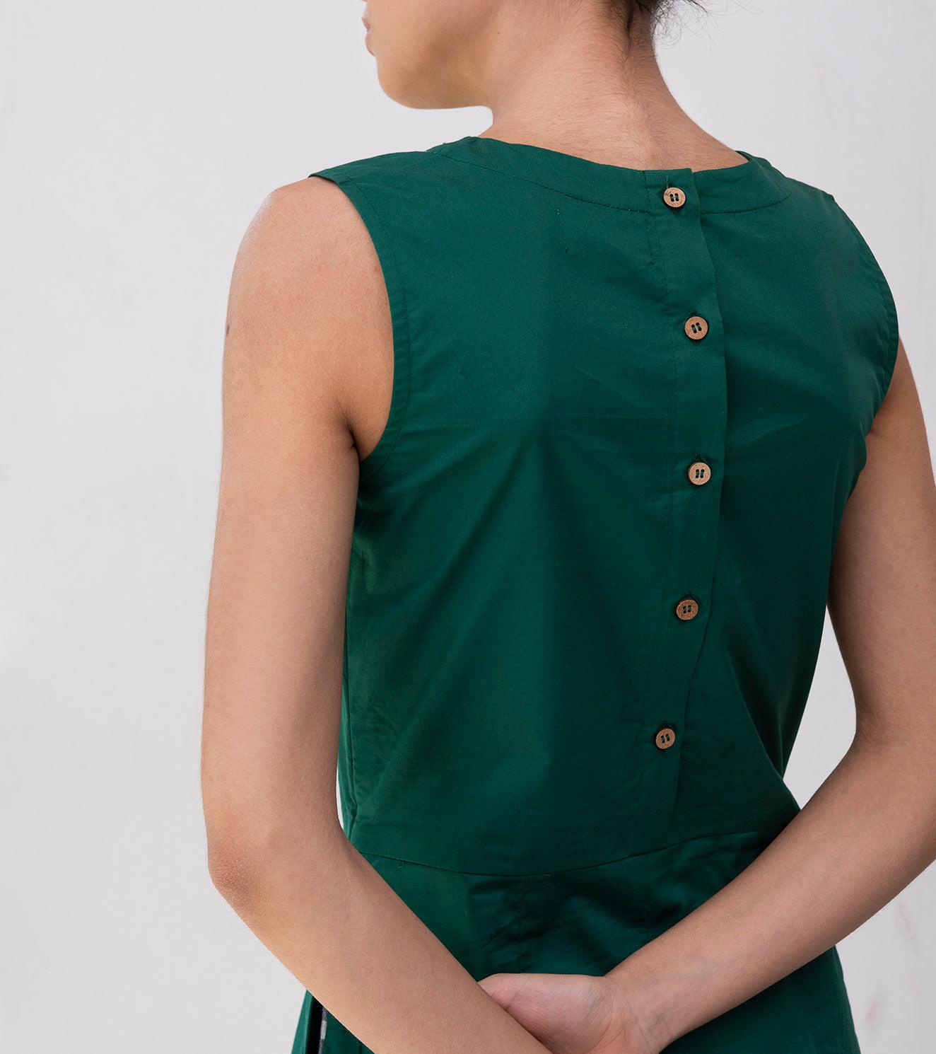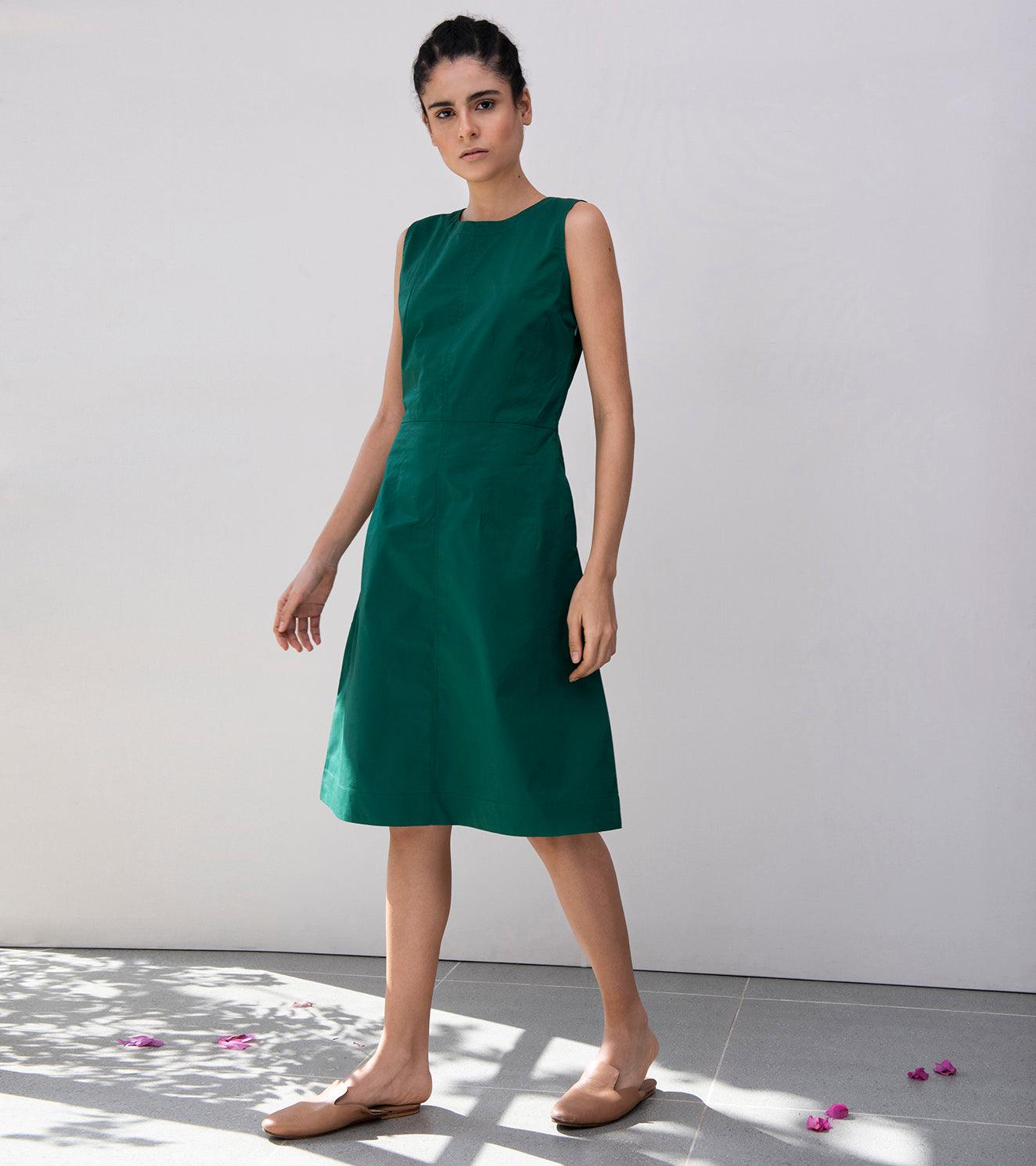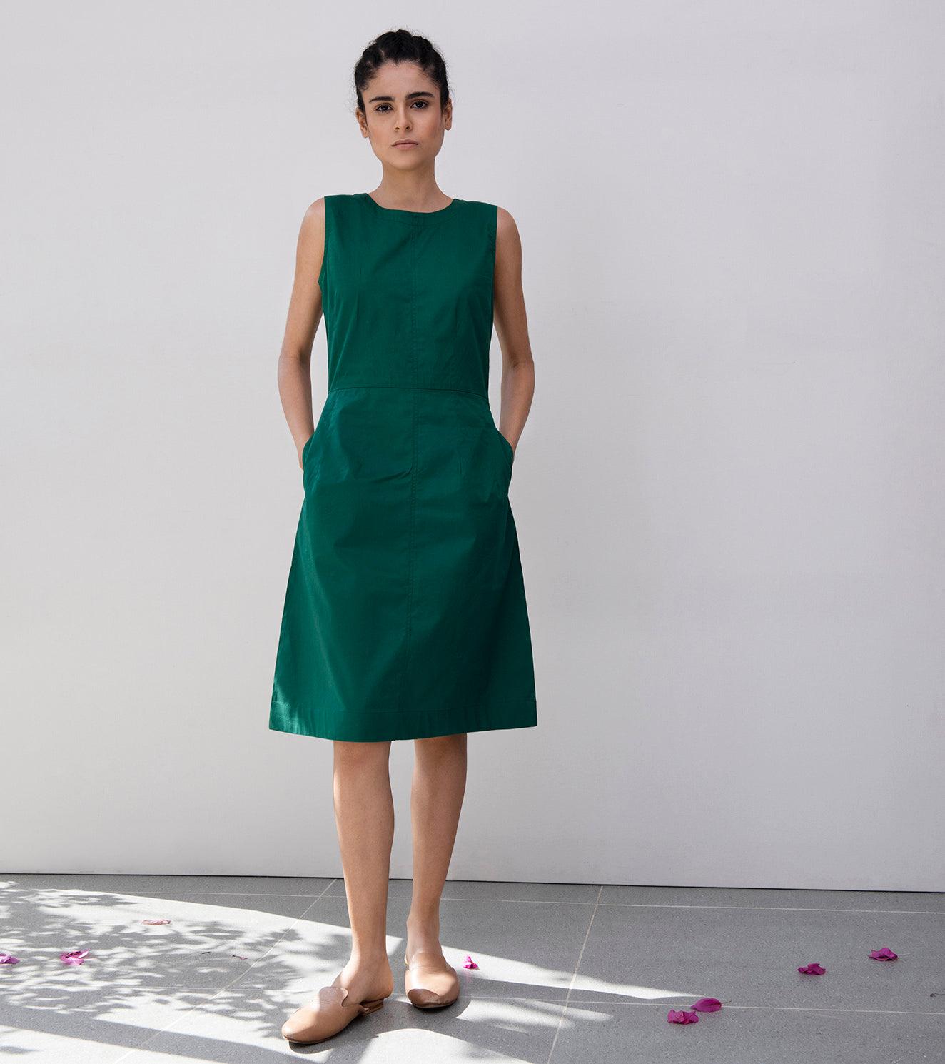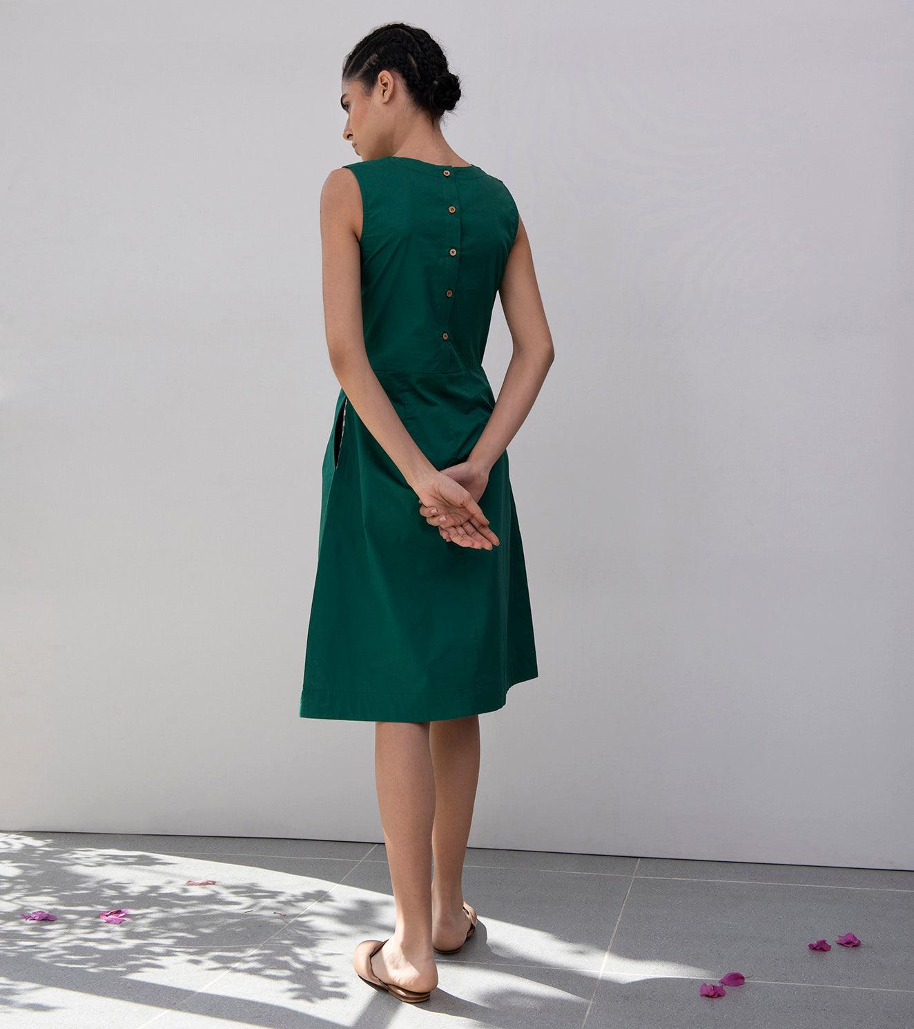 Emerald green structured sheath dress with side pockets and side concealed zipper. The back has a 5-button packet.