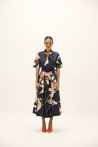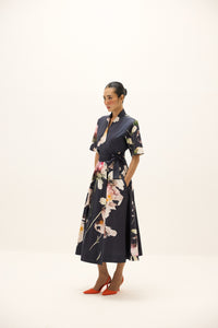 A statement wrap dress in cotton poplin featuring bold hand-painted floral prints in vivid tones of pink, yellow, and ivory against a deep charcoal base. Designed with a V-neckline, elbow-length sleeves, and a self-tie belt to define the waist, it balances structure with effortless movement.