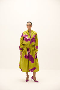 A statement co-ord set crafted in Oxford cotton, featuring bold painterly florals in vivid magenta on a lime base. The relaxed zip-up jacket pairs effortlessly with a gathered midi skirt, creating a striking yet wearable silhouette that blends ease with artistic expression.