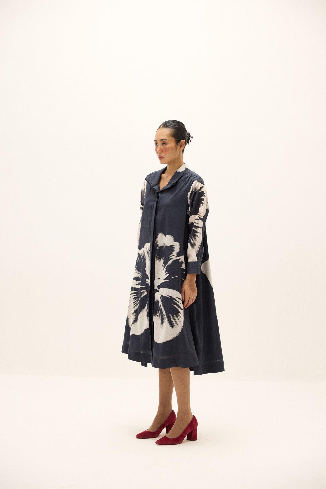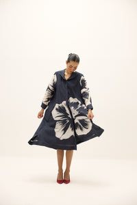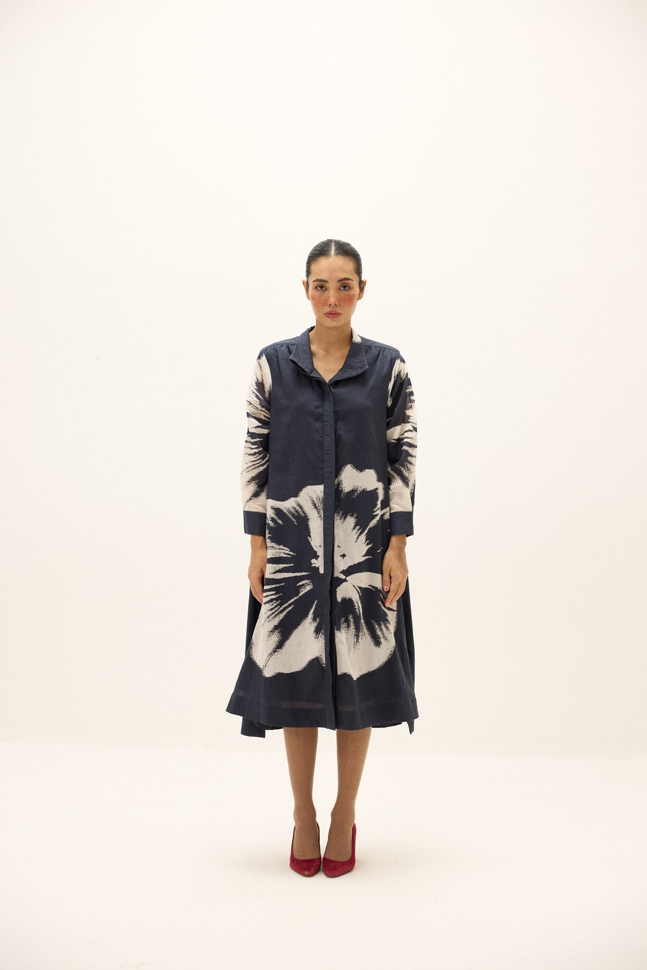 A flowy A-line shirt dress in cotton mul, defined by oversized floral motifs in soft ivory against a deep navy base. Featuring a classic collar, concealed placket, and long sleeves with cuffs, the silhouette moves fluidly while maintaining its structured appeal.