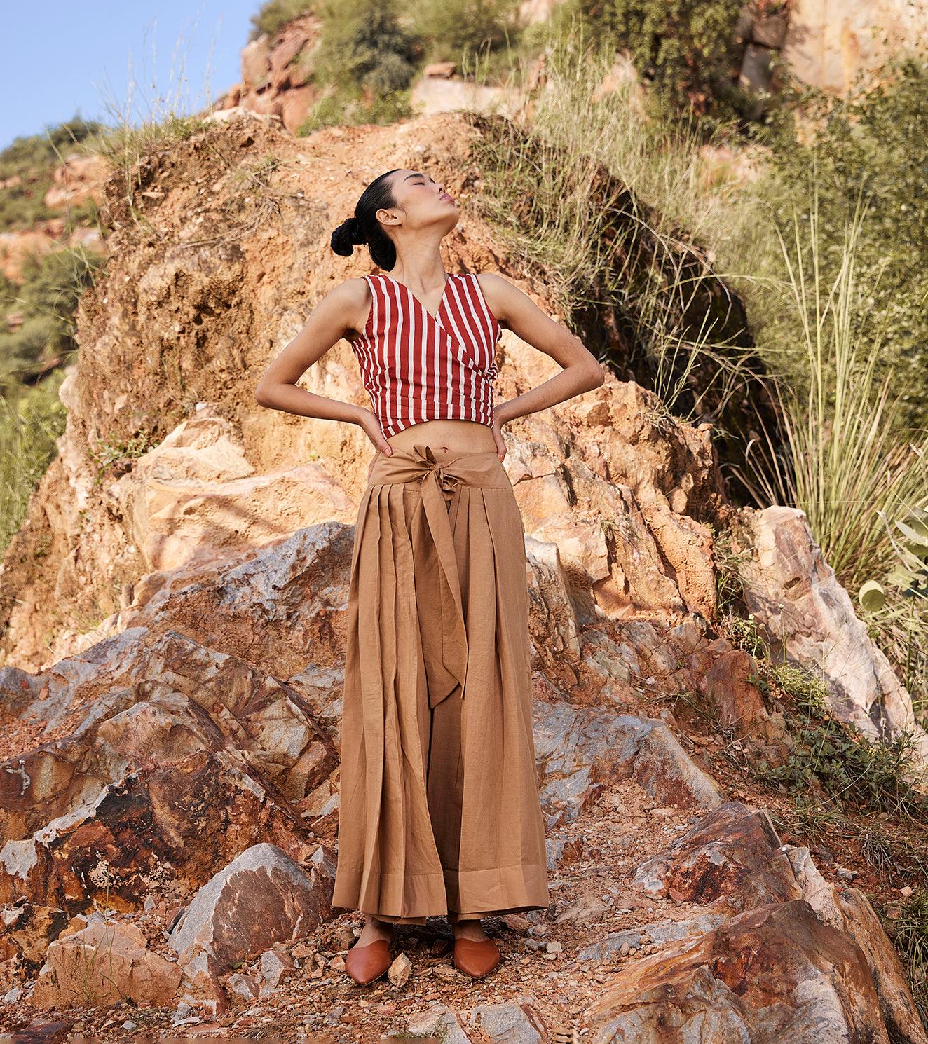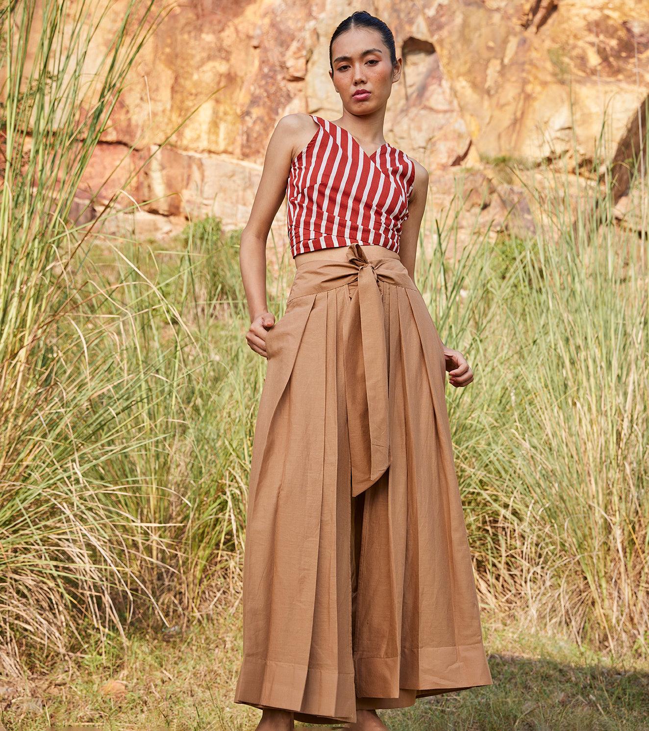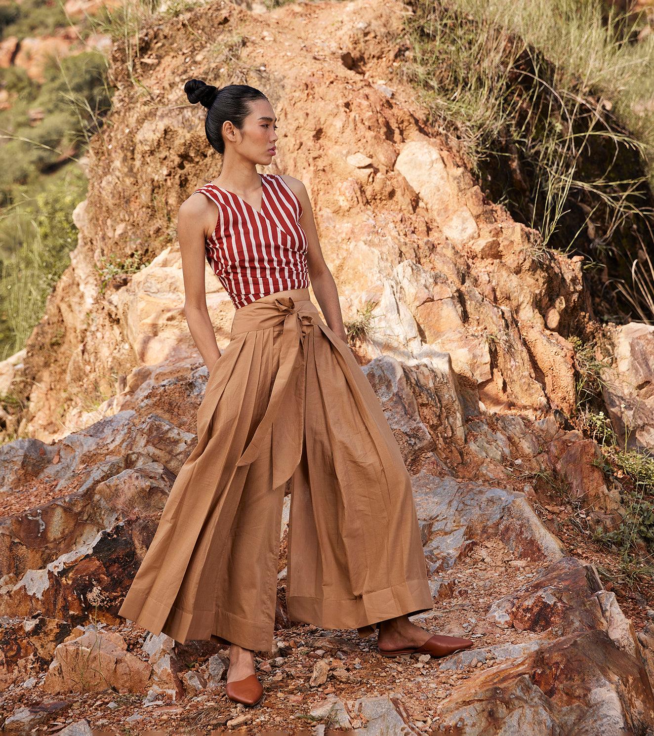 A flared pleated trouser with a front tie up in solid khaki brown and side seam pockets.