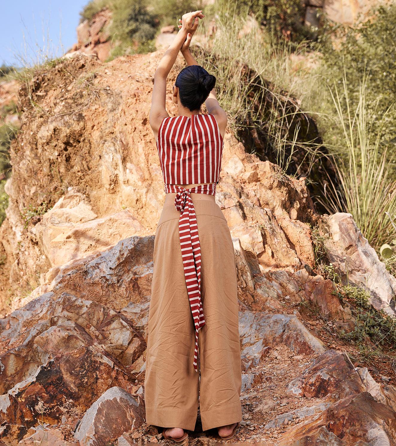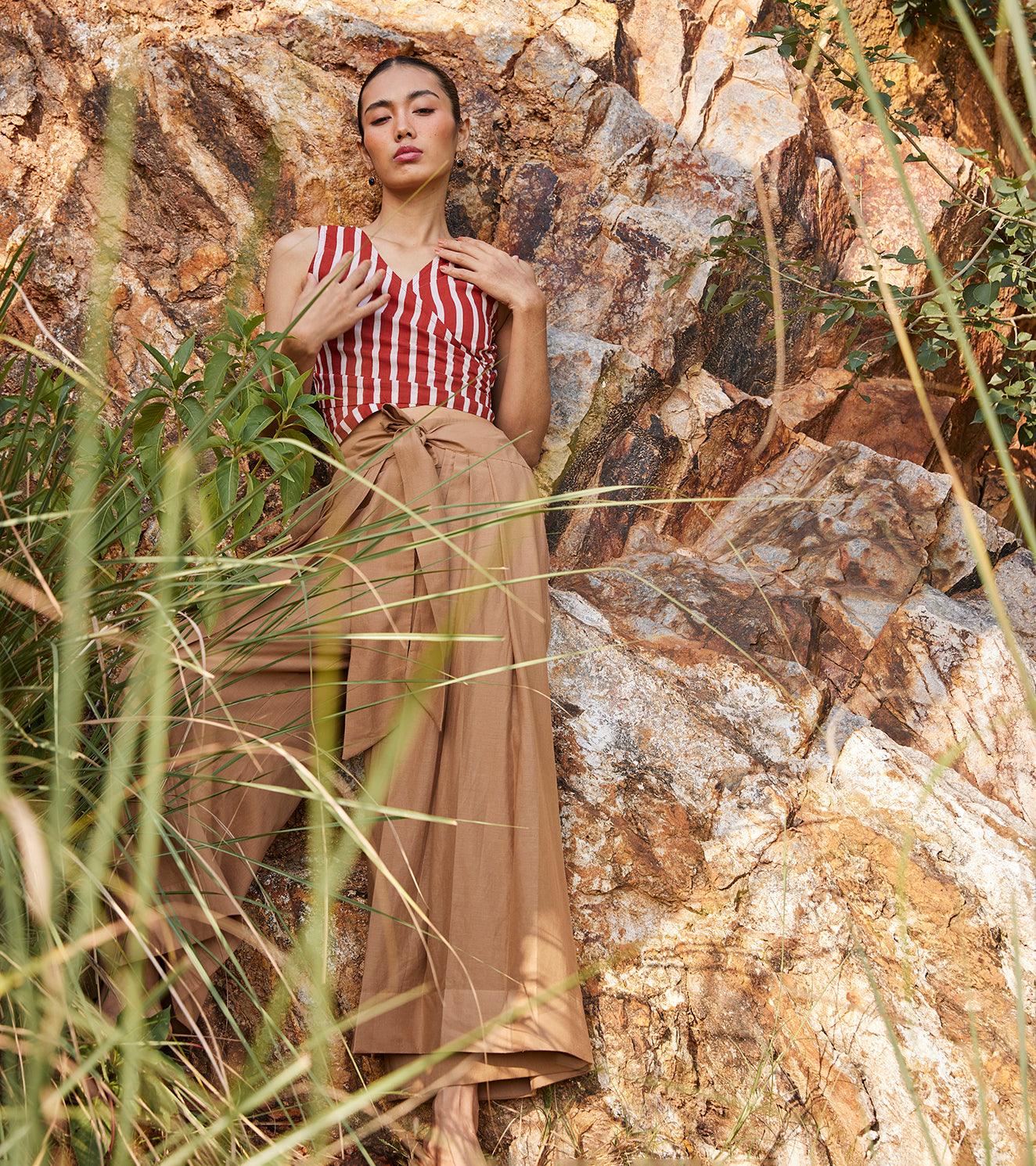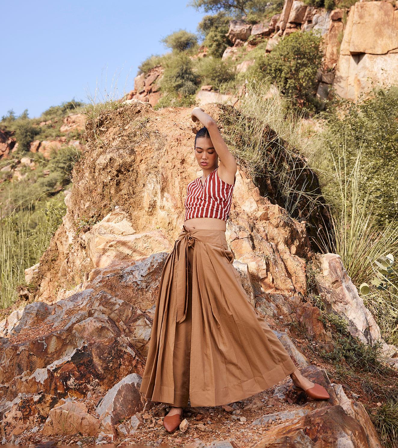 A flared pleated trouser with a front tie up in solid khaki brown and side seam pockets.