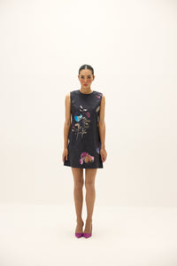 A sleeveless A-line mini dress crafted in Oxford cotton, featuring abstract floral prints in soft bursts of lilac, ochre, and turquoise. Effortlessly structured yet feminine, it transitions seamlessly from daywear to evening edits with minimal styling.
