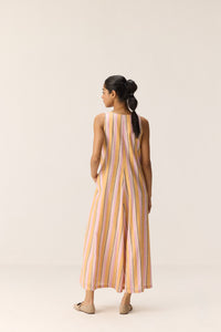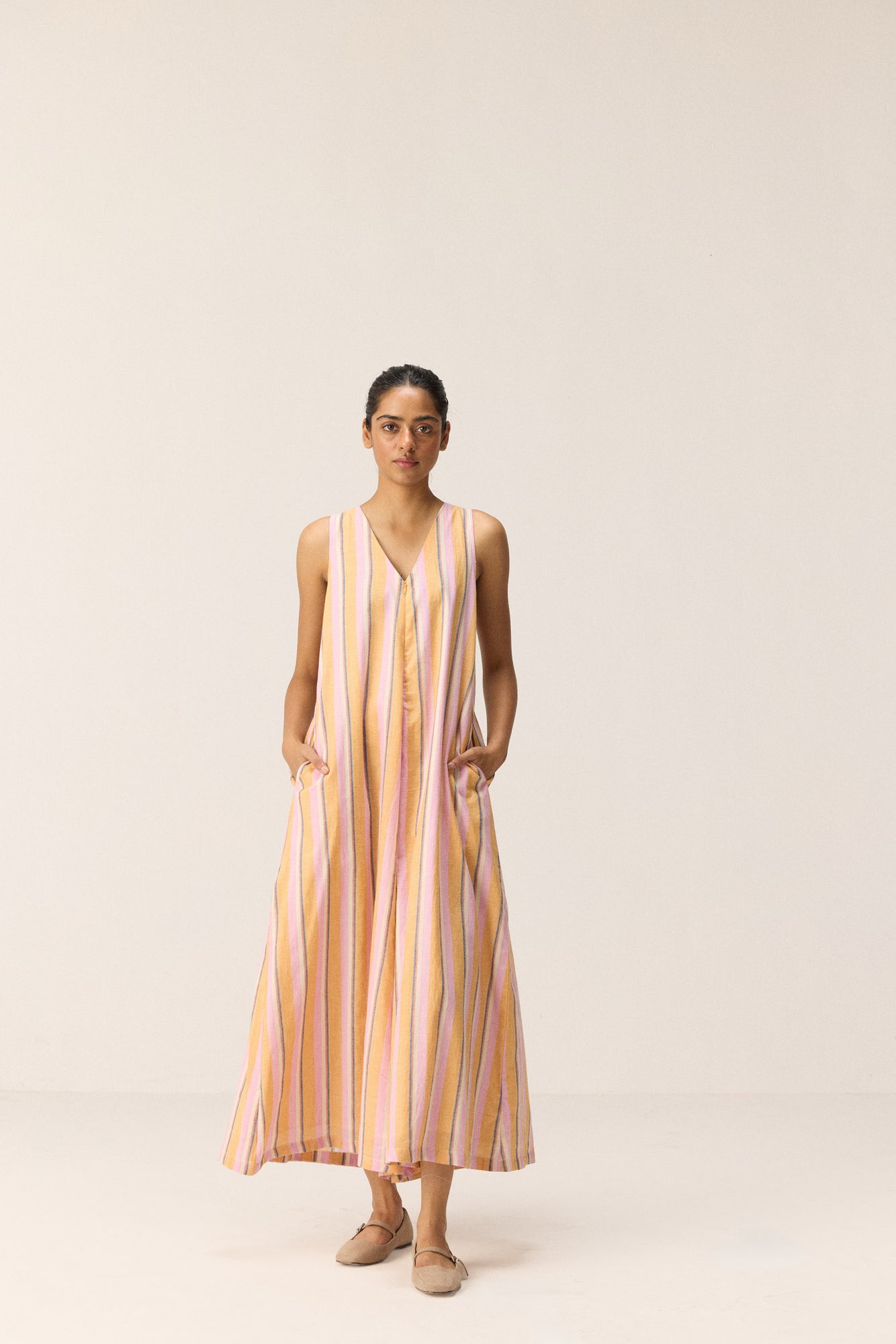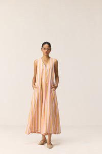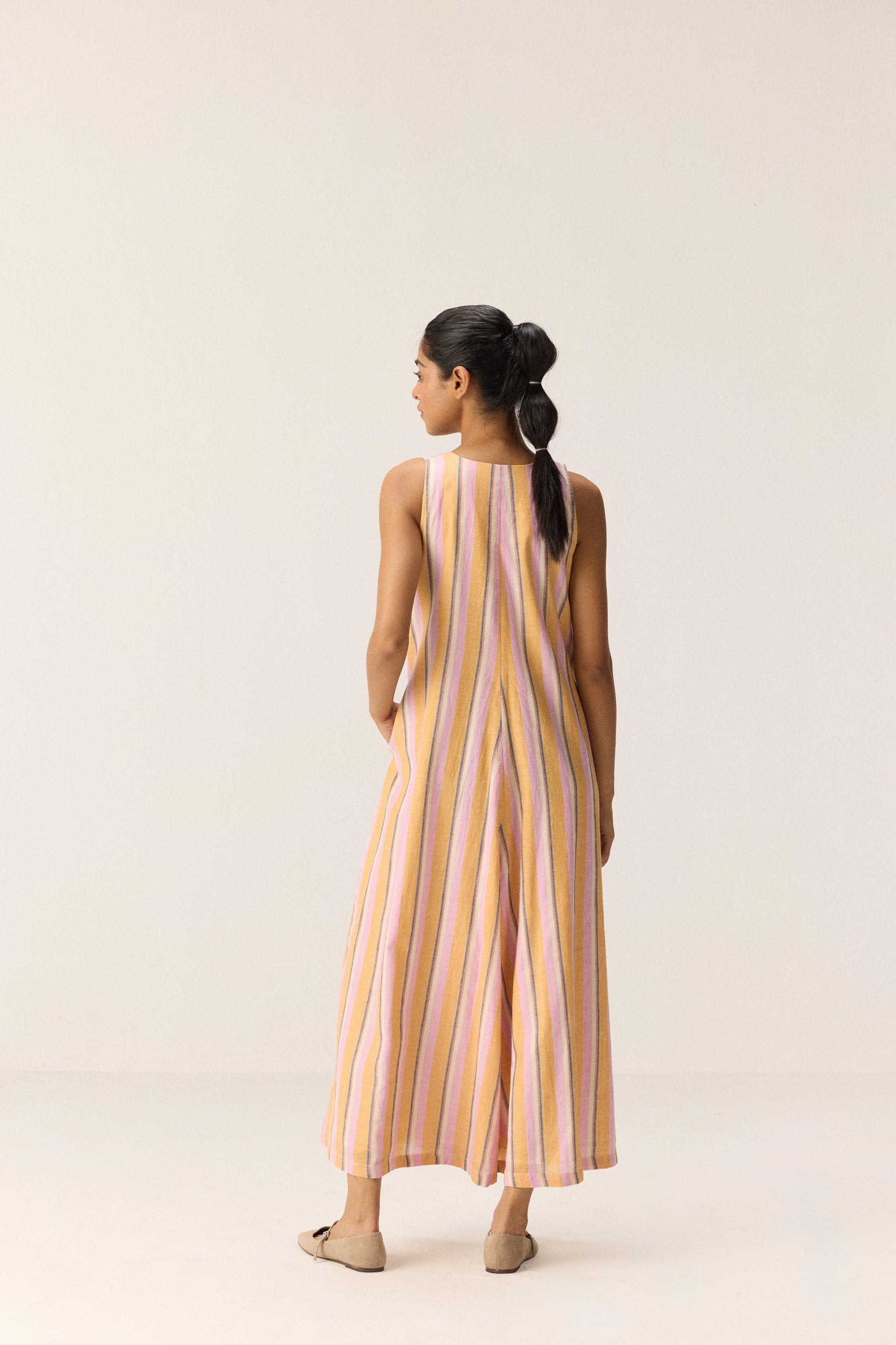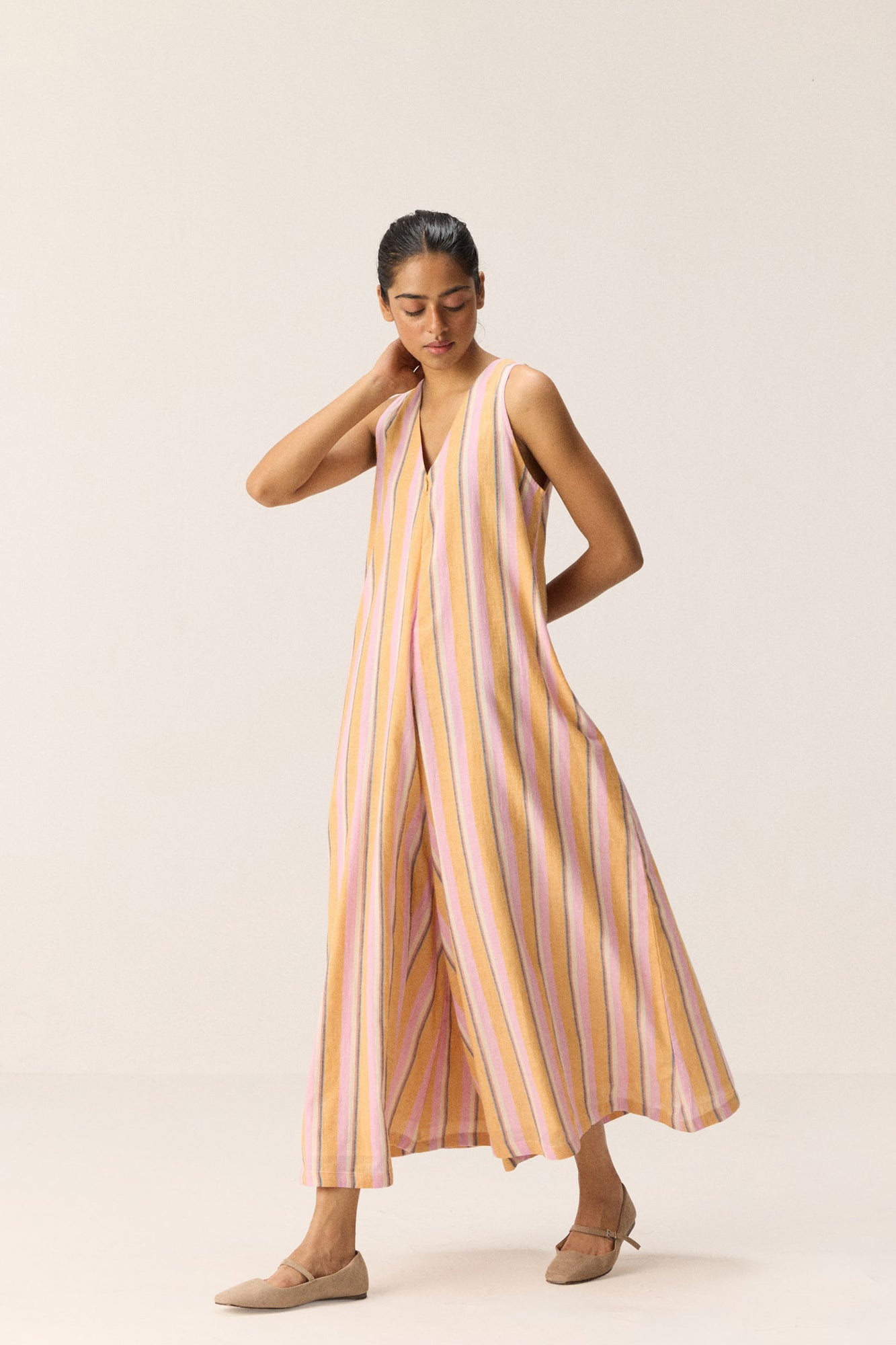 A timeless Khara Kapas silhouette, this jumpsuit features vibrant pink, orange, and white stripes that bring a fresh, playful energy. Designed with a front zipper and practical pockets, it balances classic style with everyday ease—perfectly versatile for any season.