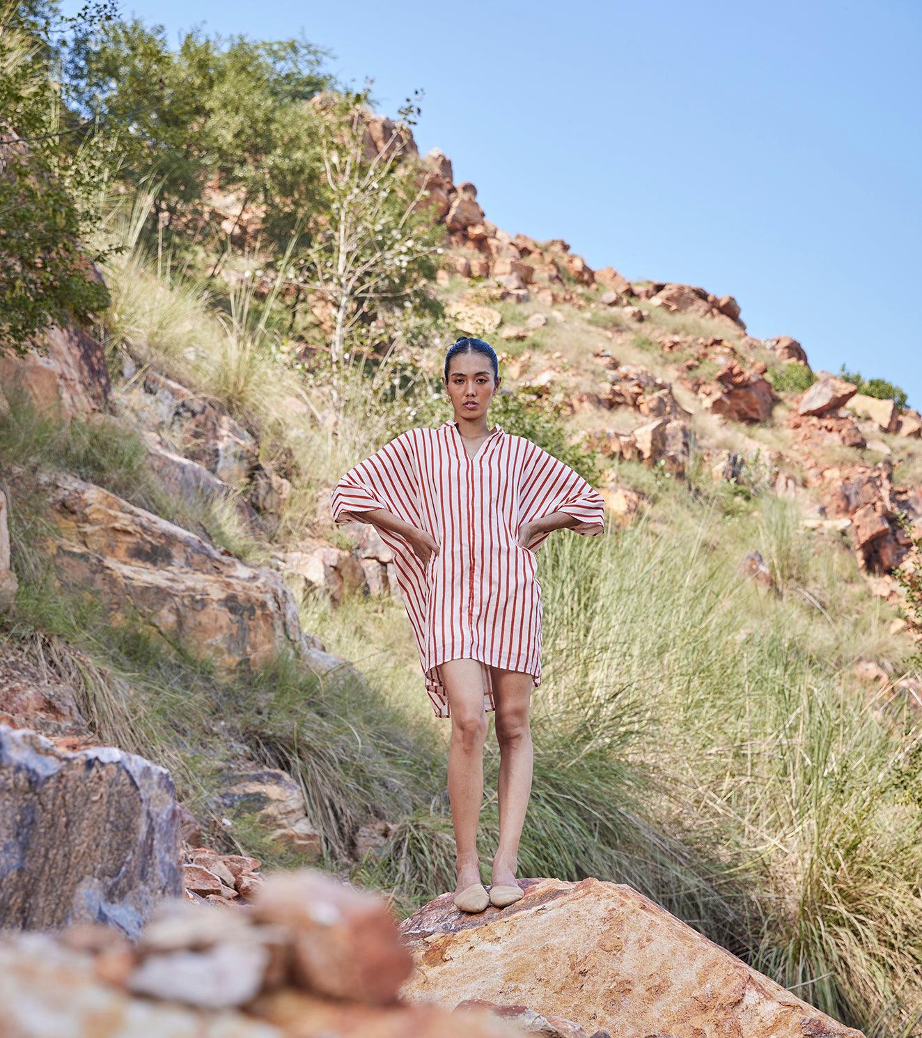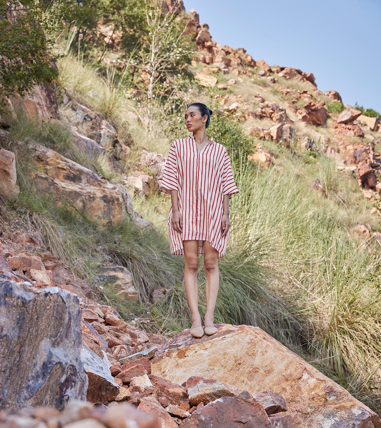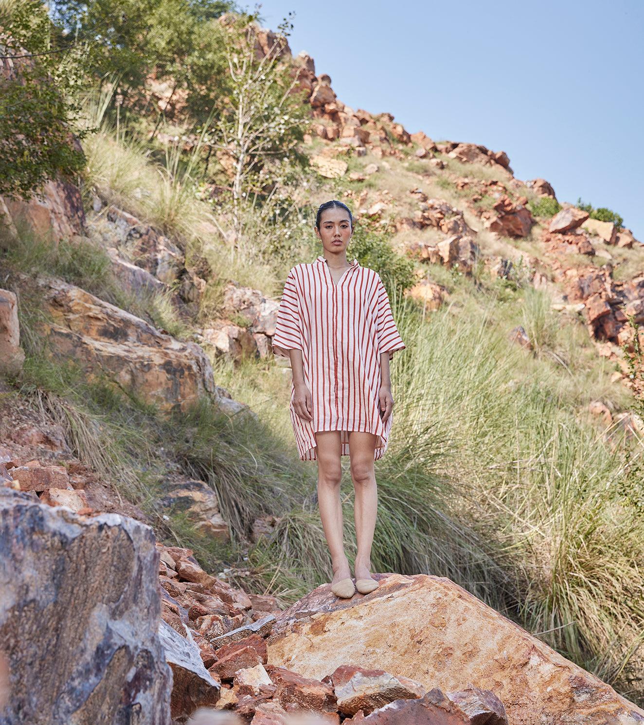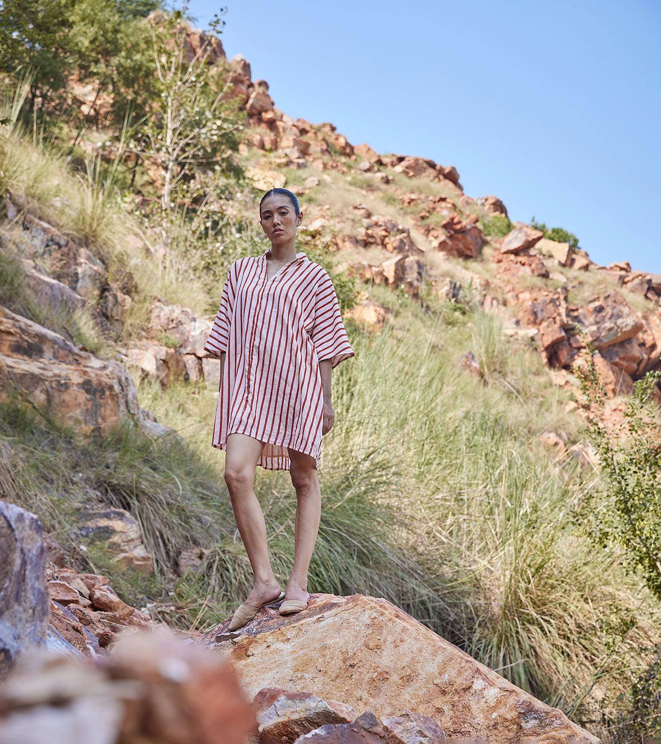 An anti-fit striped shirt dress with a V neckline, mandarin collar, side seam pockets and a drop shoulder sleeve.