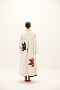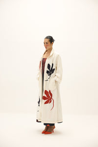 Tailored in sturdy canvas duck, the trench coat reimagines a classic outerwear silhouette with a bold, artistic edge. Its longline frame is elevated with oversized floral motifs in striking red and deep indigo, hand-placed to create a painterly balance across the front and back. Designed with dropped shoulders, a relaxed collar, and roomy sleeves, it layers effortlessly over both dresses and separates. A statement coat that merges structure with fluidity, perfect for transitional dressing.