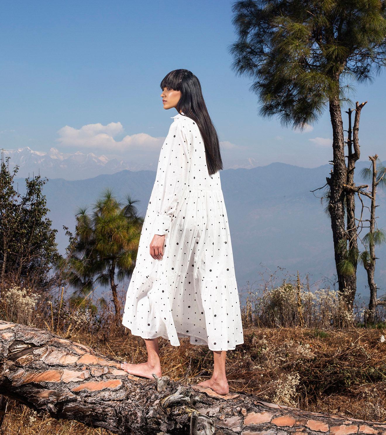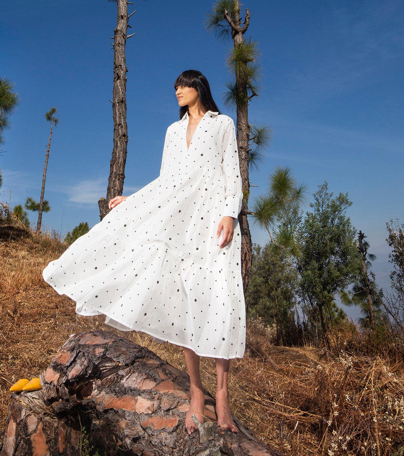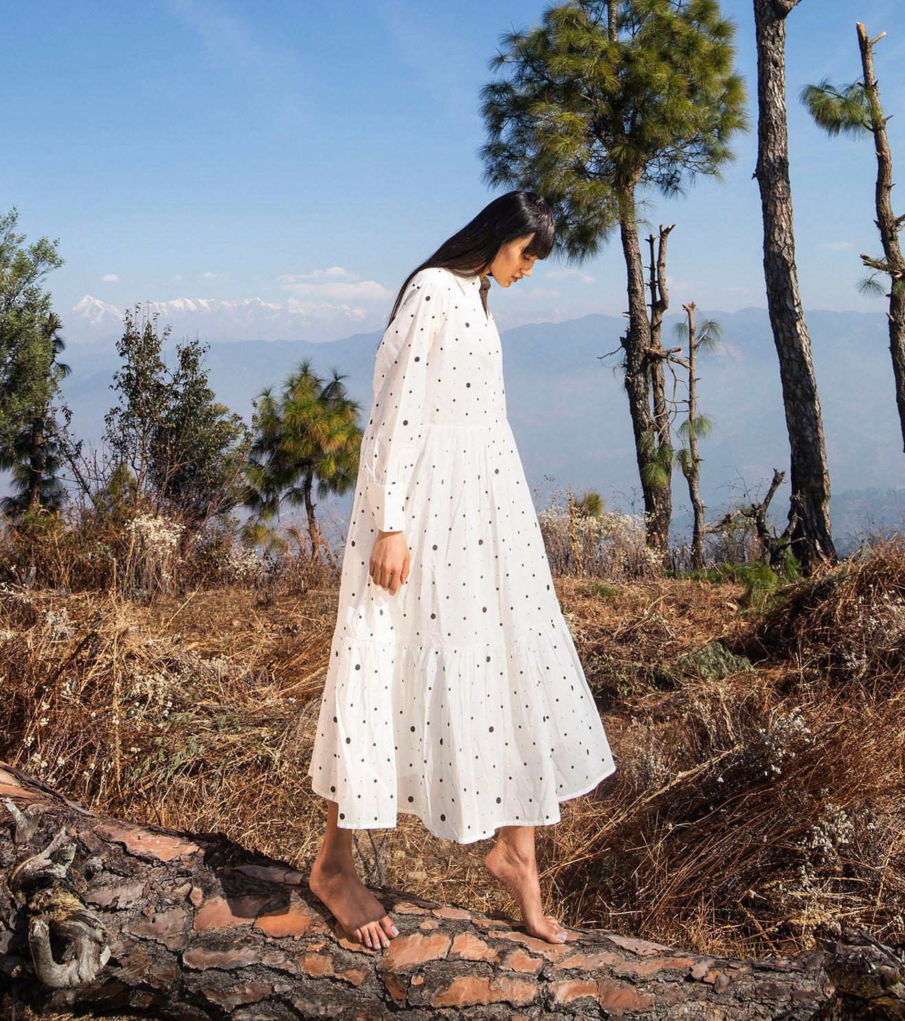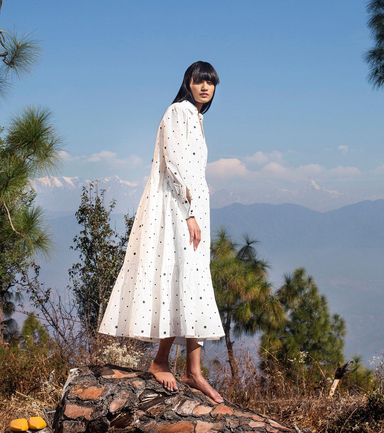 Its not the mountain we conquer but ourselves. Screen printed midi sundress with a collared V-neck, delicately gathered tiers and cuffed sleeves.