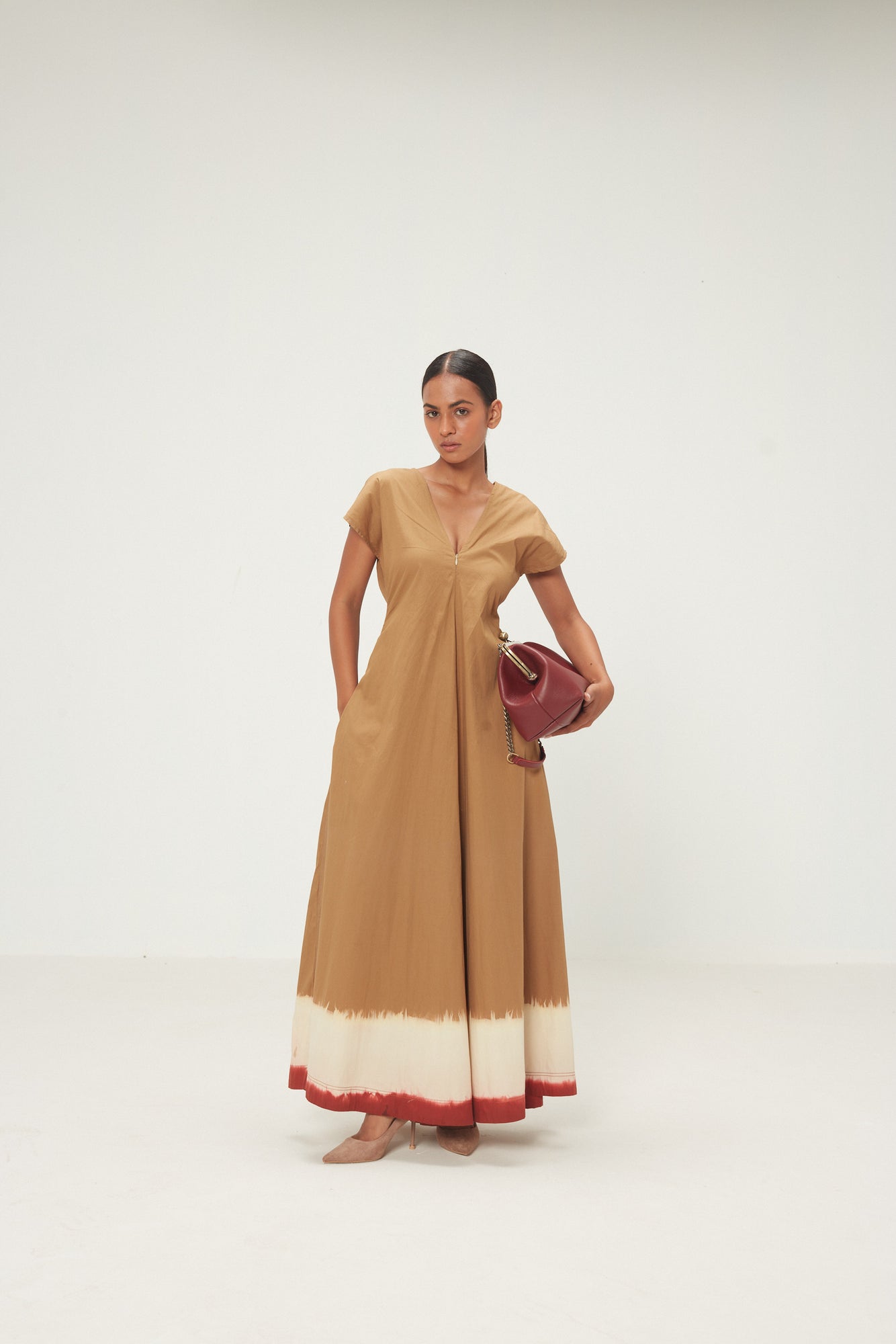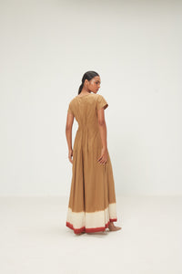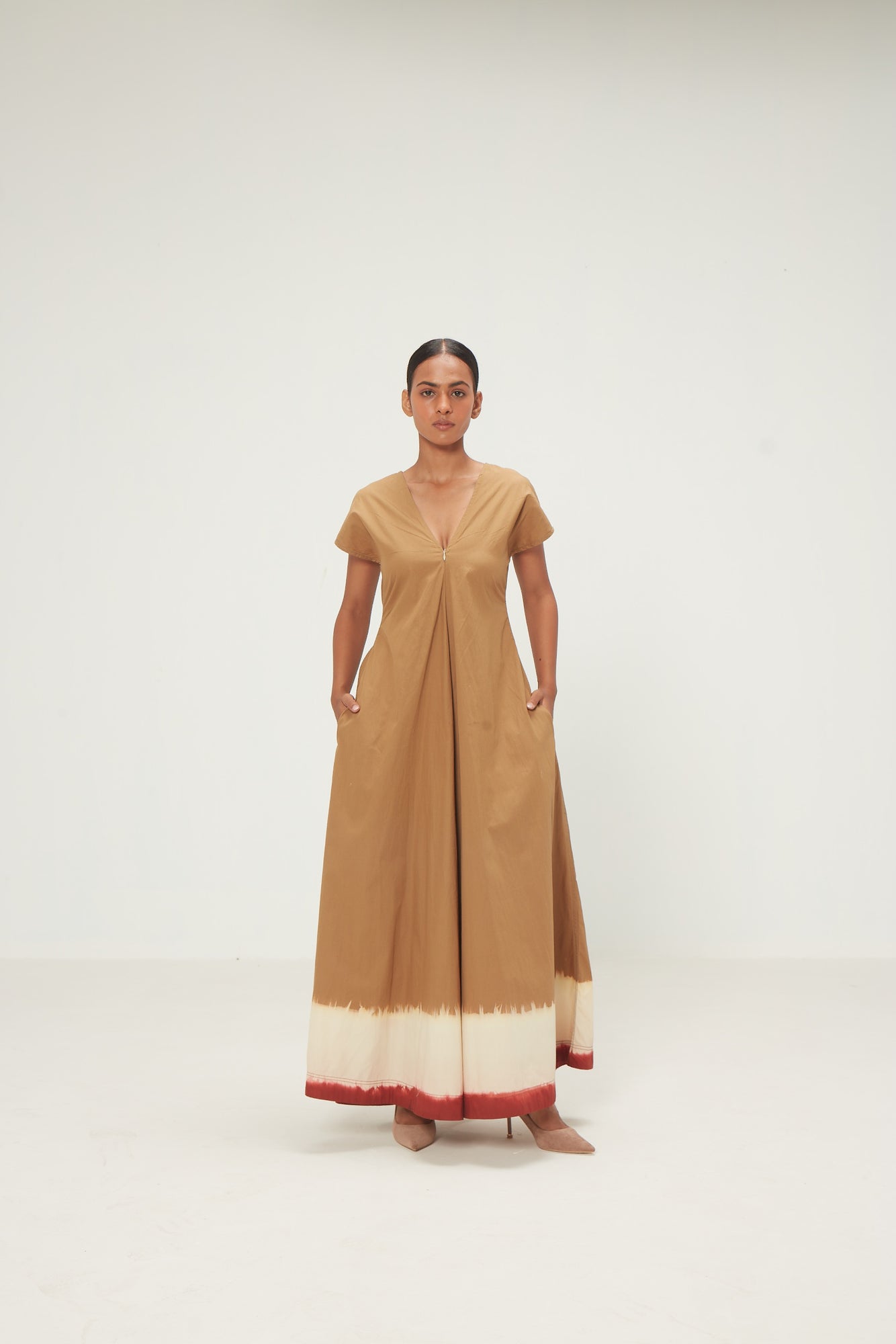 A flowy, wide-leg jumpsuit in sand brown cotton poplin, finished with red and ecru rang kaat detailing at the hem. Designed with a drop shoulder and a relaxed V-neckline, it features a front zip opening for effortless wear and an easy, breezy silhouette. Thoughtfully placed pockets for ease and everyday functionality.
