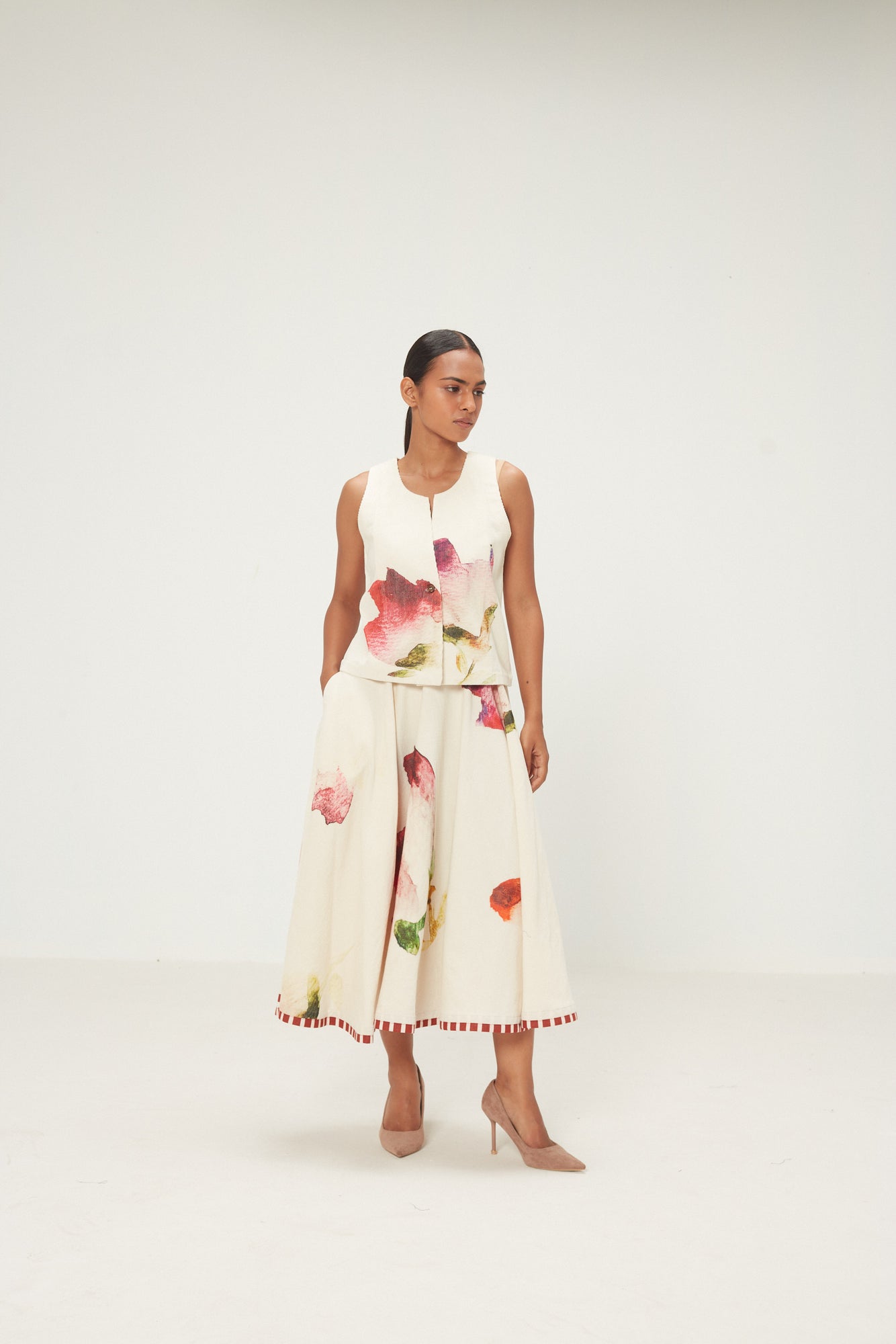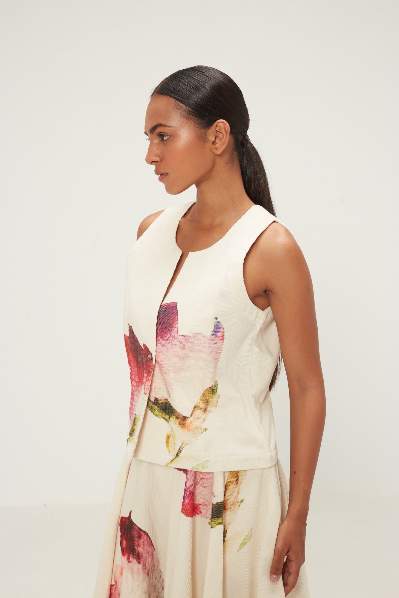 The Mrinal Top is tailored in soft corduroy. Designed with a flattering neckline, button-down front, and welt pockets, it brings modern polish to any look - perfect for layering over shirts or wearing solo for a sharp yet feminine finish.