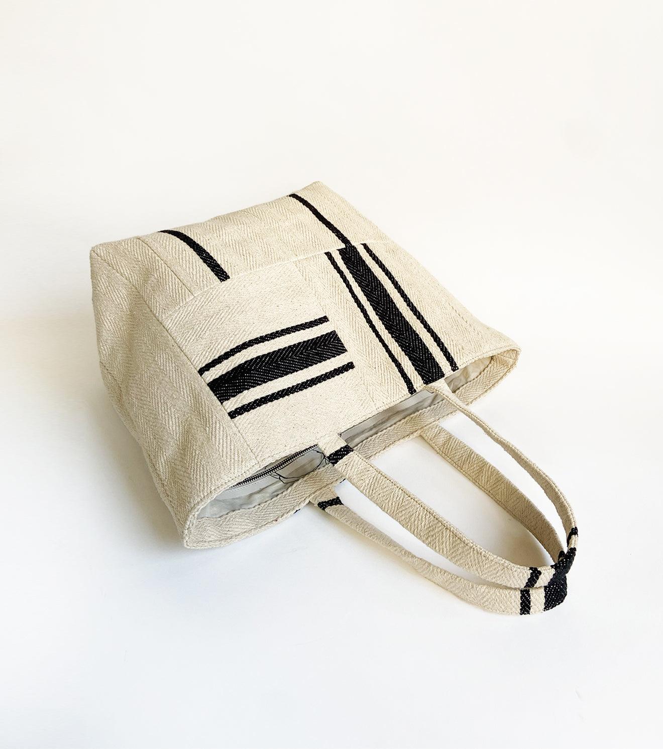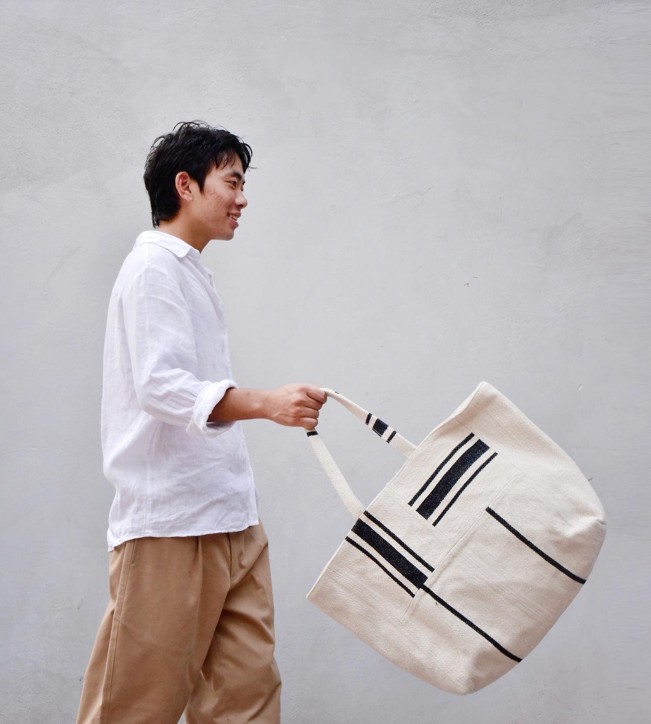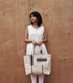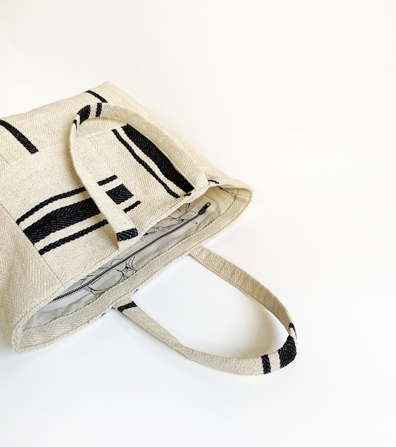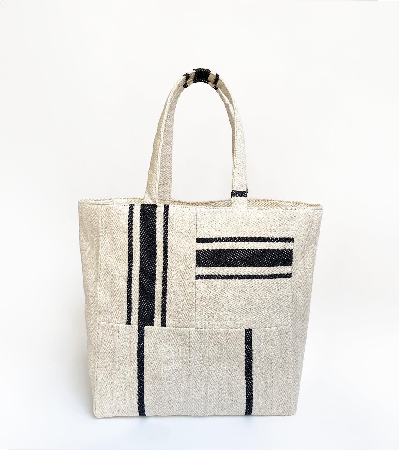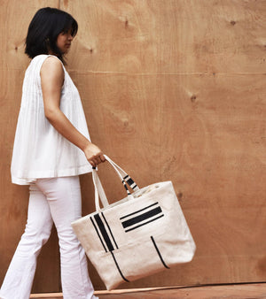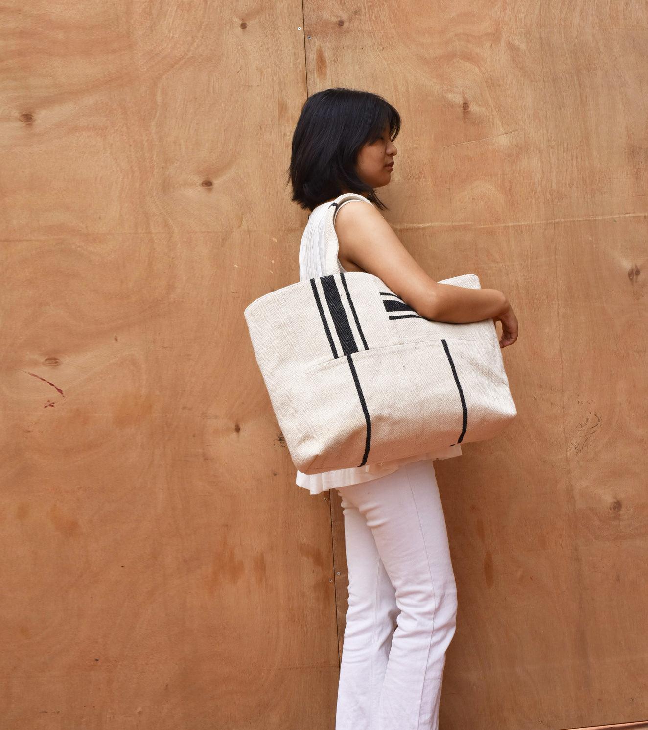 A spacious handloom canvas bag. It comes with two inside pockets (zipper and pouch pocket ). This spacious beauty is for travel, run your errands and for us its the perfect work bag. Washable and durable.