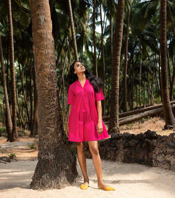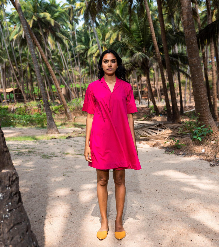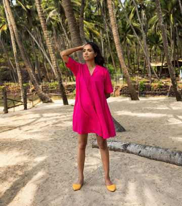 A classic hot pink shirt dress with a anti-fit style to give you a relax and soothing day.