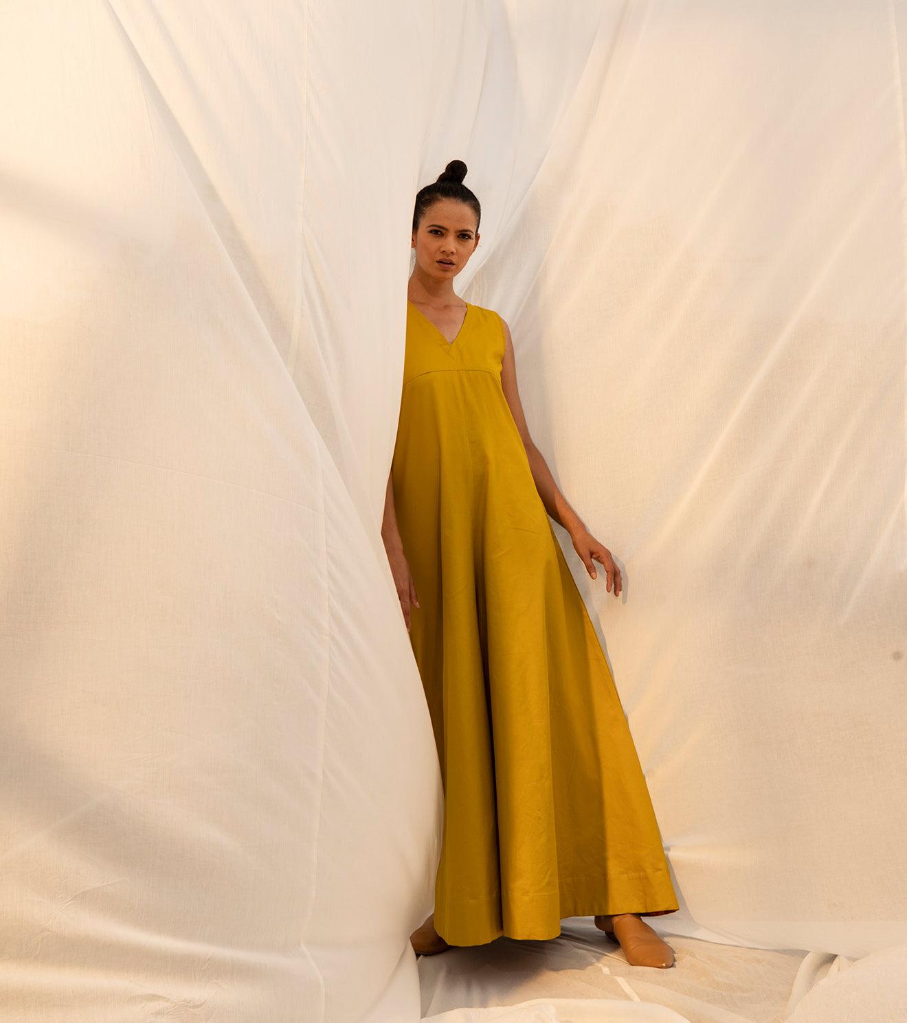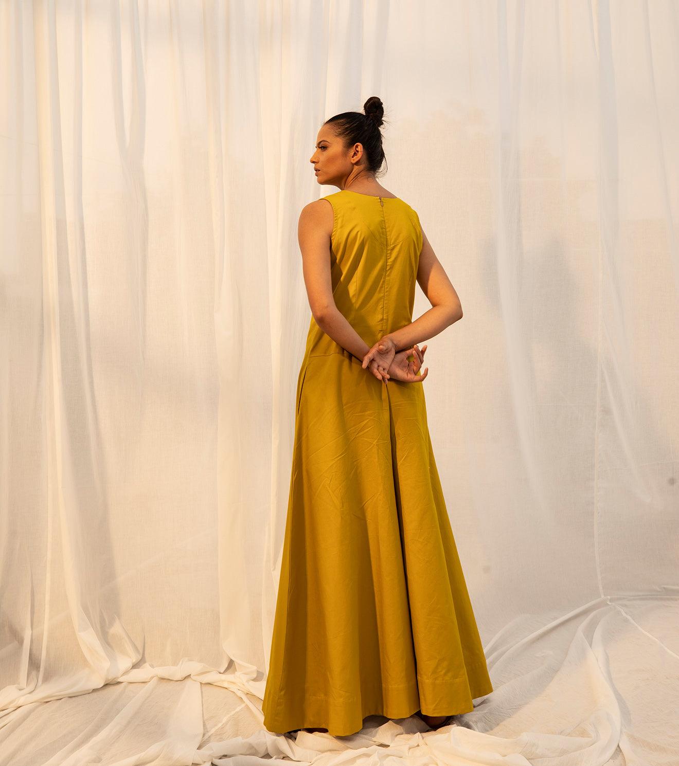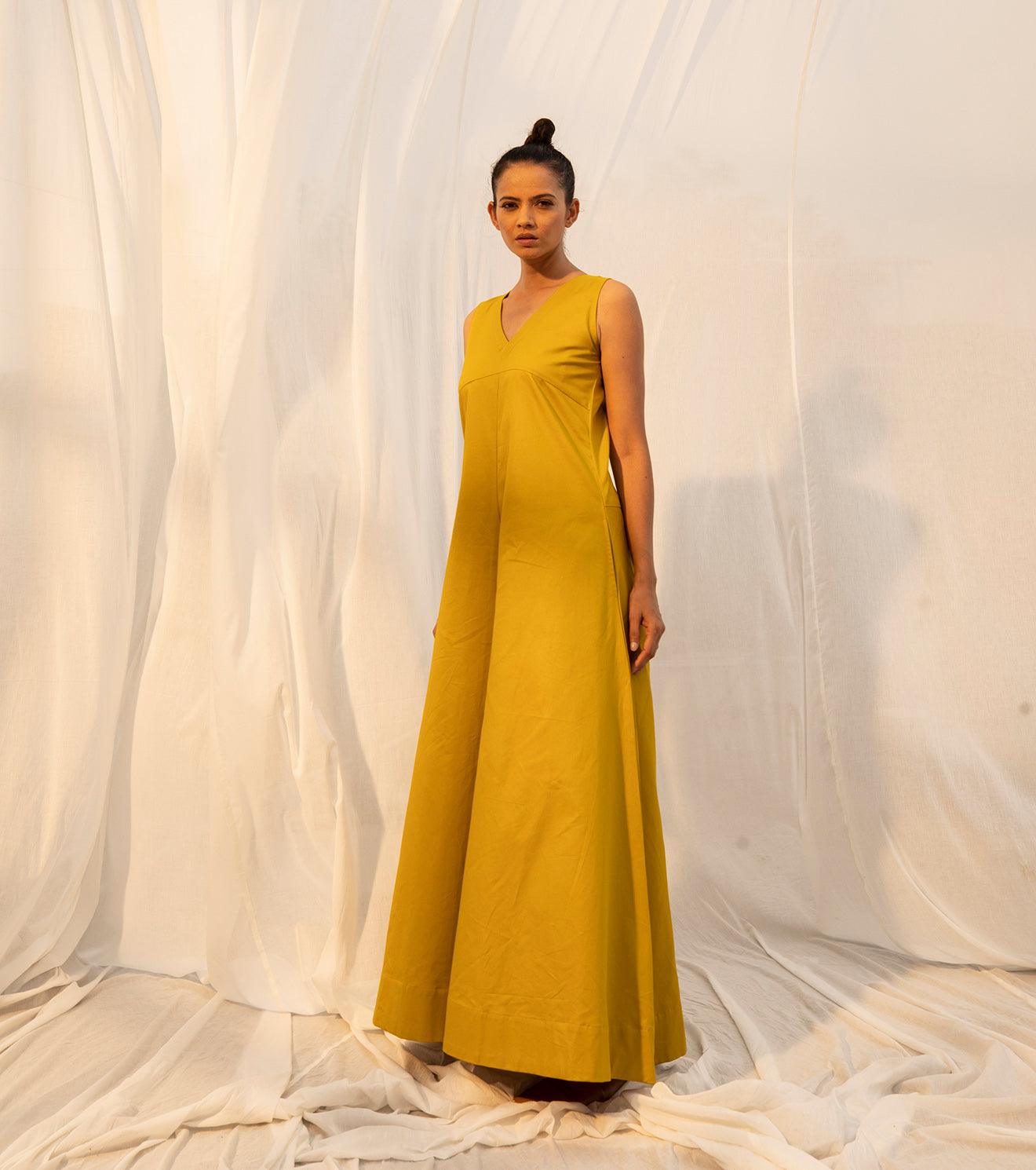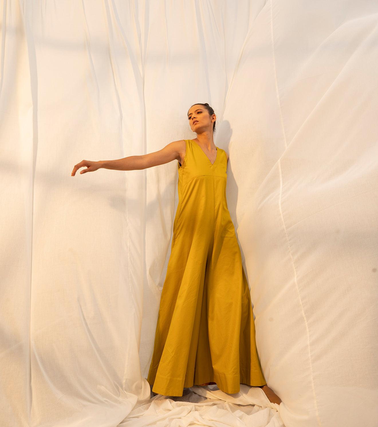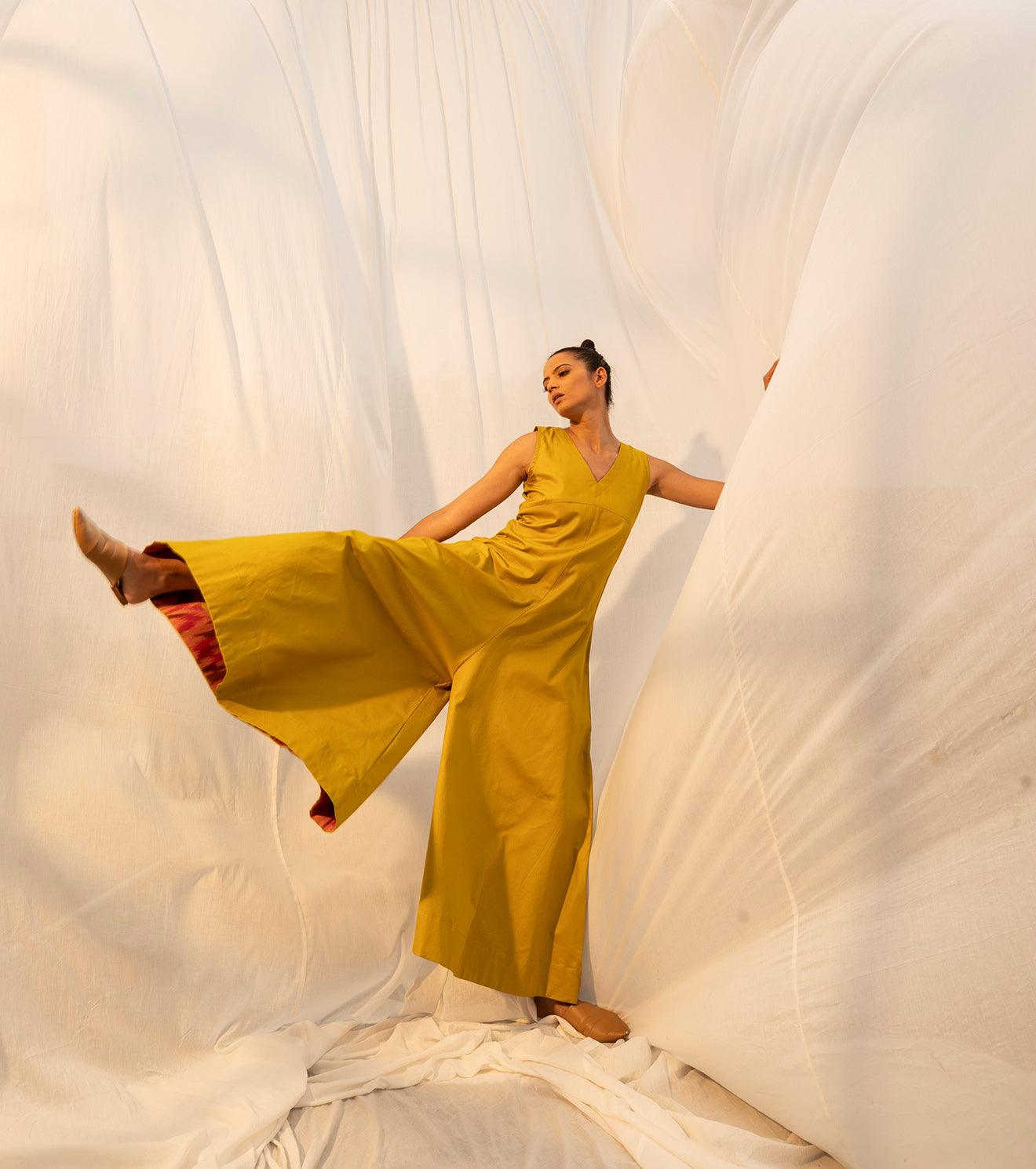 The golden princess has arrived to reflect on the time gone by, and the time to come, but most importantly the time that's golden, seeking nowness in everything. A lime yellow coloured sleeveless jumpsuit for all your momentary pleasures. Comes with a V neckline, empire yoke, flared bottoms, and ikat detailing on the inside.