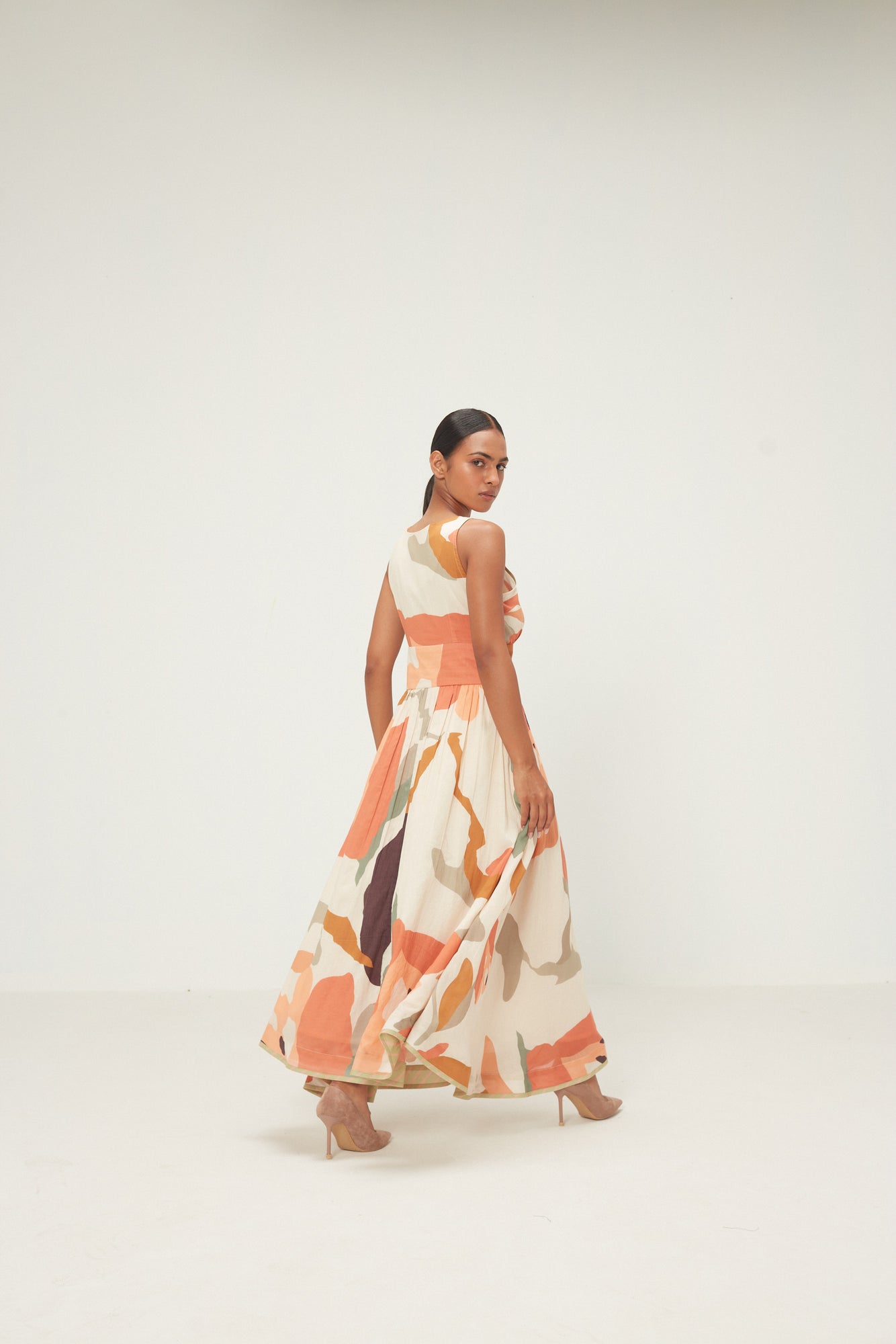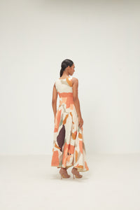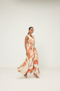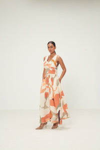 A breezy sleeveless dress in soft cotton mul, featuring a gentle V-neckline and a fitted bodice that flows into a voluminous gathered skirt. Rendered in an abstract floral print with warm shades of coral, peach, and earthy tones on an ecru base, the silhouette moves with quiet ease. Thoughtfully placed pockets for everyday functionality. It has a zipper opening along with lace details.