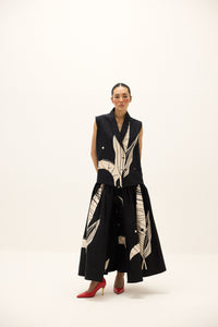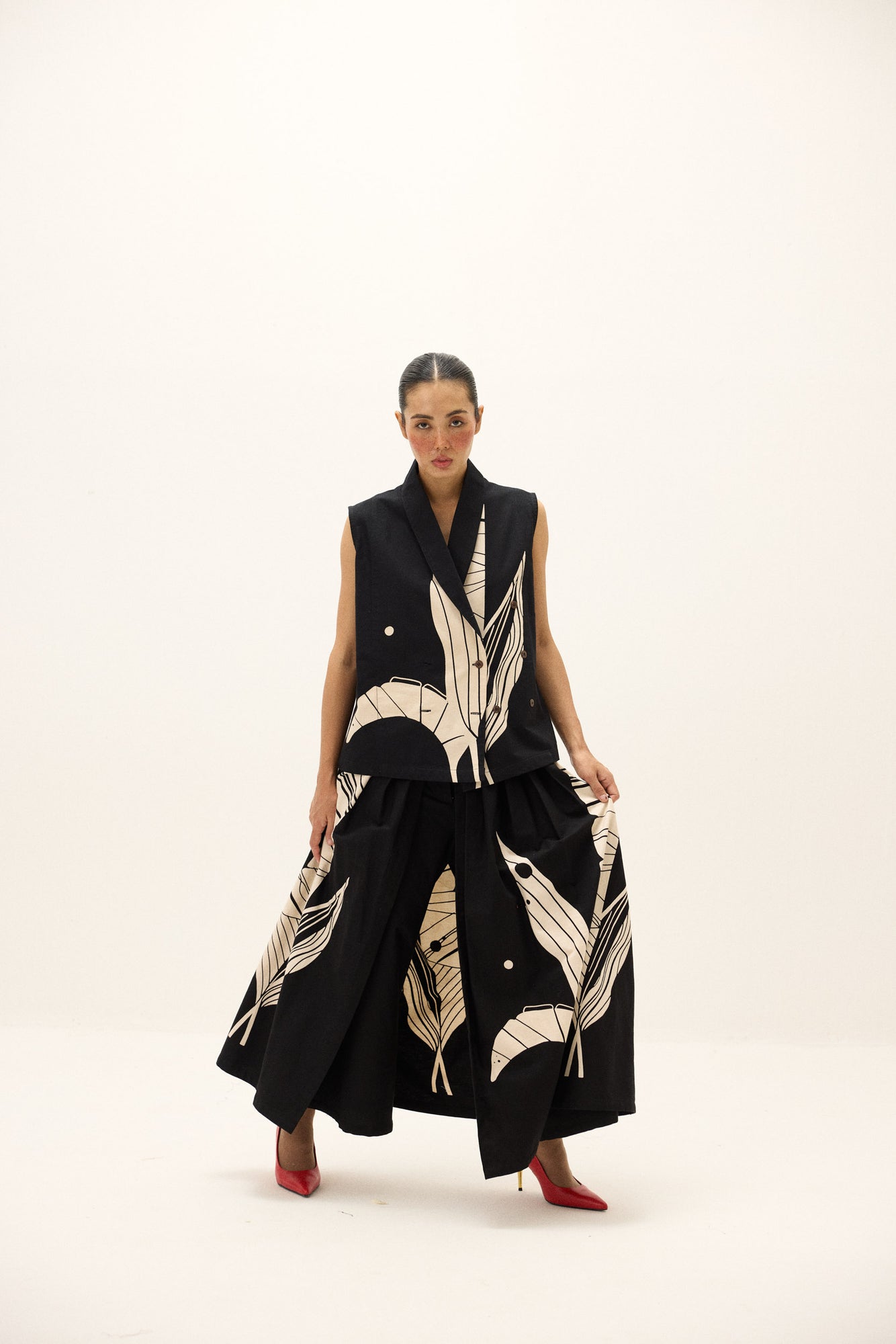 A contemporary co-ord set crafted in cotton oxford, featuring bold ivory palm motifs hand-rendered across a deep black base. The sleeveless double-breasted vest with a structured collar pairs effortlessly with wide, flared pants, creating a sculptural yet fluid silhouette. Thoughtfully tailored, it blends statement printwork with minimal form - refined, versatile, and timeless.