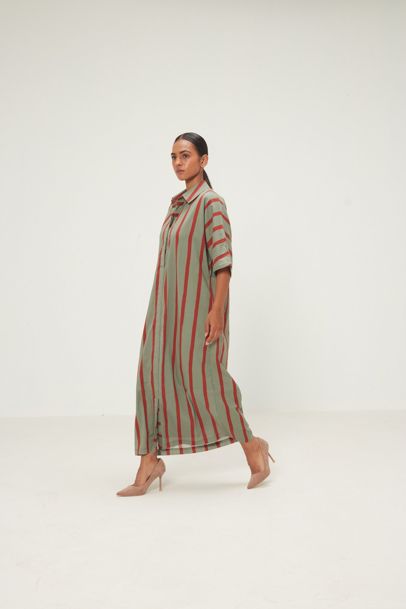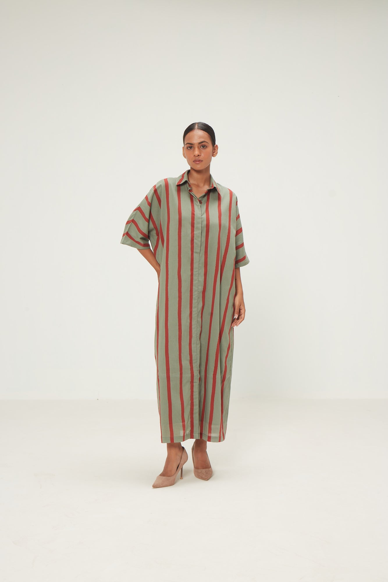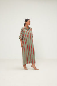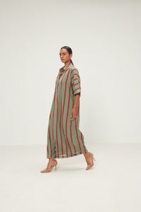 A relaxed Long shirt dress with kimono sleeves in handwoven cotton mul, featuring vermillion and sage stripes print. Detailed with a classic collar, concealed placket, and curved hem, it offers a refined yet easy silhouette with subtle side slits for movement.