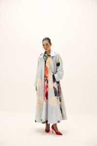 A longline coat in crisp poplin, brought to life with oversized painterly florals in vivid strokes across a pastel base. Featuring a wide collar, front opening, and pleated back detail, it drapes with ease while adding structure to layered looks.