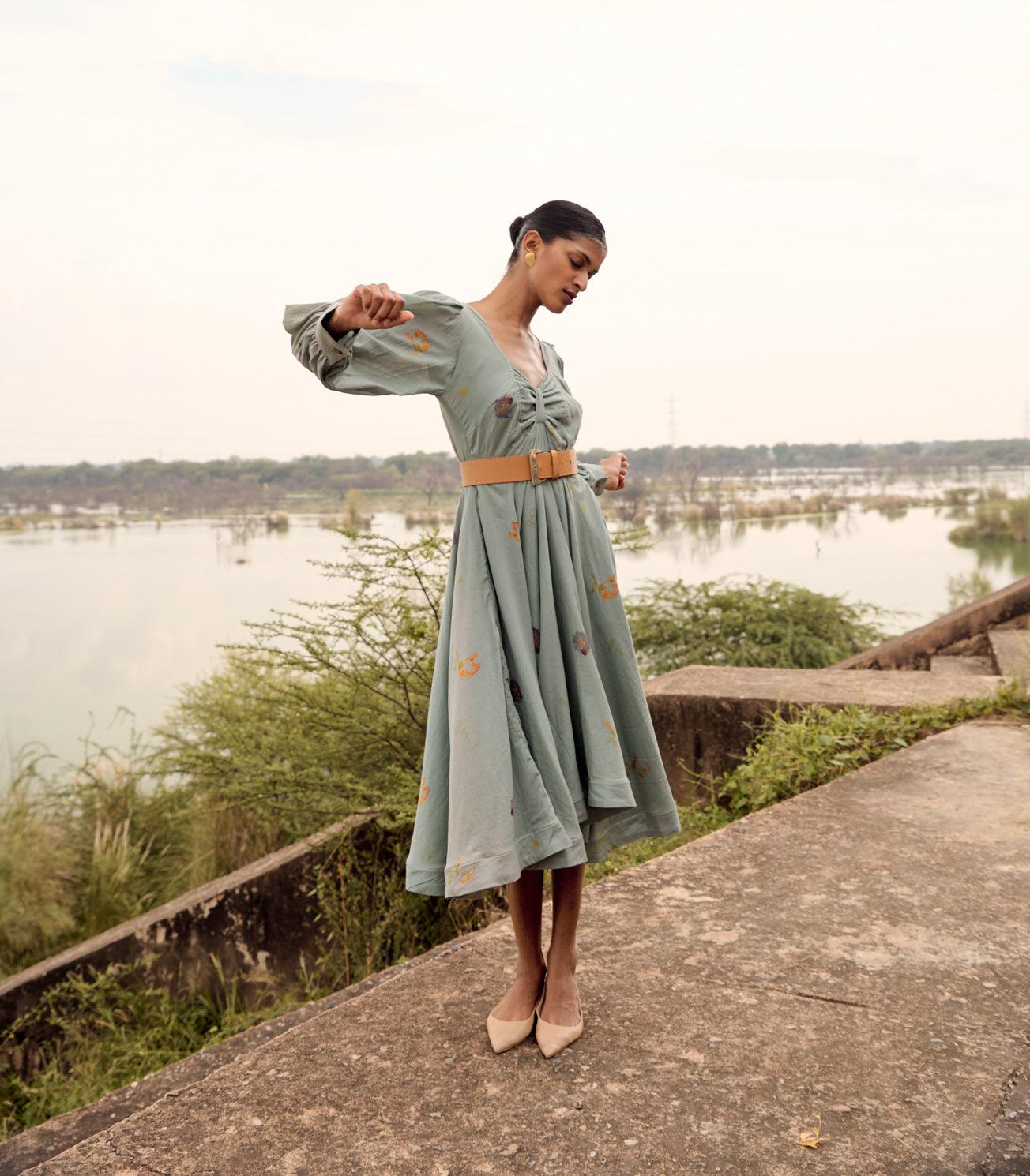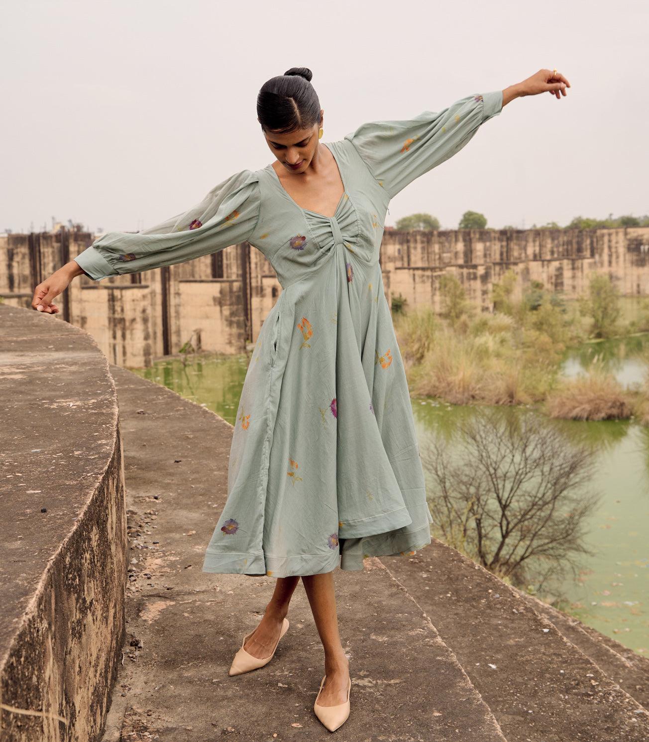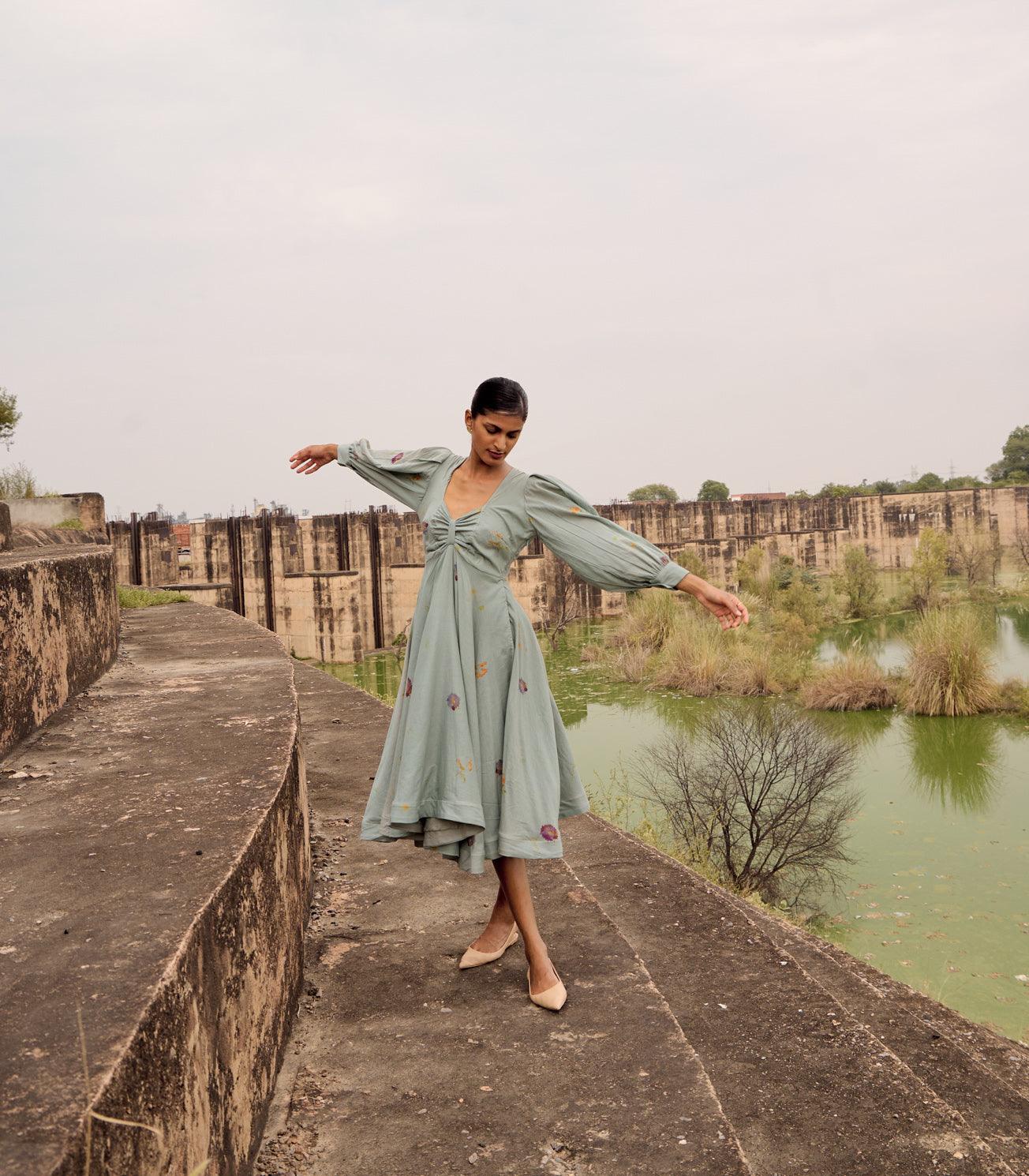 A cadet blue mul dress with front gathered panel, side zipper opening and full sleeves with button cuff opening.
