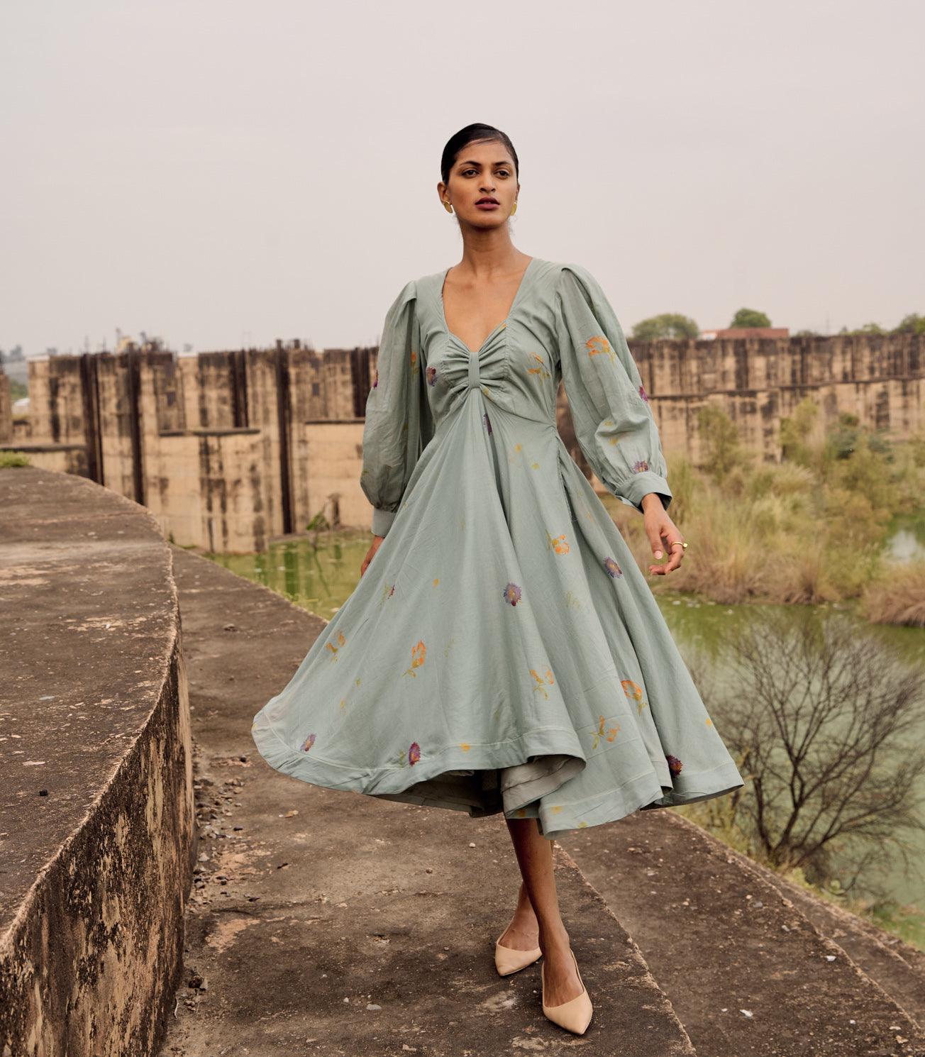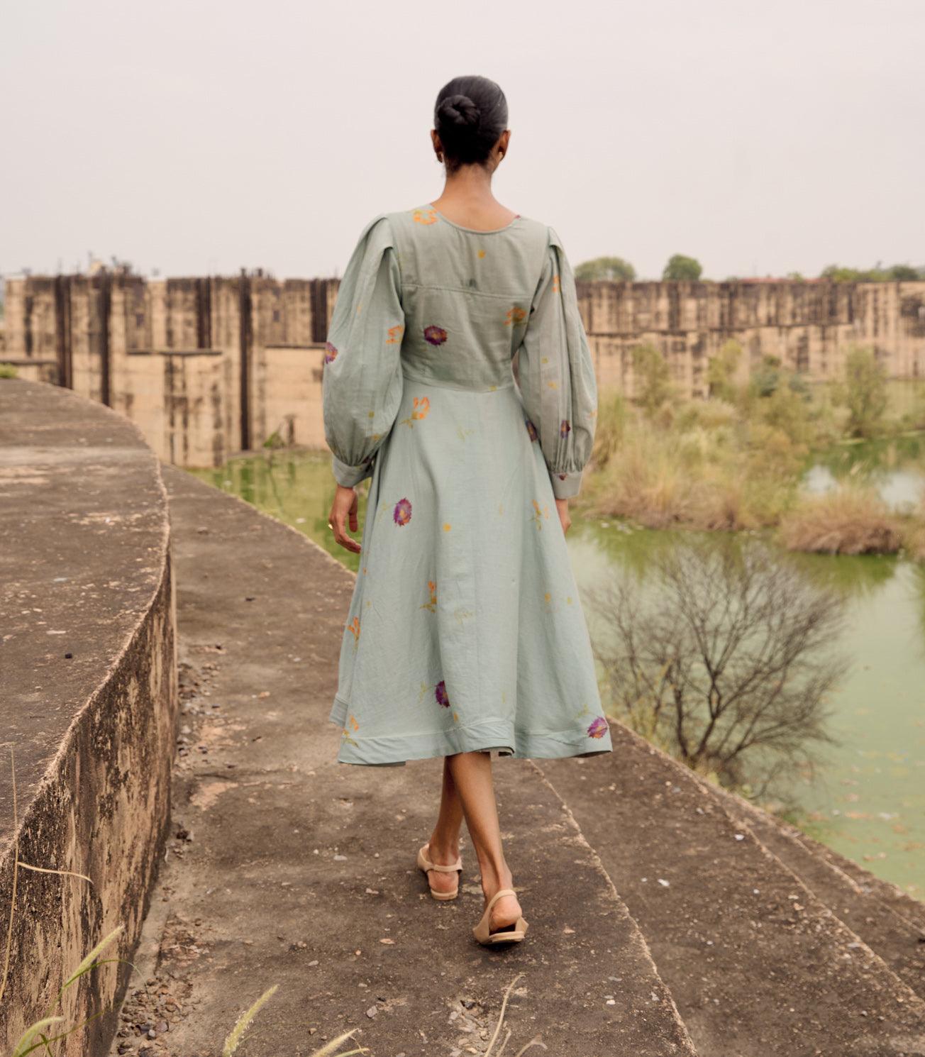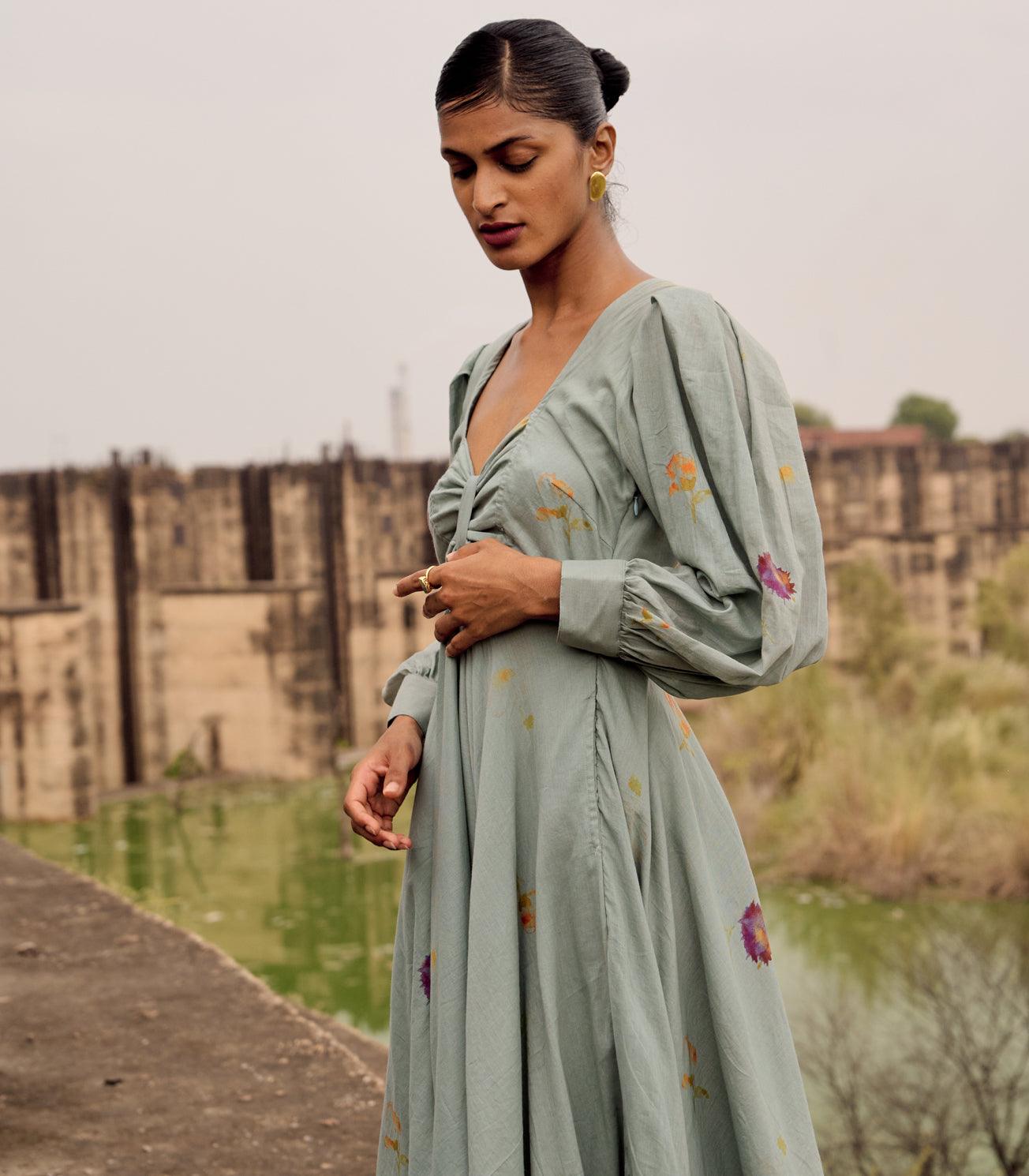 A cadet blue mul dress with front gathered panel, side zipper opening and full sleeves with button cuff opening.