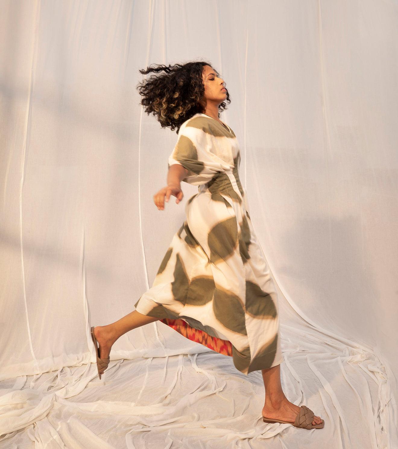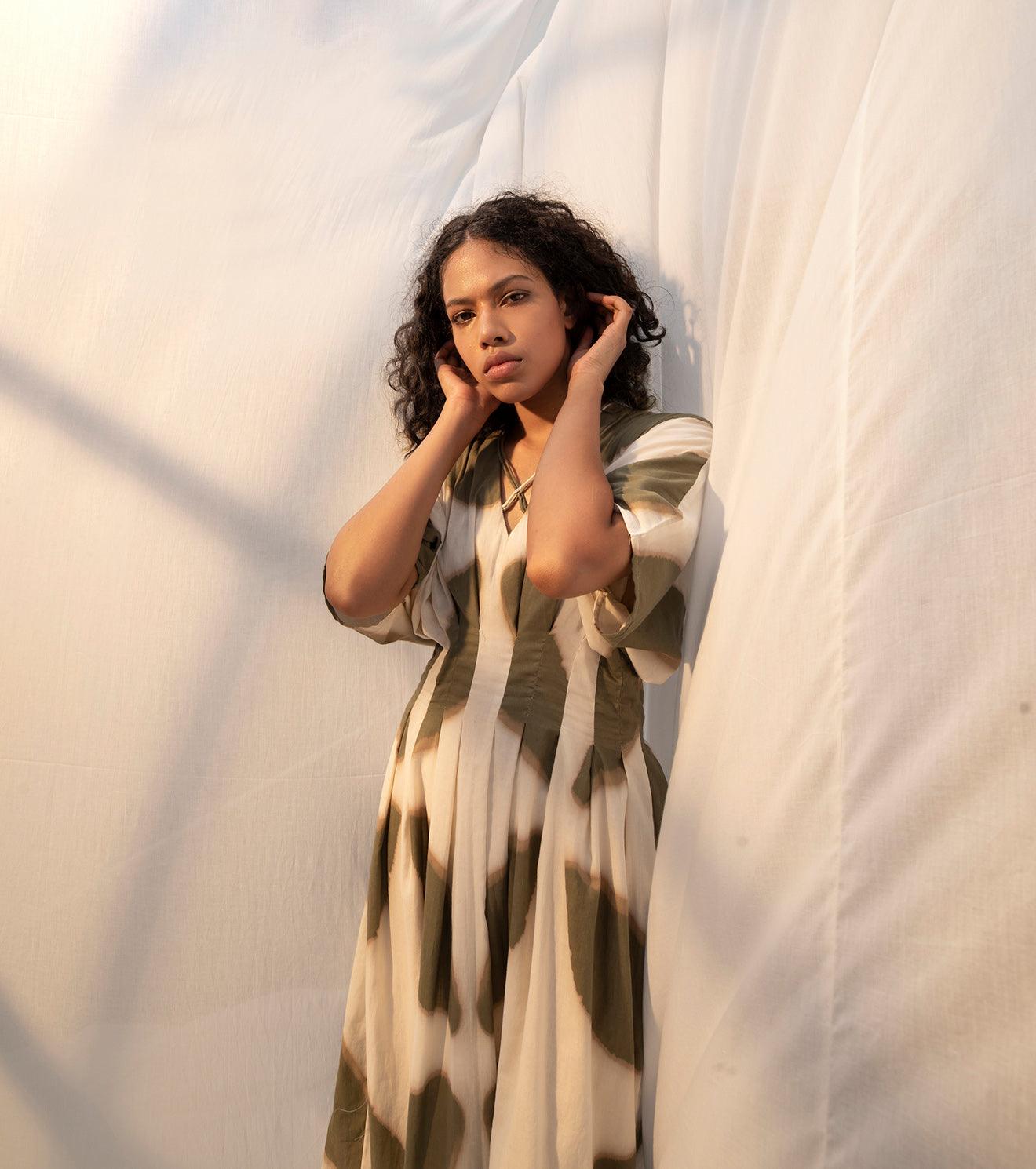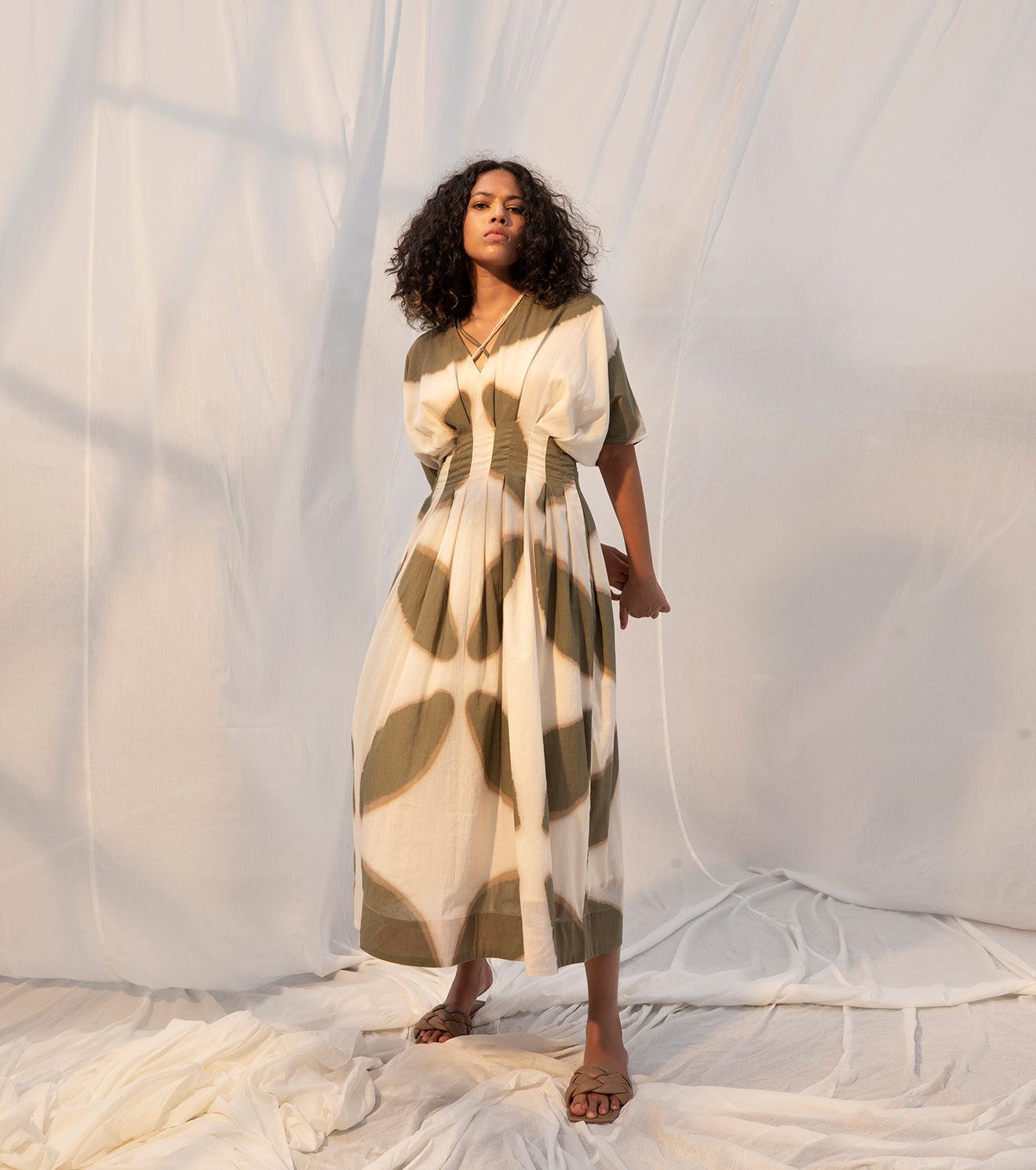 Do not turn your head to the withering foliage my love. It's the change of seasons that marks new beginnings. Wasabi Green dress with pleat detailing. Kaftan sleeves with elastic band at back and cris-cross strap detailing at neck.