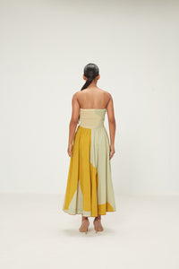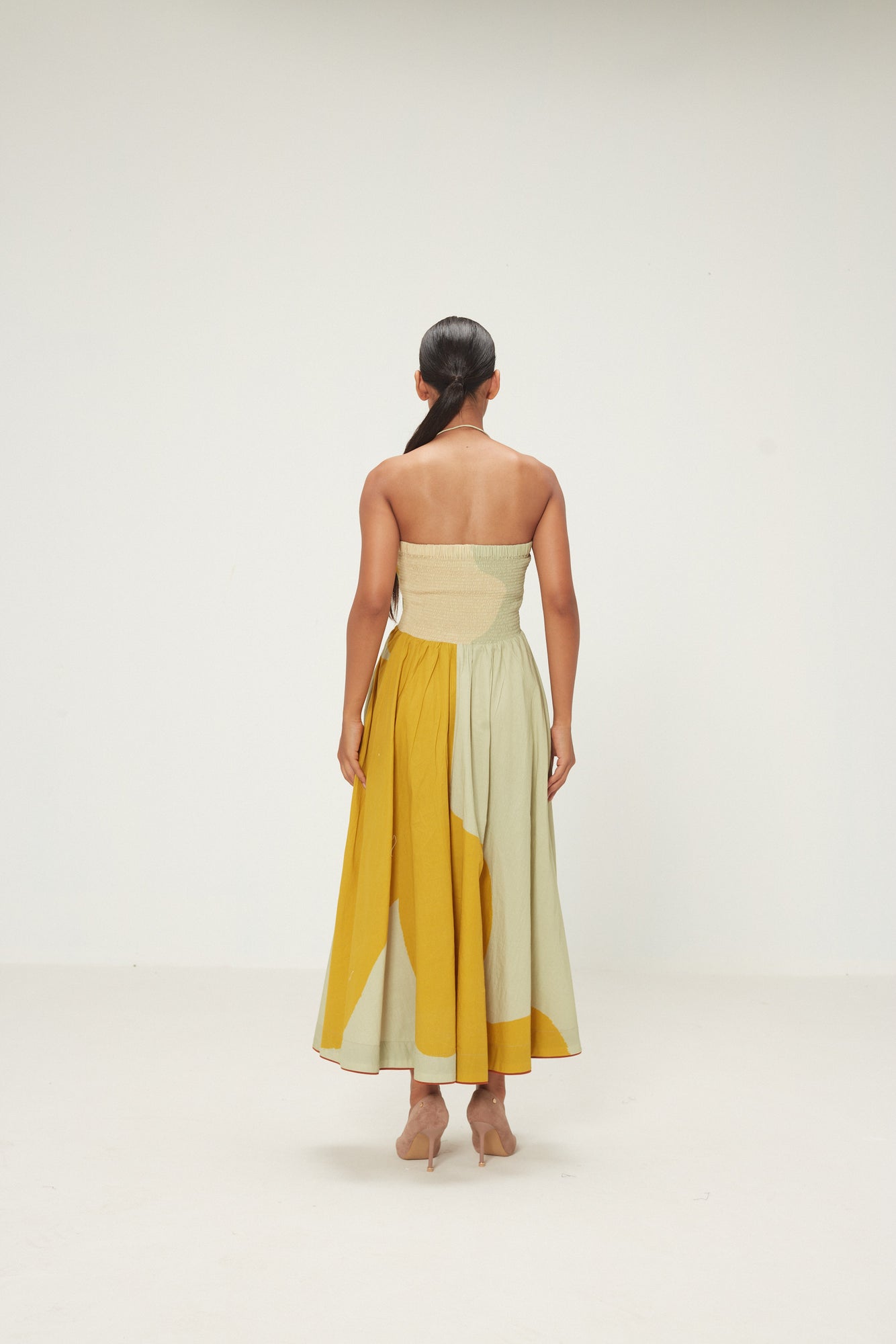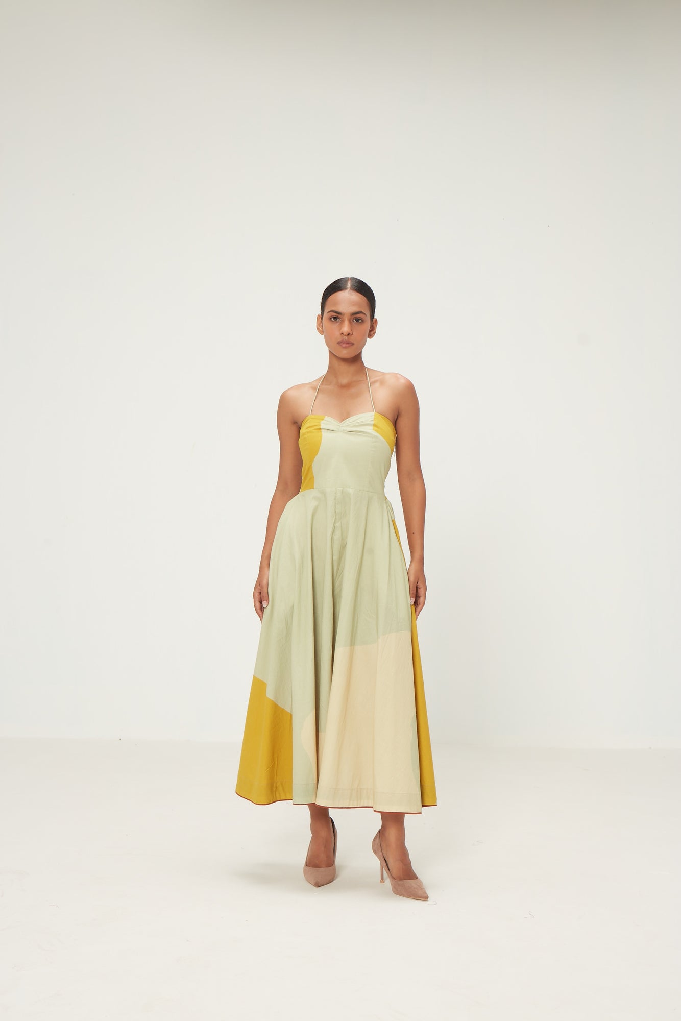 Pickle halter-neck midi dress is crafted in soft cotton poplin, it features a gentle abstract colour block in earthy yellow, muted green, and warm cream. The fitted bodice flows into a flared skirt, creating movement that feels light and easy - perfect for a sunlit day or a leisurely evening. Subtle detailing at the neckline and thoughtfully placed pockets for ease and everyday functionality, making this piece both comfortable and quietly striking. It has a zipper fastening.