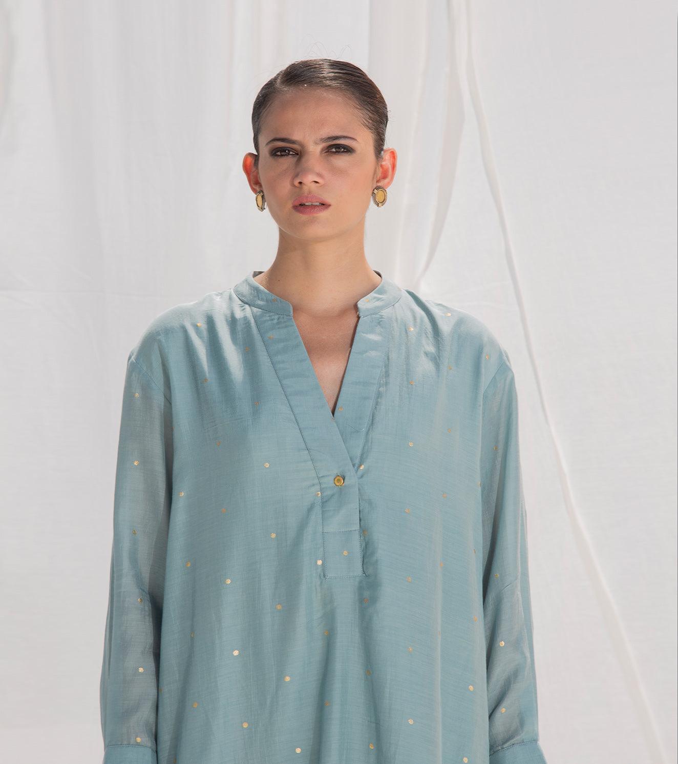 Festive staple, kurta and pencil pant set. The kurta is cut in a straight-fit and mid-length with a shawl collar, button-down placket, full and cuffed sleeves, a curved hemline and overall gold foil and gota detailing.
