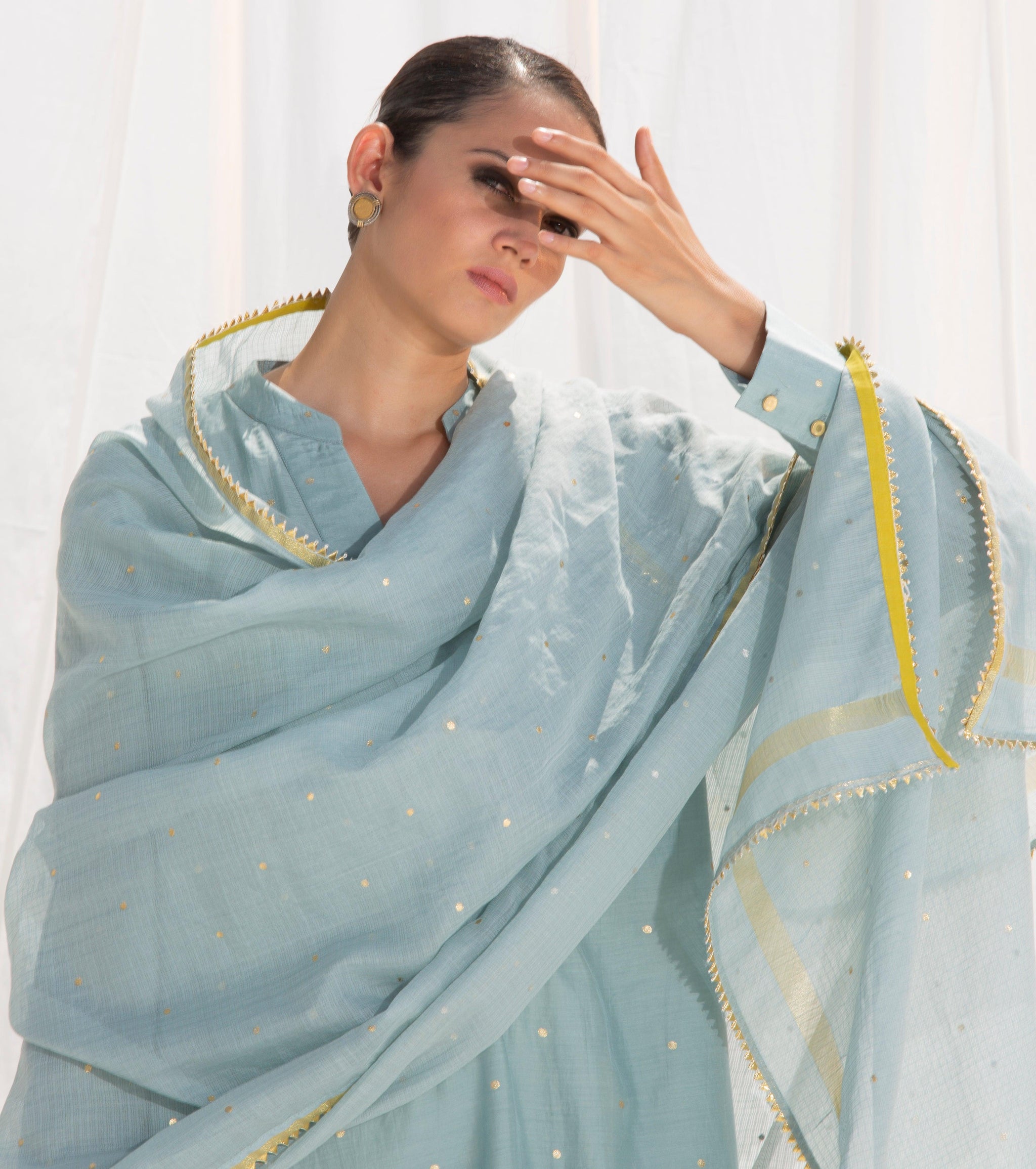 The dupatta comes with a kota doria border and overall gold foil polka print adding a pinch of color to this timeless piece.