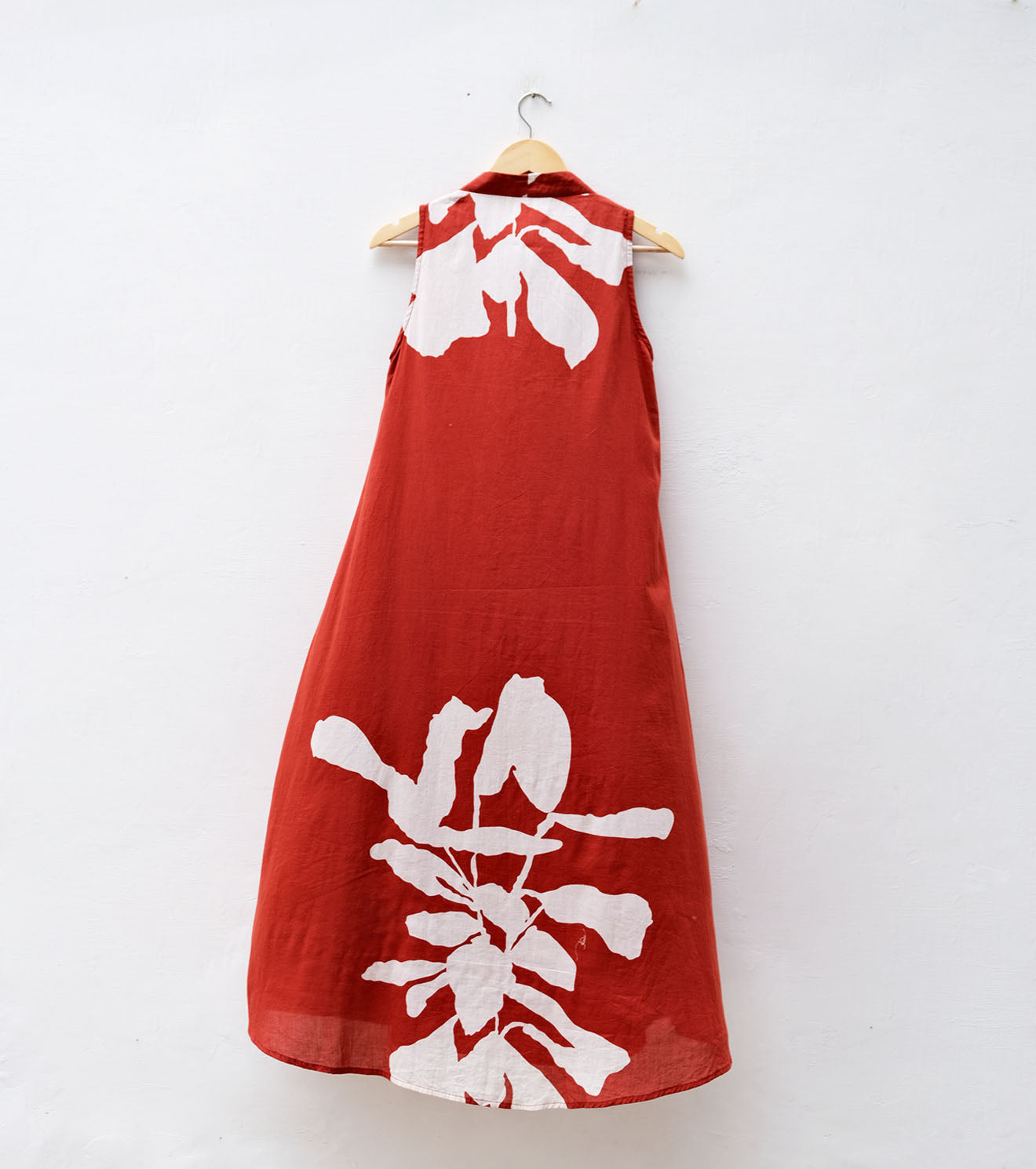 A brick red mul dress brought to life with delicate white abstract prints, inspired by organic forms found in nature. Flowing and effortless, it balances warmth with softness, making it perfect for easy spring days.
