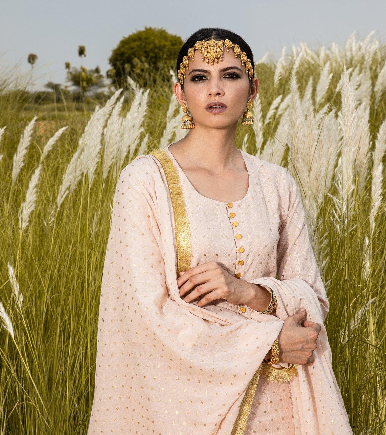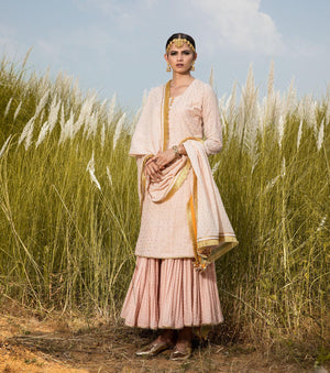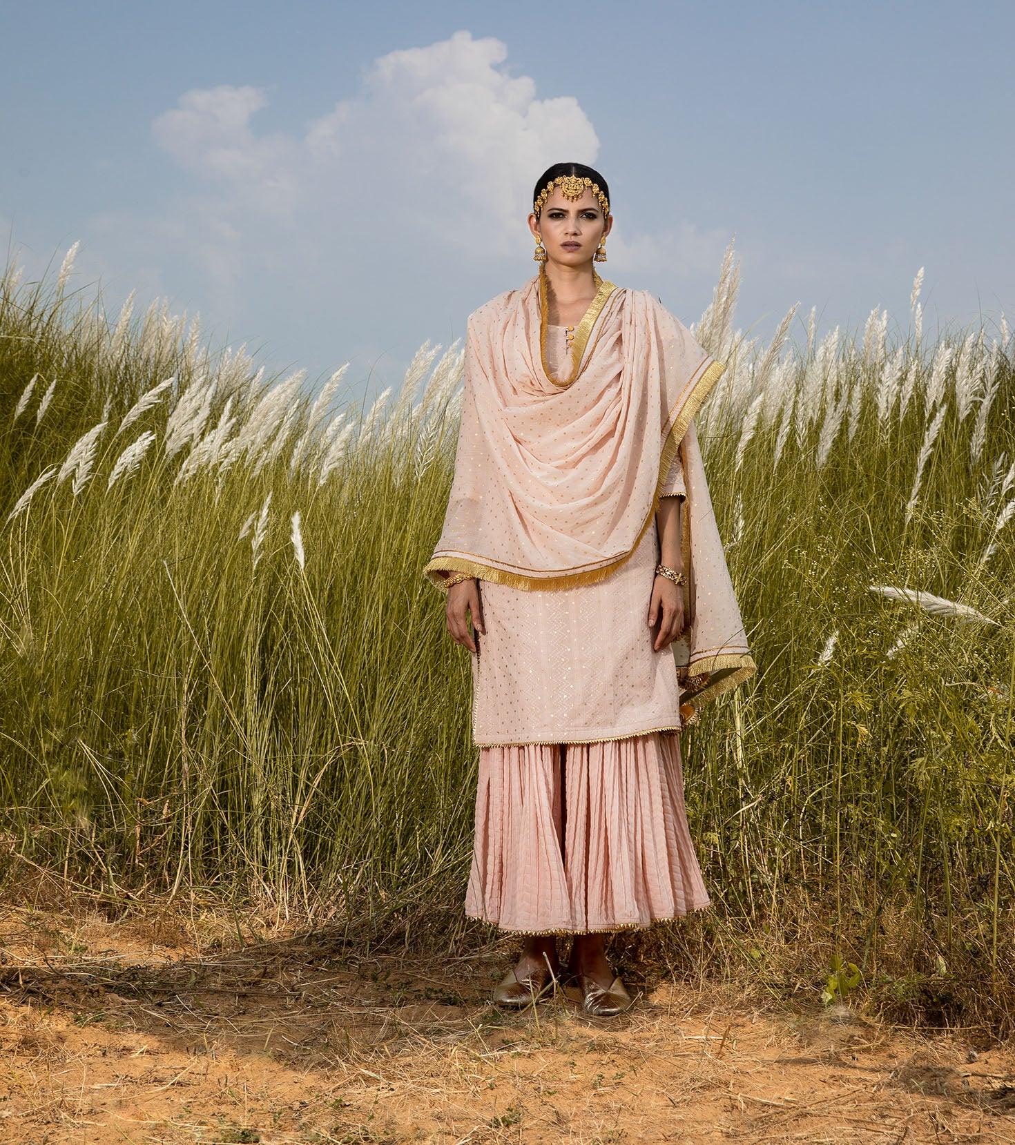 Blush odhni with delicate gota and fringe trims, contrasted by a green piping.