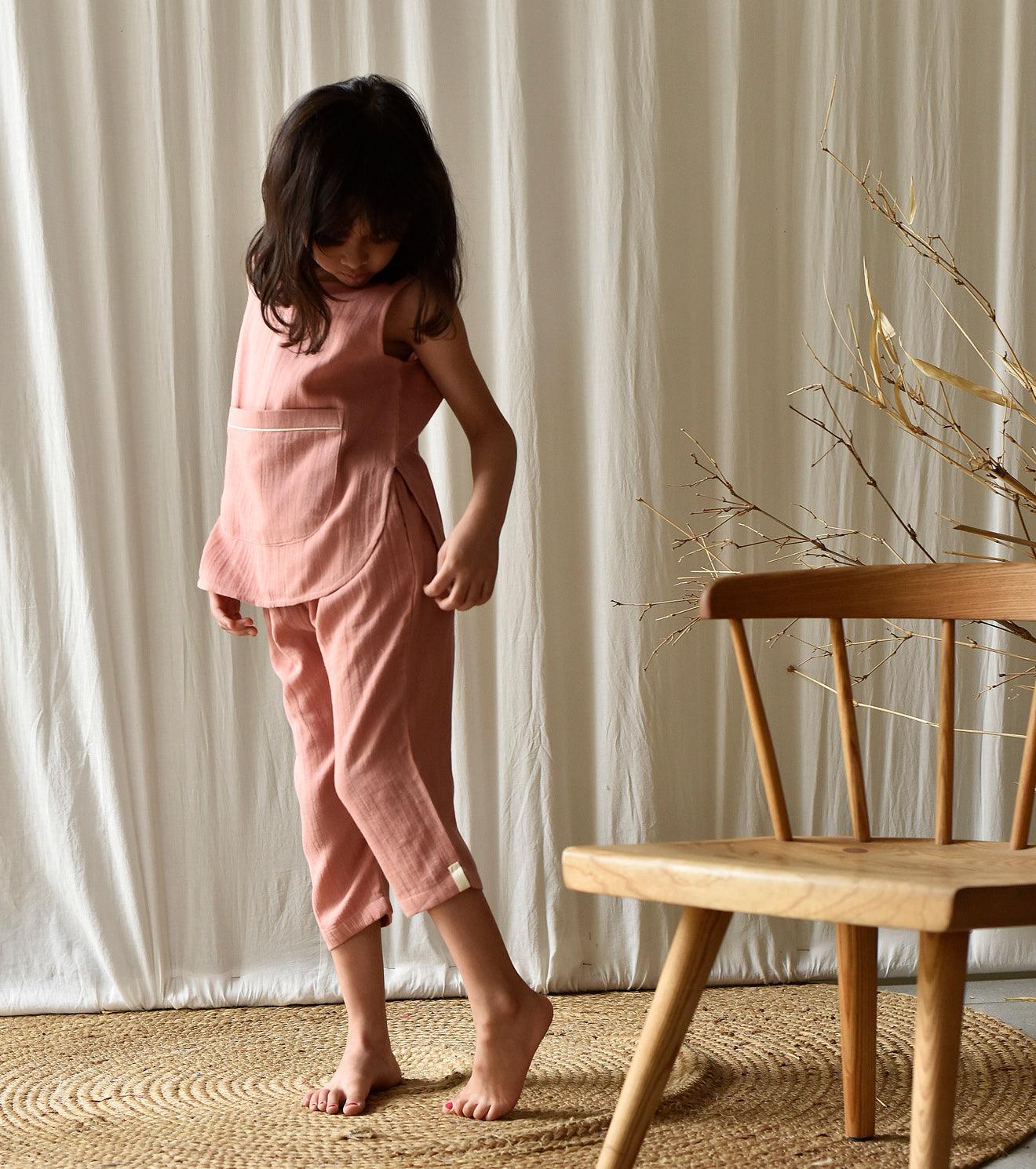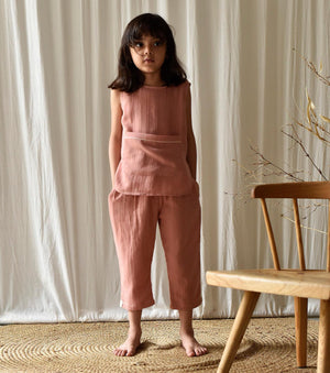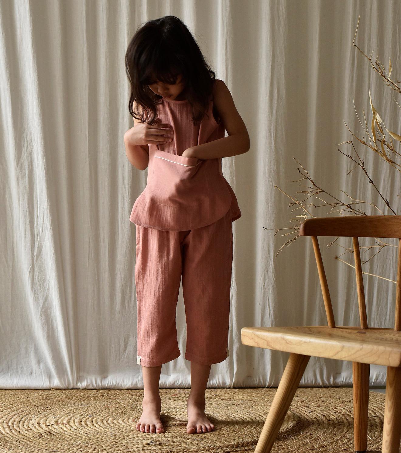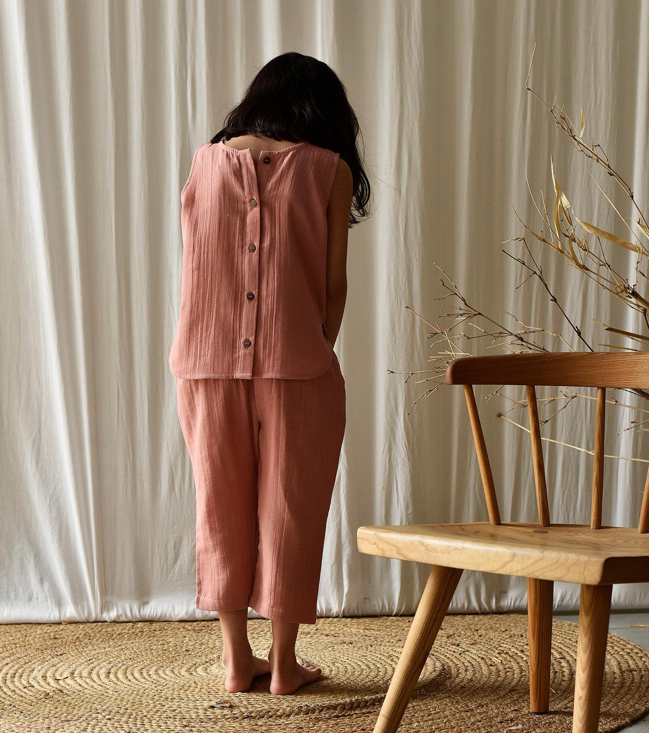 A rust pink sleeve less co-ord set with lower front big pocket, it comes with a pair of elasticated pants with side pockets.