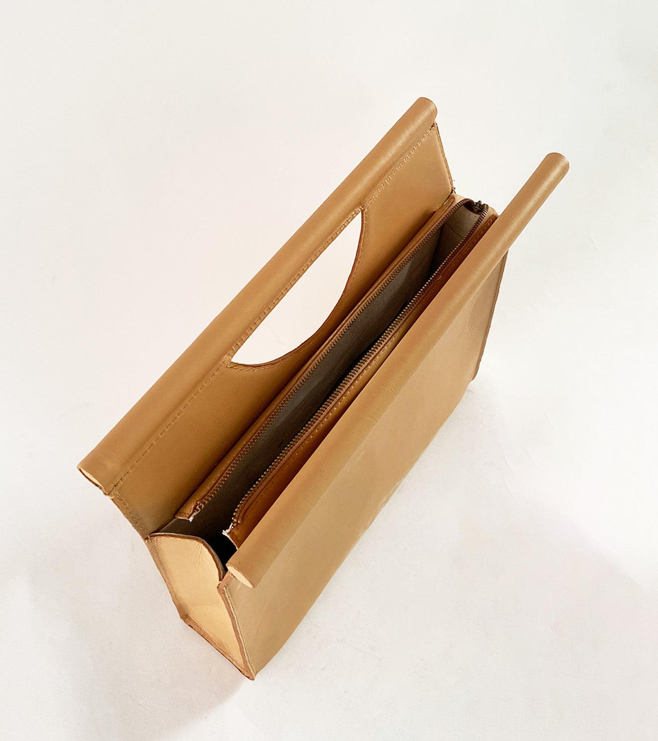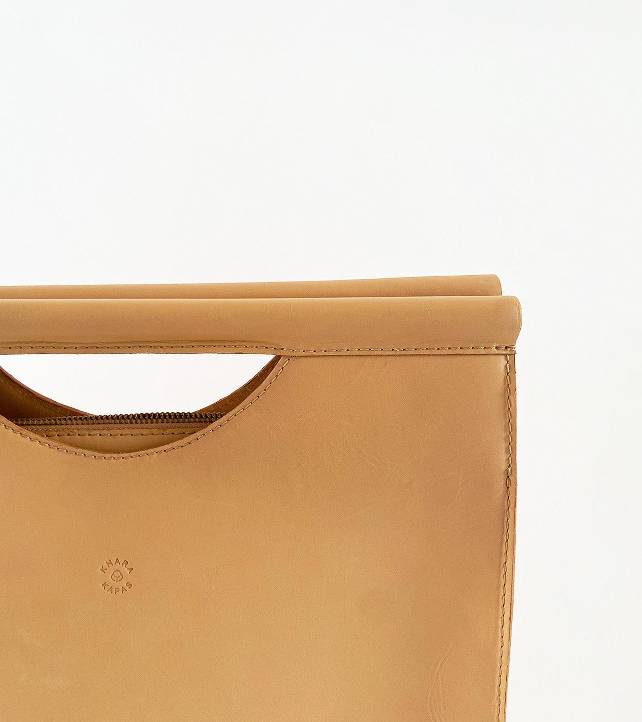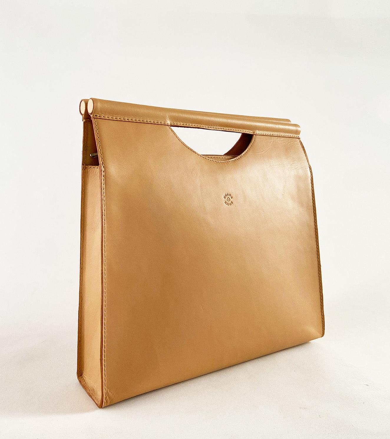Our skin coloured brief case is made with genuine leather that is responsibly sourced. Comes with a zipper opening, a zipper pocket inside, attached wooden handles and fully lined with 100% linen.