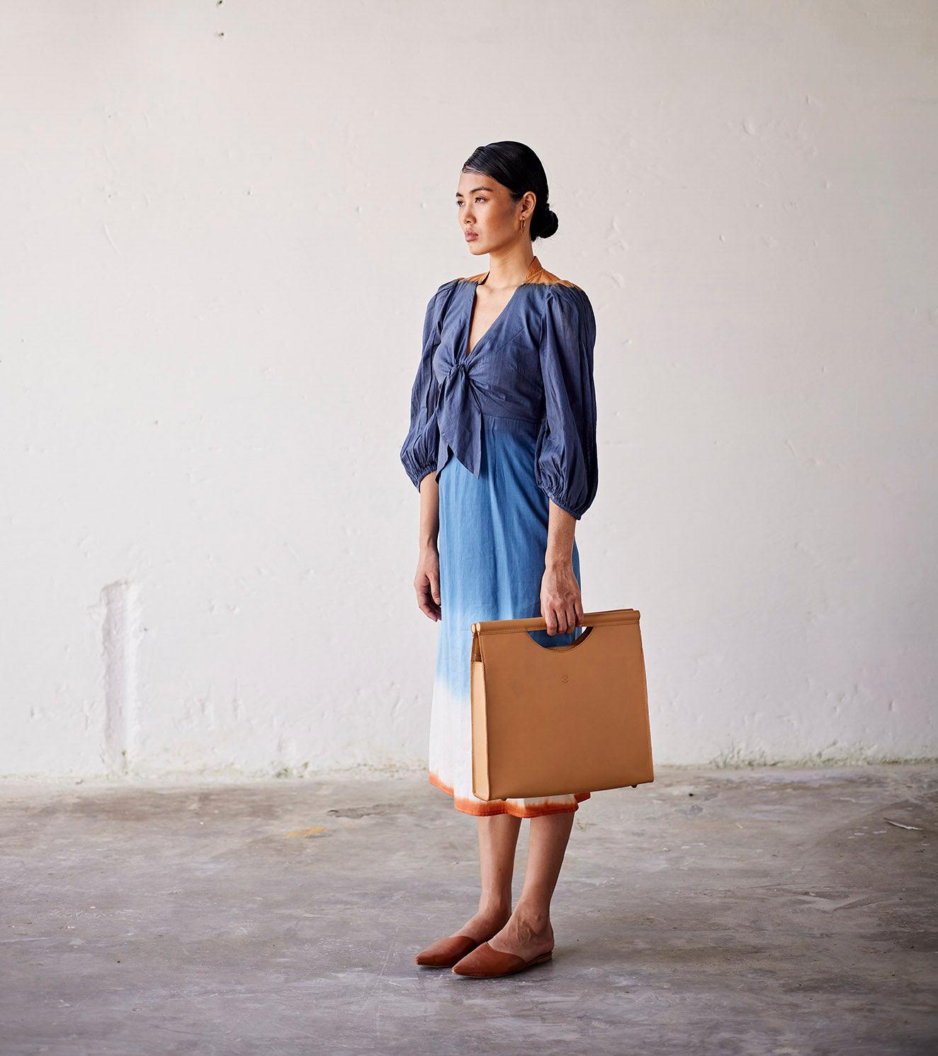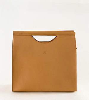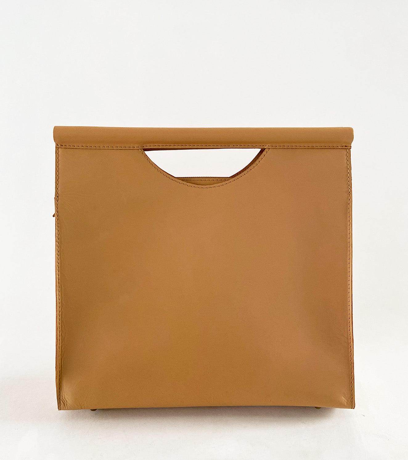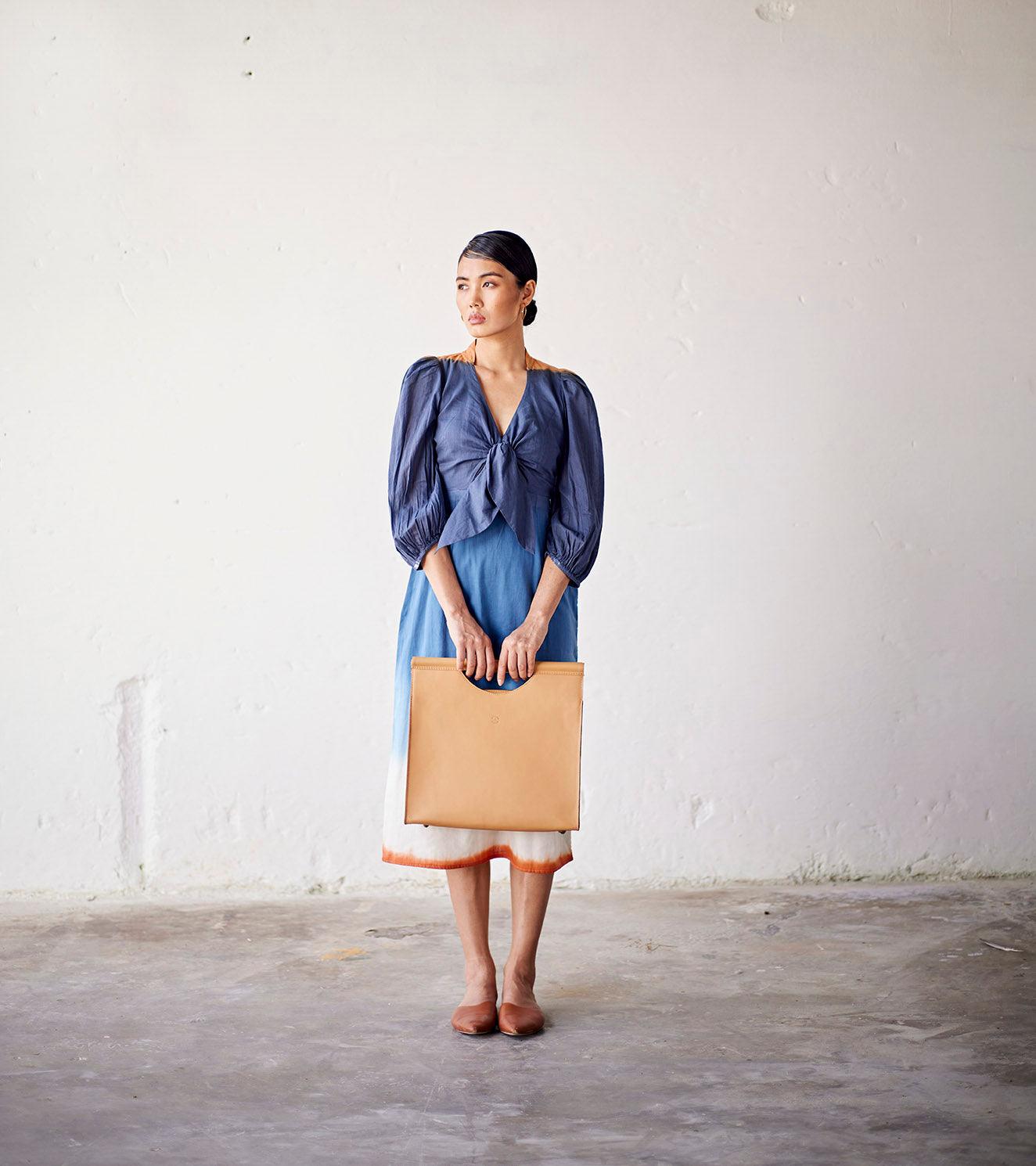Our skin coloured brief case is made with genuine leather that is responsibly sourced. Comes with a zipper opening, a zipper pocket inside, attached wooden handles and fully lined with 100% linen.