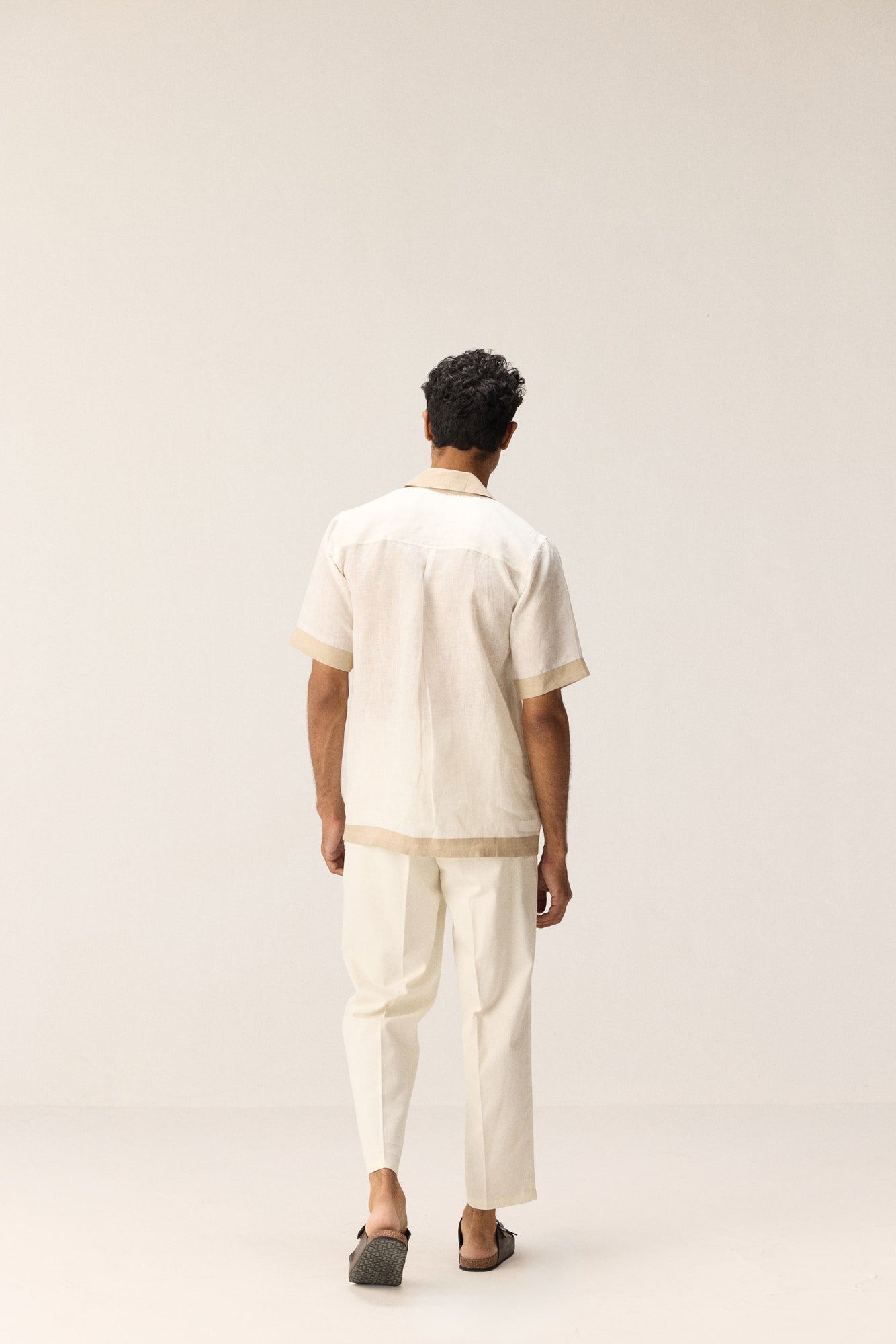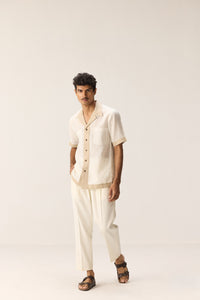 A crisp white linen shirt accented with elegant beige borders that make a subtle statement. Crafted for comfort and style, it balances classic simplicity with refined detailing