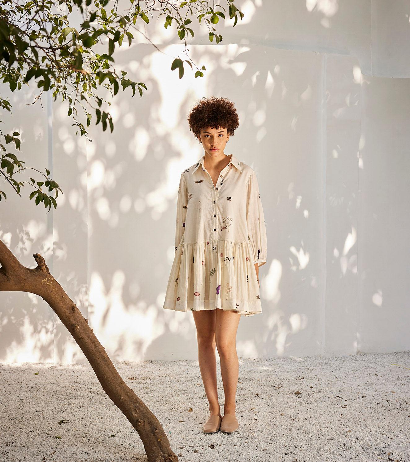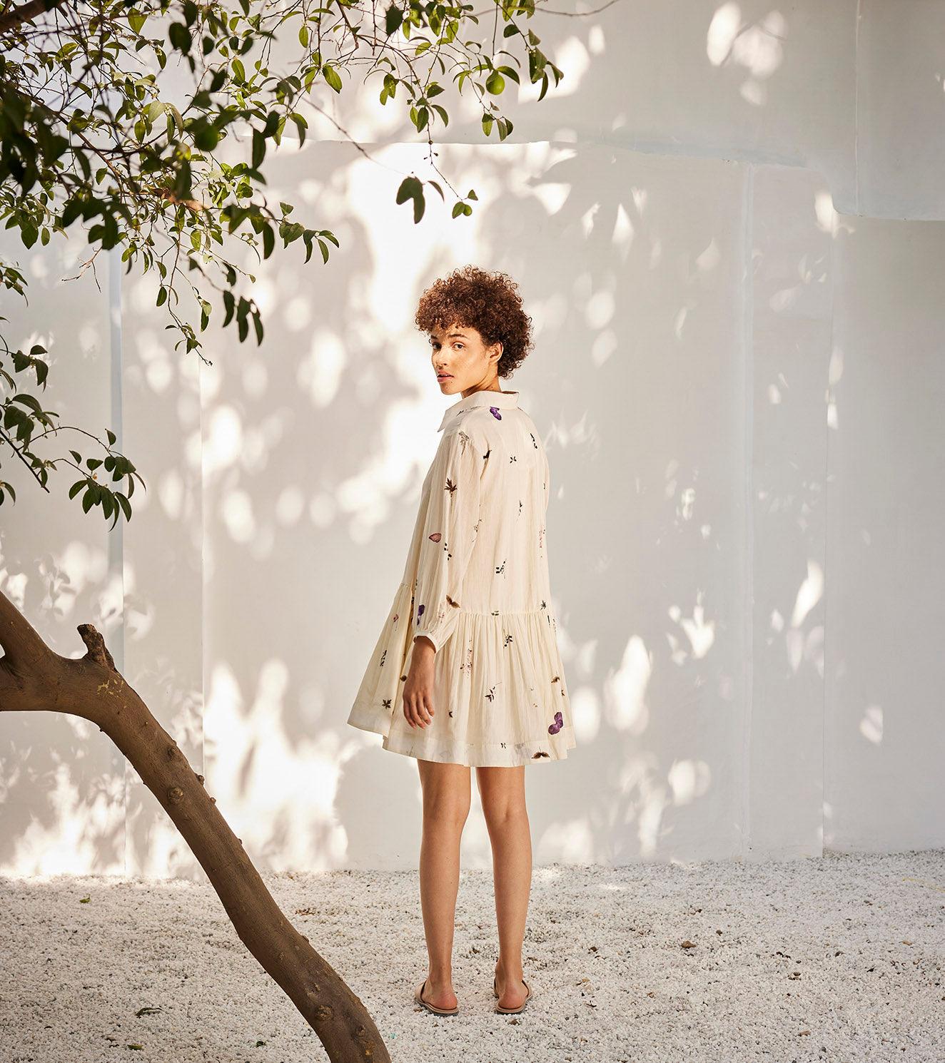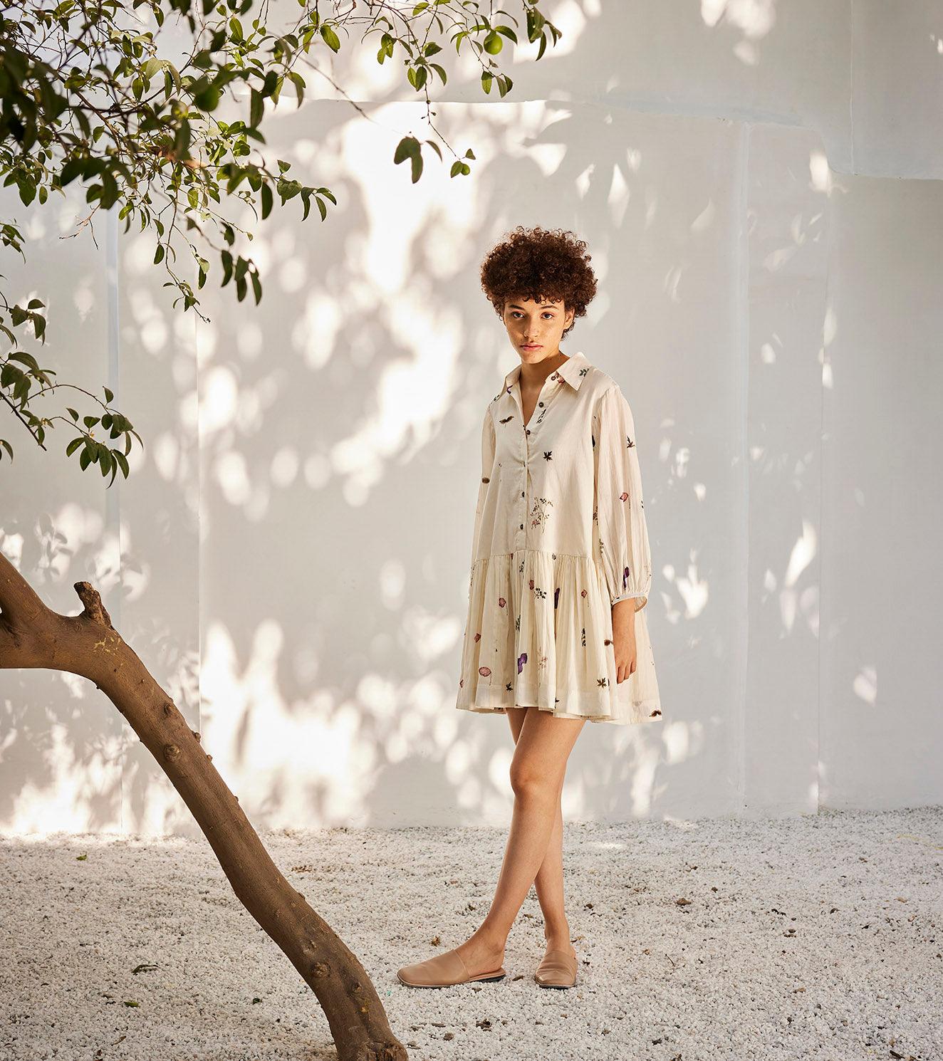 An off-white mulmul cotton dress with front button opening, a gathered tier and 3/4 sleeves.